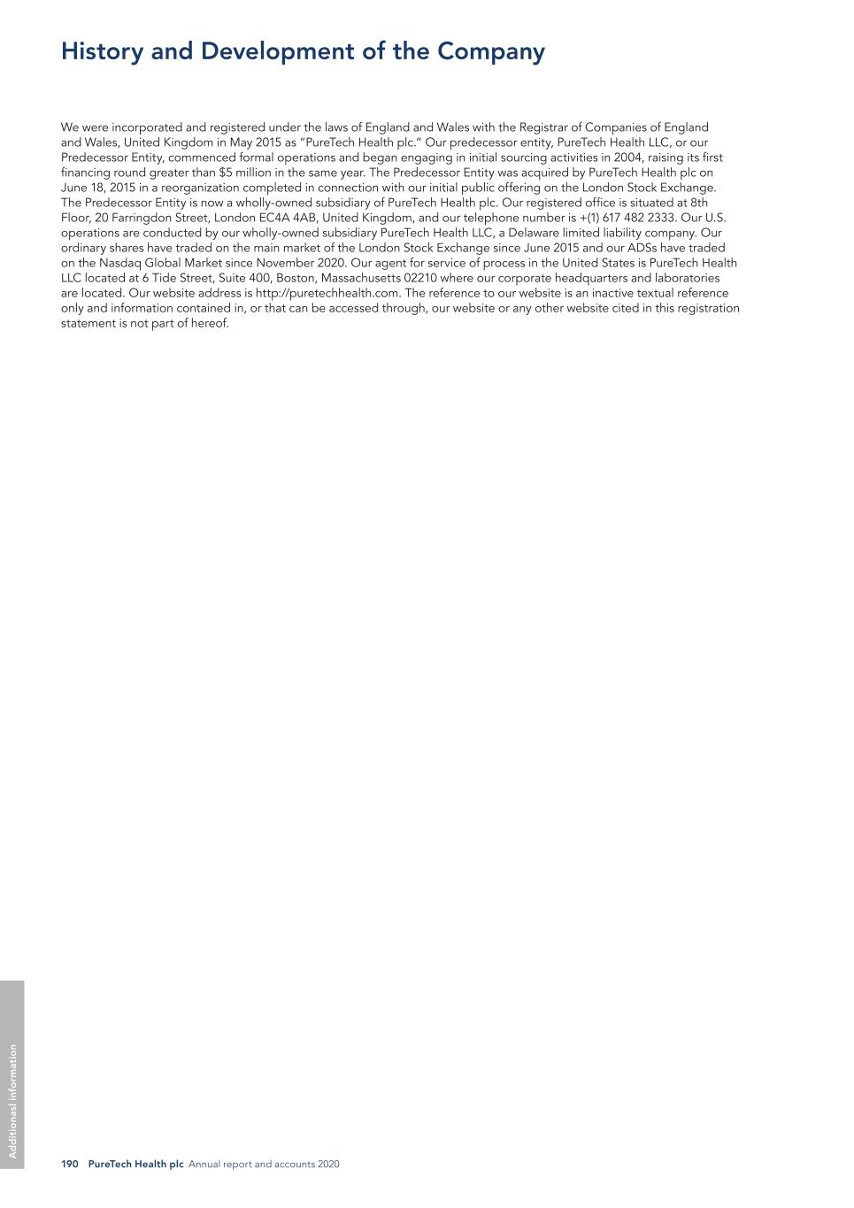 190 PureTech Health plc Annual report and accounts 2020 A d d it io n a sl i n fo rm a ti o n We were incorporated and registered under the laws of England and Wales with the Registrar of Companies of England and Wales, United Kingdom in May 2015 as “PureTech Health plc.” Our predecessor entity, PureTech Health LLC, or our Predecessor Entity, commenced formal operations and began engaging in initial sourcing activities in 2004, raising its first financing round greater than $5 million in the same year. The Predecessor Entity was acquired by PureTech Health plc on June 18, 2015 in a reorganization completed in connection with our initial public offering on the London Stock Exchange. The Predecessor Entity is now a wholly-owned subsidiary of PureTech Health plc. Our registered office is situated at 8th Floor, 20 Farringdon Street, London EC4A 4AB, United Kingdom, and our telephone number is +(1) 617 482 2333. Our U.S. operations are conducted by our wholly-owned subsidiary PureTech Health LLC, a Delaware limited liability company. Our ordinary shares have traded on the main market of the London Stock Exchange since June 2015 and our ADSs have traded on the Nasdaq Global Market since November 2020. Our agent for service of process in the United States is PureTech Health LLC located at 6 Tide Street, Suite 400, Boston, Massachusetts 02210 where our corporate headquarters and laboratories are located. Our website address is http://puretechhealth.com. The reference to our website is an inactive textual reference only and information contained in, or that can be accessed through, our website or any other website cited in this registration statement is not part of hereof. History and Development of the Company