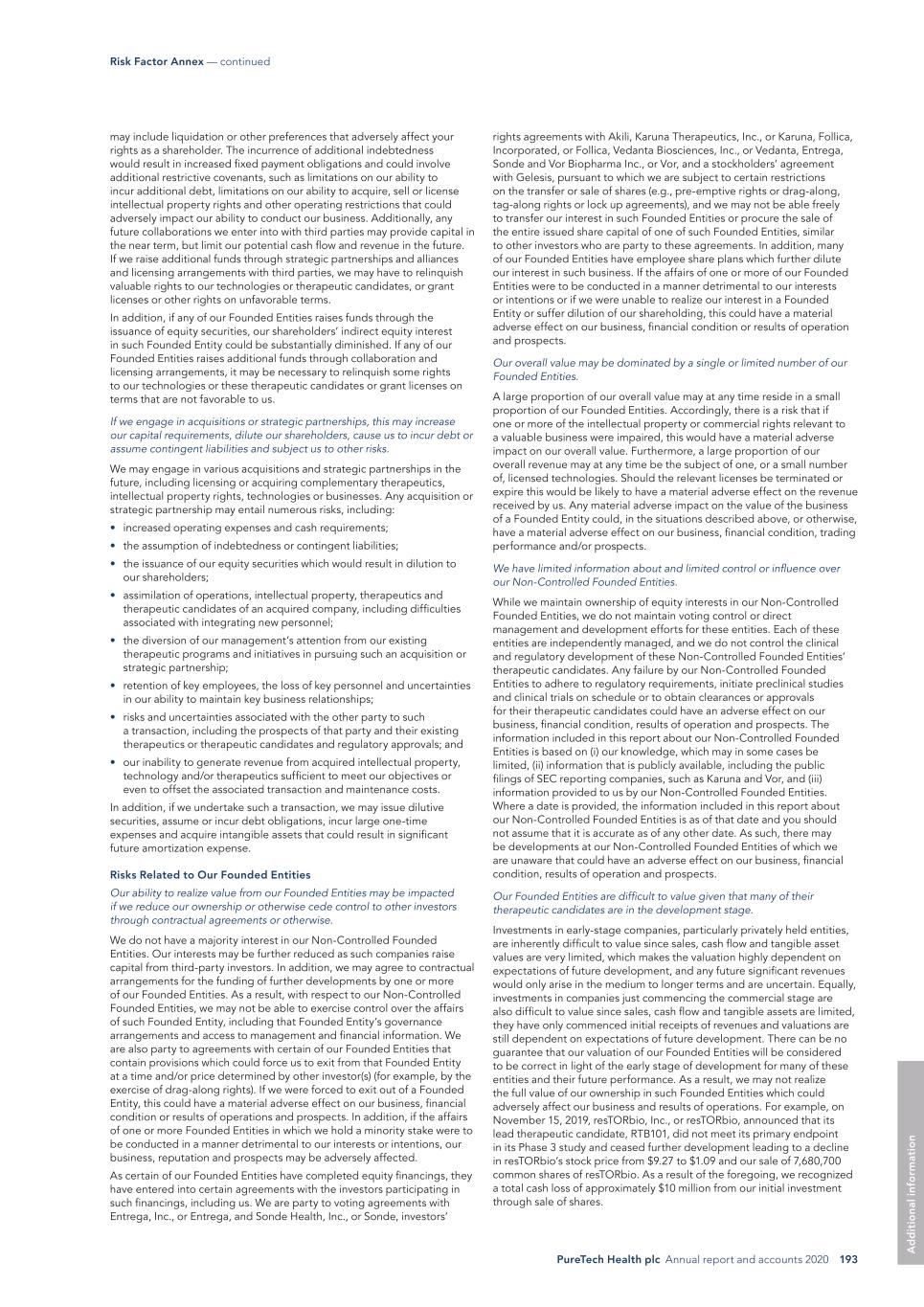 PureTech Health plc Annual report and accounts 2020 193 Risk Factor Annex — continued A d d it io n a l in fo rm a ti o n may include liquidation or other preferences that adversely affect your rights as a shareholder. The incurrence of additional indebtedness would result in increased fixed payment obligations and could involve additional restrictive covenants, such as limitations on our ability to incur additional debt, limitations on our ability to acquire, sell or license intellectual property rights and other operating restrictions that could adversely impact our ability to conduct our business. Additionally, any future collaborations we enter into with third parties may provide capital in the near term, but limit our potential cash flow and revenue in the future. If we raise additional funds through strategic partnerships and alliances and licensing arrangements with third parties, we may have to relinquish valuable rights to our technologies or therapeutic candidates, or grant licenses or other rights on unfavorable terms. In addition, if any of our Founded Entities raises funds through the issuance of equity securities, our shareholders’ indirect equity interest in such Founded Entity could be substantially diminished. If any of our Founded Entities raises additional funds through collaboration and licensing arrangements, it may be necessary to relinquish some rights to our technologies or these therapeutic candidates or grant licenses on terms that are not favorable to us. If we engage in acquisitions or strategic partnerships, this may increase our capital requirements, dilute our shareholders, cause us to incur debt or assume contingent liabilities and subject us to other risks. We may engage in various acquisitions and strategic partnerships in the future, including licensing or acquiring complementary therapeutics, intellectual property rights, technologies or businesses. Any acquisition or strategic partnership may entail numerous risks, including: • increased operating expenses and cash requirements; • the assumption of indebtedness or contingent liabilities; • the issuance of our equity securities which would result in dilution to our shareholders; • assimilation of operations, intellectual property, therapeutics and therapeutic candidates of an acquired company, including difficulties associated with integrating new personnel; • the diversion of our management’s attention from our existing therapeutic programs and initiatives in pursuing such an acquisition or strategic partnership; • retention of key employees, the loss of key personnel and uncertainties in our ability to maintain key business relationships; • risks and uncertainties associated with the other party to such a transaction, including the prospects of that party and their existing therapeutics or therapeutic candidates and regulatory approvals; and • our inability to generate revenue from acquired intellectual property, technology and/or therapeutics sufficient to meet our objectives or even to offset the associated transaction and maintenance costs. In addition, if we undertake such a transaction, we may issue dilutive securities, assume or incur debt obligations, incur large one-time expenses and acquire intangible assets that could result in significant future amortization expense. Risks Related to Our Founded Entities Our ability to realize value from our Founded Entities may be impacted if we reduce our ownership or otherwise cede control to other investors through contractual agreements or otherwise. We do not have a majority interest in our Non-Controlled Founded Entities. Our interests may be further reduced as such companies raise capital from third-party investors. In addition, we may agree to contractual arrangements for the funding of further developments by one or more of our Founded Entities. As a result, with respect to our Non-Controlled Founded Entities, we may not be able to exercise control over the affairs of such Founded Entity, including that Founded Entity’s governance arrangements and access to management and financial information. We are also party to agreements with certain of our Founded Entities that contain provisions which could force us to exit from that Founded Entity at a time and/or price determined by other investor(s) (for example, by the exercise of drag-along rights). If we were forced to exit out of a Founded Entity, this could have a material adverse effect on our business, financial condition or results of operations and prospects. In addition, if the affairs of one or more Founded Entities in which we hold a minority stake were to be conducted in a manner detrimental to our interests or intentions, our business, reputation and prospects may be adversely affected. As certain of our Founded Entities have completed equity financings, they have entered into certain agreements with the investors participating in such financings, including us. We are party to voting agreements with Entrega, Inc., or Entrega, and Sonde Health, Inc., or Sonde, investors’ rights agreements with Akili, Karuna Therapeutics, Inc., or Karuna, Follica, Incorporated, or Follica, Vedanta Biosciences, Inc., or Vedanta, Entrega, Sonde and Vor Biopharma Inc., or Vor, and a stockholders’ agreement with Gelesis, pursuant to which we are subject to certain restrictions on the transfer or sale of shares (e.g., pre-emptive rights or drag-along, tag-along rights or lock up agreements), and we may not be able freely to transfer our interest in such Founded Entities or procure the sale of the entire issued share capital of one of such Founded Entities, similar to other investors who are party to these agreements. In addition, many of our Founded Entities have employee share plans which further dilute our interest in such business. If the affairs of one or more of our Founded Entities were to be conducted in a manner detrimental to our interests or intentions or if we were unable to