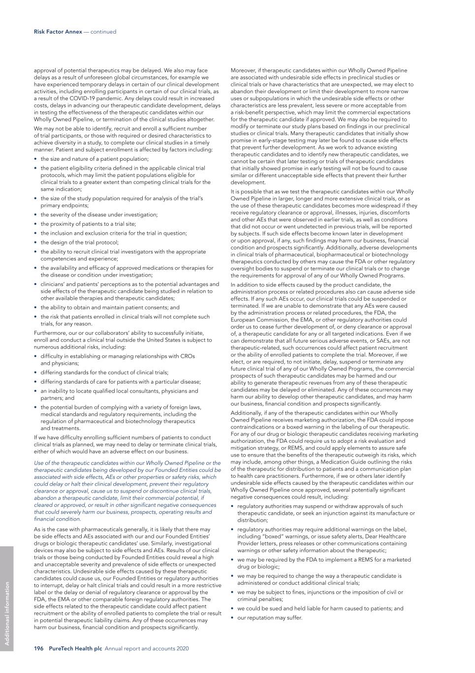 196 PureTech Health plc Annual report and accounts 2020 Risk Factor Annex — continued A d d it io n a sl i n fo rm a ti o n approval of potential therapeutics may be delayed. We also may face delays as a result of unforeseen global circumstances, for example we have experienced temporary delays in certain of our clinical development activities, including enrolling participants in certain of our clinical trials, as a result of the COVID-19 pandemic. Any delays could result in increased costs, delays in advancing our therapeutic candidate development, delays in testing the effectiveness of the therapeutic candidates within our Wholly Owned Pipeline, or termination of the clinical studies altogether. We may not be able to identify, recruit and enroll a sufficient number of trial participants, or those with required or desired characteristics to achieve diversity in a study, to complete our clinical studies in a timely manner. Patient and subject enrollment is affected by factors including: • the size and nature of a patient population; • the patient eligibility criteria defined in the applicable clinical trial protocols, which may limit the patient populations eligible for clinical trials to a greater extent than competing clinical trials for the same indication; • the size of the study population required for analysis of the trial’s primary endpoints; • the severity of the disease under investigation; • the proximity of patients to a trial site; • the inclusion and exclusion criteria for the trial in question; • the design of the trial protocol; • the ability to recruit clinical trial investigators with the appropriate competencies and experience; • the availability and efficacy of approved medications or therapies for the disease or condition under investigation; • clinicians’ and patients’ perceptions as to the potential advantages and side effects of the therapeutic candidate being studied in relation to other available therapies and therapeutic candidates; • the ability to obtain and maintain patient consents; and • the risk that patients enrolled in clinical trials will not complete such trials, for any reason. Furthermore, our or our collaborators’ ability to successfully initiate, enroll and conduct a clinical trial outside the United States is subject to numerous additional risks, including: • difficulty in establishing or managing relationships with CROs and physicians; • differing standards for the conduct of clinical trials; • differing standards of care for patients with a particular disease; • an inability to locate qualified local consultants, physicians and partners; and • the potential burden of complying with a variety of foreign laws, medical standards and regulatory requirements, including the regulation of pharmaceutical and biotechnology therapeutics and treatments. If we have difficulty enrolling sufficient numbers of patients to conduct clinical trials as planned, we may need to delay or terminate clinical trials, either of which would have an adverse effect on our business. Use of the therapeutic candidates within our Wholly Owned Pipeline or the therapeutic candidates being developed by our Founded Entities could be associated with side effects, AEs or other properties or safety risks, which could delay or halt their clinical development, prevent their regulatory clearance or approval, cause us to suspend or discontinue clinical trials, abandon a therapeutic candidate, limit their commercial potential, if cleared or approved, or result in other significant negative consequences that could severely harm our business, prospects, operating results and financial condition. As is the case with pharmaceuticals generally, it is likely that there may be side effects and AEs associated with our and our Founded Entities’ drugs or biologic therapeutic candidates’ use. Similarly, investigational devices may also be subject to side effects and AEs. Results of our clinical trials or those being conducted by Founded Entities could reveal a high and unacceptable severity and prevalence of side effects or unexpected characteristics. Undesirable side effects caused by these therapeutic candidates could cause us, our Founded Entities or regulatory authorities to interrupt, delay or halt clinical trials and could result in a more restrictive label or the delay or denial of regulatory clearance or approval by the FDA, the EMA or other comparable foreign regulatory authorities. The side effects related to the therapeutic candidate could affect patient recruitment or the ability of enrolled patients to complete the trial or result in potential therapeutic liability claims. Any of these occurrences may harm our business, financial condition and prospects significantly. Moreover, if therapeutic candidates within our Wholly Owned Pipeline are associated with undesirable side effects in preclinical studies or clinical trials or have characteristics that are unexpected, we may elect to abandon their development or limit their development to more narrow uses or subpopulations in which the undesirable side effects or other characteristics are less prevalent, less severe or more acceptable from a risk-benefit perspective, which may limit the commercial expectations for the therapeutic candidate if approved. We may also be required to modify or terminate our study plans based on findings in our preclinical studies or clinical trials. Many therapeutic candidates that initially show promise in early-stage testing may later be found to cause side effects that prevent further development. As we work to advance existing therapeutic candidates and to identify new therapeutic candidates, we cannot be certain that later testing or trials of therapeutic candidates that initially showed promise in early testing will not be found to cause similar or different unacceptable side effects that prevent their further development. It is possible that as we test the t