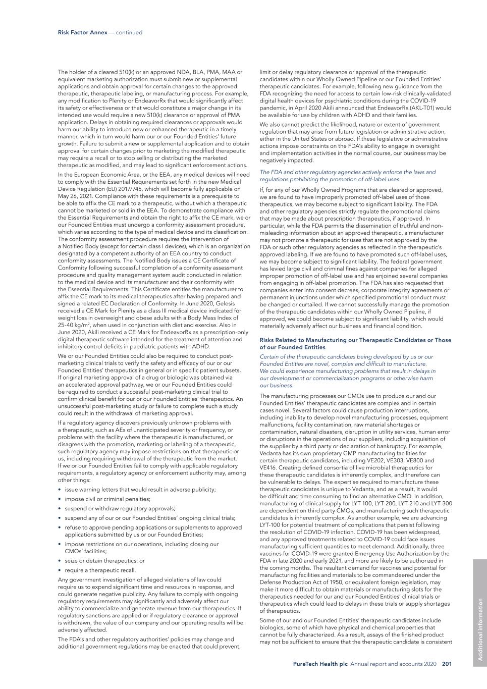 PureTech Health plc Annual report and accounts 2020 201 Risk Factor Annex — continued A d d it io n a l in fo rm a ti o n The holder of a cleared 510(k) or an approved NDA, BLA, PMA, MAA or equivalent marketing authorization must submit new or supplemental applications and obtain approval for certain changes to the approved therapeutic, therapeutic labeling, or manufacturing process. For example, any modification to Plenity or EndeavorRx that would significantly affect its safety or effectiveness or that would constitute a major change in its intended use would require a new 510(k) clearance or approval of PMA application. Delays in obtaining required clearances or approvals would harm our ability to introduce new or enhanced therapeutic in a timely manner, which in turn would harm our or our Founded Entities’ future growth. Failure to submit a new or supplemental application and to obtain approval for certain changes prior to marketing the modified therapeutic may require a recall or to stop selling or distributing the marketed therapeutic as modified, and may lead to significant enforcement actions. In the European Economic Area, or the EEA, any medical devices will need to comply with the Essential Requirements set forth in the new Medical Device Regulation (EU) 2017/745, which will become fully applicable on May 26, 2021. Compliance with these requirements is a prerequisite to be able to affix the CE mark to a therapeutic, without which a therapeutic cannot be marketed or sold in the EEA. To demonstrate compliance with the Essential Requirements and obtain the right to affix the CE mark, we or our Founded Entities must undergo a conformity assessment procedure, which varies according to the type of medical device and its classification. The conformity assessment procedure requires the intervention of a Notified Body (except for certain class I devices), which is an organization designated by a competent authority of an EEA country to conduct conformity assessments. The Notified Body issues a CE Certificate of Conformity following successful completion of a conformity assessment procedure and quality management system audit conducted in relation to the medical device and its manufacturer and their conformity with the Essential Requirements. This Certificate entitles the manufacturer to affix the CE mark to its medical therapeutics after having prepared and signed a related EC Declaration of Conformity. In June 2020, Gelesis received a CE Mark for Plenity as a class III medical device indicated for weight loss in overweight and obese adults with a Body Mass Index of 25-40 kg/m2, when used in conjunction with diet and exercise. Also in June 2020, Akili received a CE Mark for EndeavorRx as a prescription-only digital therapeutic software intended for the treatment of attention and inhibitory control deficits in paediatric patients with ADHD. We or our Founded Entities could also be required to conduct post- marketing clinical trials to verify the safety and efficacy of our or our Founded Entities’ therapeutics in general or in specific patient subsets. If original marketing approval of a drug or biologic was obtained via an accelerated approval pathway, we or our Founded Entities could be required to conduct a successful post-marketing clinical trial to confirm clinical benefit for our or our Founded Entities’ therapeutics. An unsuccessful post-marketing study or failure to complete such a study could result in the withdrawal of marketing approval. If a regulatory agency discovers previously unknown problems with a therapeutic, such as AEs of unanticipated severity or frequency, or problems with the facility where the therapeutic is manufactured, or disagrees with the promotion, marketing or labeling of a therapeutic, such regulatory agency may impose restrictions on that therapeutic or us, including requiring withdrawal of the therapeutic from the market. If we or our Founded Entities fail to comply with applicable regulatory requirements, a regulatory agency or enforcement authority may, among other things: • issue warning letters that would result in adverse publicity; • impose civil or criminal penalties; • suspend or withdraw regulatory approvals; • suspend any of our or our Founded Entities’ ongoing clinical trials; • refuse to approve pending applications or supplements to approved applications submitted by us or our Founded Entities; • impose restrictions on our operations, including closing our CMOs’ facilities; • seize or detain therapeutics; or • require a therapeutic recall. Any government investigation of alleged violations of law could require us to expend significant time and resources in response, and could generate negative publicity. Any failure to comply with ongoing regulatory requirements may significantly and adversely affect our ability to commercialize and generate revenue from our therapeutics. If regulatory sanctions are applied or if regulatory clearance or approval is withdrawn, the value of our company and our operating results will be adversely affected. The FDA’s and other regulatory authorities’ policies may change and additional government regulations may be enacted that could prevent, limit or delay regulatory clearance or approval of the therapeutic candidates within our Wholly Owned Pipeline or our Founded Entities’ therapeutic candidates. For example, following new guidance from the FDA recognizing the need for access to certain low-risk clinically-validated digital health devices for psychiatric conditions during the COVID-19 pandemic, in April 2020 Akili announced that EndeavorRx (AKL-T01) would be available for use by children with ADHD and their families. We also cannot predict the likelihood, nature or extent of government regulation that may arise from future legislation or administrative action, either in the United States or abroad. If these legislative or administrative actions impose constraints on the FDA