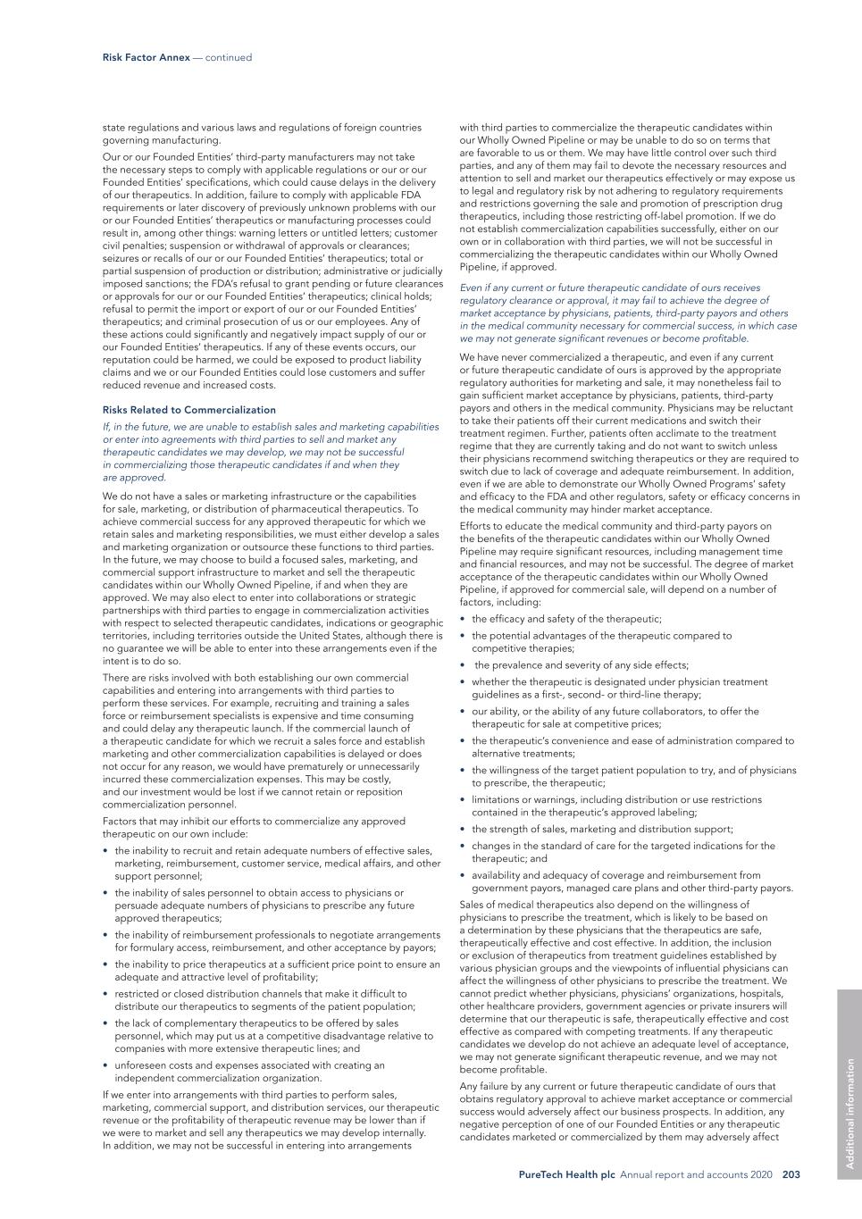 PureTech Health plc Annual report and accounts 2020 203 Risk Factor Annex — continued A d d it io n a l in fo rm a ti o n state regulations and various laws and regulations of foreign countries governing manufacturing. Our or our Founded Entities’ third-party manufacturers may not take the necessary steps to comply with applicable regulations or our or our Founded Entities’ specifications, which could cause delays in the delivery of our therapeutics. In addition, failure to comply with applicable FDA requirements or later discovery of previously unknown problems with our or our Founded Entities’ therapeutics or manufacturing processes could result in, among other things: warning letters or untitled letters; customer civil penalties; suspension or withdrawal of approvals or clearances; seizures or recalls of our or our Founded Entities’ therapeutics; total or partial suspension of production or distribution; administrative or judicially imposed sanctions; the FDA’s refusal to grant pending or future clearances or approvals for our or our Founded Entities’ therapeutics; clinical holds; refusal to permit the import or export of our or our Founded Entities’ therapeutics; and criminal prosecution of us or our employees. Any of these actions could significantly and negatively impact supply of our or our Founded Entities’ therapeutics. If any of these events occurs, our reputation could be harmed, we could be exposed to product liability claims and we or our Founded Entities could lose customers and suffer reduced revenue and increased costs. Risks Related to Commercialization If, in the future, we are unable to establish sales and marketing capabilities or enter into agreements with third parties to sell and market any therapeutic candidates we may develop, we may not be successful in commercializing those therapeutic candidates if and when they are approved. We do not have a sales or marketing infrastructure or the capabilities for sale, marketing, or distribution of pharmaceutical therapeutics. To achieve commercial success for any approved therapeutic for which we retain sales and marketing responsibilities, we must either develop a sales and marketing organization or outsource these functions to third parties. In the future, we may choose to build a focused sales, marketing, and commercial support infrastructure to market and sell the therapeutic candidates within our Wholly Owned Pipeline, if and when they are approved. We may also elect to enter into collaborations or strategic partnerships with third parties to engage in commercialization activities with respect to selected therapeutic candidates, indications or geographic territories, including territories outside the United States, although there is no guarantee we will be able to enter into these arrangements even if the intent is to do so. There are risks involved with both establishing our own commercial capabilities and entering into arrangements with third parties to perform these services. For example, recruiting and training a sales force or reimbursement specialists is expensive and time consuming and could delay any therapeutic launch. If the commercial launch of a therapeutic candidate for which we recruit a sales force and establish marketing and other commercialization capabilities is delayed or does not occur for any reason, we would have prematurely or unnecessarily incurred these commercialization expenses. This may be costly, and our investment would be lost if we cannot retain or reposition commercialization personnel. Factors that may inhibit our efforts to commercialize any approved therapeutic on our own include: • the inability to recruit and retain adequate numbers of effective sales, marketing, reimbursement, customer service, medical affairs, and other support personnel; • the inability of sales personnel to obtain access to physicians or persuade adequate numbers of physicians to prescribe any future approved therapeutics; • the inability of reimbursement professionals to negotiate arrangements for formulary access, reimbursement, and other acceptance by payors; • the inability to price therapeutics at a sufficient price point to ensure an adequate and attractive level of profitability; • restricted or closed distribution channels that make it difficult to distribute our therapeutics to segments of the patient population; • the lack of complementary therapeutics to be offered by sales personnel, which may put us at a competitive disadvantage relative to companies with more extensive therapeutic lines; and • unforeseen costs and expenses associated with creating an independent commercialization organization. If we enter into arrangements with third parties to perform sales, marketing, commercial support, and distribution services, our therapeutic revenue or the profitability of therapeutic revenue may be lower than if we were to market and sell any therapeutics we may develop internally. In addition, we may not be successful in entering into arrangements with third parties to commercialize the therapeutic candidates within our Wholly Owned Pipeline or may be unable to do so on terms that are favorable to us or them. We may have little control over such third parties, and any of them may fail to devote the necessary resources and attention to sell and market our therapeutics effectively or may expose us to legal and regulatory risk by not adhering to regulatory requirements and restrictions governing the sale and promotion of prescription drug therapeutics, including those restricting off-label promotion. If we do not establish commercialization capabilities successfully, either on our own or in collaboration with third parties, we will not be successful in commercializing the therapeutic candidates within our Wholly Owned Pipeline, if approved. Even if any current or future therapeutic candidate of ours receives regulatory clearance or approval, it may fail to achieve the degree 