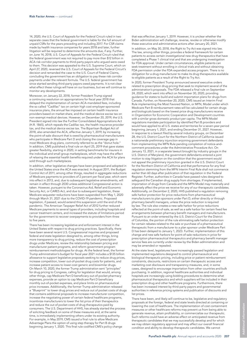 PureTech Health plc Annual report and accounts 2020 207 Risk Factor Annex — continued A d d it io n a l in fo rm a ti o n 14, 2020, the U.S. Court of Appeals for the Federal Circuit ruled in two separate cases that the federal government is liable for the full amount of unpaid CSRs for the years preceding and including 2017. For CSR claims made by health insurance companies for years 2018 and later, further litigation will be required to determine the amounts due, if any. Further, on June 14, 2018, U.S. Court of Appeals for the Federal Circuit ruled that the federal government was not required to pay more than $12 billion in ACA risk corridor payments to third-party payors who argued were owed to them. This decision was appealed to the U.S. Supreme Court, which on April 27, 2020, reversed the U.S. Court of Appeals for the Federal Circuit’s decision and remanded the case to the U.S. Court of Federal Claims, concluding the government has an obligation to pay these risk corridor payments under the relevant formula. The U.S. federal government has since started sending third-party payors owed payments. It is not clear what effect these rulings will have on our business, but we will continue to monitor any developments. Moreover, on January 22, 2018, former President Trump signed a continuing resolution on appropriations for fiscal year 2018 that delayed the implementation of certain ACA-mandated fees, including the so called “Cadillac” tax on certain high cost employer-sponsored insurance plans, the annual fee imposed on certain health insurance providers based on market share, and the medical device excise tax on non-exempt medical devices. However, on December 20, 2019, the U.S. President signed into law the Further Consolidated Appropriations Act (H.R. 1865), which repeals the Cadillac tax, the health insurance provider tax, and the medical device excise tax. The Bipartisan Budget Act of 2018, also amended the ACA, effective January 1, 2019, by increasing the point-of-sale discount that is owed by pharmaceutical manufacturers who participate in Medicare Part D and closing the coverage gap in most Medicare drug plans, commonly referred to as the “donut hole.” In addition, CMS published a final rule on April 25, 2019 that gave states greater flexibility, starting in 2020, in setting benchmarks for insurers in the individual and small group marketplaces, which may have the effect of relaxing the essential health benefits required under the ACA for plans sold through such marketplaces. In addition, other legislative changes have been proposed and adopted in the United States since the ACA was enacted. In August 2011, the Budget Control Act of 2011, among other things, resulted in aggregate reductions of Medicare payments to providers of 2 percent per fiscal year, which went into effect in 2013, and, due to subsequent legislative amendments, will remain in effect through 2030 unless additional Congressional action is taken. However, pursuant to the Coronavirus Aid, Relief and Economic Security Act, or CARES Act, and due to subsequent legislation, these Medicare sequester reductions have been suspended from May 1, 2020 through March 31, 2021 due to the COVID-19 pandemic. Proposed legislation, if passed, would extend this suspension until the end of the pandemic. The American Taxpayer Relief Act of 2012 further reduced Medicare payments to several types of providers, including hospitals and cancer treatment centers, and increased the statute of limitations period for the government to recover overpayments to providers from three to five years. There has been increasing legislative and enforcement interest in the United States with respect to drug pricing practices. Specifically, there have been several recent U.S. Congressional inquiries and proposed federal and state legislation designed to, among other things, bring more transparency to drug pricing, reduce the cost of prescription drugs under Medicare, review the relationship between pricing and manufacturer patient programs, and reform government program reimbursement methodologies for drugs. At the federal level, the former Trump administration’s budget for fiscal year 2021 includes a $135 billion allowance to support legislative proposals seeking to reduce drug prices, increase competition, lower out-of-pocket drug costs for patients, and increase patient access to lower-cost generic and biosimilar drugs. On March 10, 2020, the former Trump administration sent “principles” for drug pricing to Congress, calling for legislation that would, among other things, cap Medicare Part D beneficiary out-of-pocket pharmacy expenses, provide an option to cap Medicare Part D beneficiary monthly out-of-pocket expenses, and place limits on pharmaceutical price increases. Additionally, the former Trump administration released a “Blueprint” to lower drug prices and reduce out of pocket costs of drugs that contains additional proposals to increase manufacturer competition, increase the negotiating power of certain federal healthcare programs, incentivize manufacturers to lower the list price of their therapeutics and reduce the out of pocket costs of drug therapeutics paid by consumers. The U.S. Department of HHS, has already started the process of soliciting feedback on some of these measures and, at the same time, is immediately implementing others under its existing authority. For example, in May 2019, CMS issued a final rule to allow Medicare Advantage Plans the option of using step therapy for Part B drugs beginning January 1, 2020. This final rule codified CMS’s policy change that was effective January 1, 2019. However, it is unclear whether the Biden administration will challenge, reverse, revoke or otherwise modify these executive and administrative actions after January 20, 2021. In addition, on May 30, 2018, the Right to Try Act was signed into law. The law, among other things, provides a federal framework for certain patien