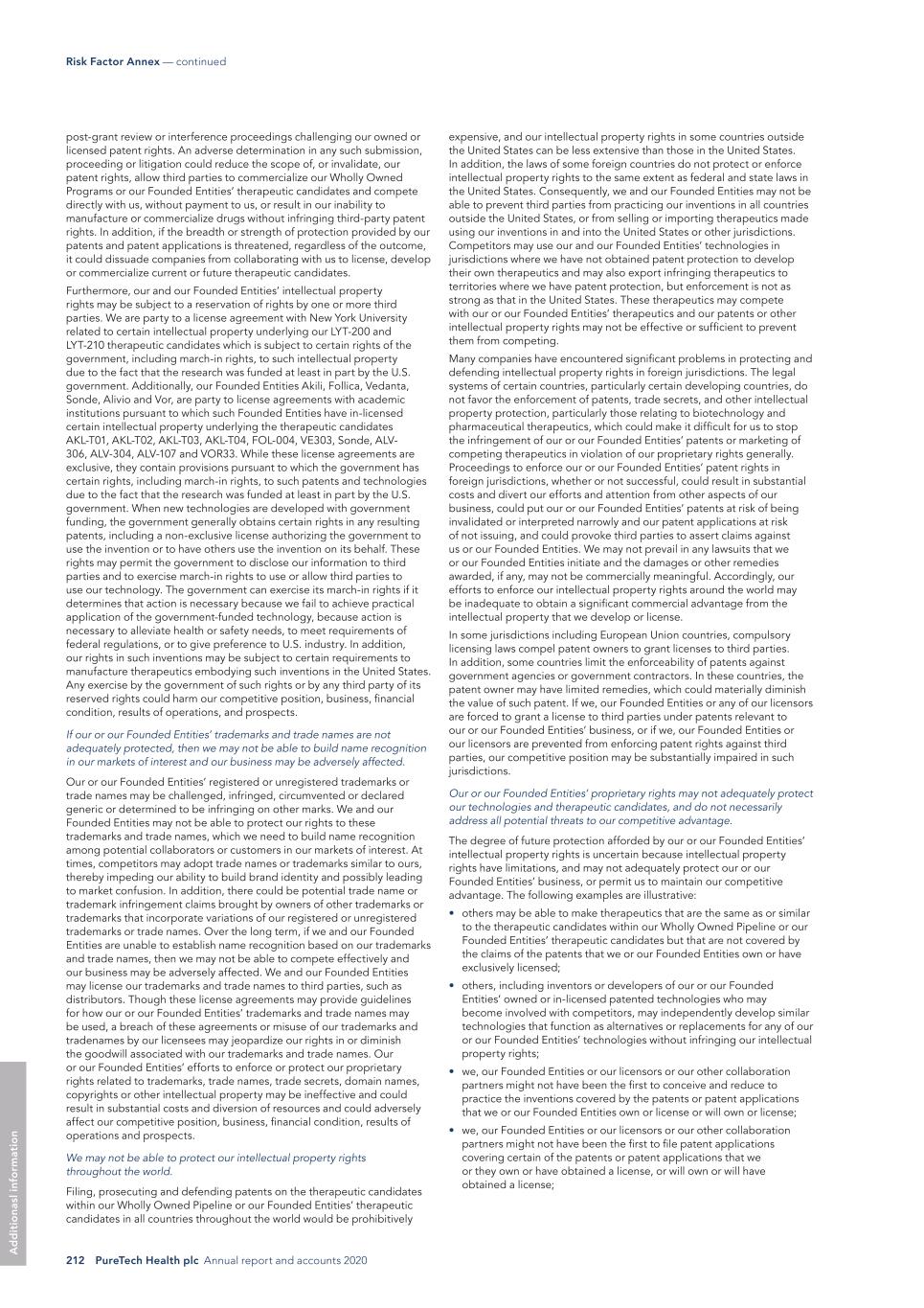212 PureTech Health plc Annual report and accounts 2020 Risk Factor Annex — continued A d d it io n a sl i n fo rm a ti o n post-grant review or interference proceedings challenging our owned or licensed patent rights. An adverse determination in any such submission, proceeding or litigation could reduce the scope of, or invalidate, our patent rights, allow third parties to commercialize our Wholly Owned Programs or our Founded Entities’ therapeutic candidates and compete directly with us, without payment to us, or result in our inability to manufacture or commercialize drugs without infringing third-party patent rights. In addition, if the breadth or strength of protection provided by our patents and patent applications is threatened, regardless of the outcome, it could dissuade companies from collaborating with us to license, develop or commercialize current or future therapeutic candidates. Furthermore, our and our Founded Entities’ intellectual property rights may be subject to a reservation of rights by one or more third parties. We are party to a license agreement with New York University related to certain intellectual property underlying our LYT-200 and LYT-210 therapeutic candidates which is subject to certain rights of the government, including march-in rights, to such intellectual property due to the fact that the research was funded at least in part by the U.S. government. Additionally, our Founded Entities Akili, Follica, Vedanta, Sonde, Alivio and Vor, are party to license agreements with academic institutions pursuant to which such Founded Entities have in-licensed certain intellectual property underlying the therapeutic candidates AKL-T01, AKL-T02, AKL-T03, AKL-T04, FOL-004, VE303, Sonde, ALV- 306, ALV-304, ALV-107 and VOR33. While these license agreements are exclusive, they contain provisions pursuant to which the government has certain rights, including march-in rights, to such patents and technologies due to the fact that the research was funded at least in part by the U.S. government. When new technologies are developed with government funding, the government generally obtains certain rights in any resulting patents, including a non-exclusive license authorizing the government to use the invention or to have others use the invention on its behalf. These rights may permit the government to disclose our information to third parties and to exercise march-in rights to use or allow third parties to use our technology. The government can exercise its march-in rights if it determines that action is necessary because we fail to achieve practical application of the government-funded technology, because action is necessary to alleviate health or safety needs, to meet requirements of federal regulations, or to give preference to U.S. industry. In addition, our rights in such inventions may be subject to certain requirements to manufacture therapeutics embodying such inventions in the United States. Any exercise by the government of such rights or by any third party of its reserved rights could harm our competitive position, business, financial condition, results of operations, and prospects. If our or our Founded Entities’ trademarks and trade names are not adequately protected, then we may not be able to build name recognition in our markets of interest and our business may be adversely affected. Our or our Founded Entities’ registered or unregistered trademarks or trade names may be challenged, infringed, circumvented or declared generic or determined to be infringing on other marks. We and our Founded Entities may not be able to protect our rights to these trademarks and trade names, which we need to build name recognition among potential collaborators or customers in our markets of interest. At times, competitors may adopt trade names or trademarks similar to ours, thereby impeding our ability to build brand identity and possibly leading to market confusion. In addition, there could be potential trade name or trademark infringement claims brought by owners of other trademarks or trademarks that incorporate variations of our registered or unregistered trademarks or trade names. Over the long term, if we and our Founded Entities are unable to establish name recognition based on our trademarks and trade names, then we may not be able to compete effectively and our business may be adversely affected. We and our Founded Entities may license our trademarks and trade names to third parties, such as distributors. Though these license agreements may provide guidelines for how our or our Founded Entities’ trademarks and trade names may be used, a breach of these agreements or misuse of our trademarks and tradenames by our licensees may jeopardize our rights in or diminish the goodwill associated with our trademarks and trade names. Our or our Founded Entities’ efforts to enforce or protect our proprietary rights related to trademarks, trade names, trade secrets, domain names, copyrights or other intellectual property may be ineffective and could result in substantial costs and diversion of resources and could adversely affect our competitive position, business, financial condition, results of operations and prospects. We may not be able to protect our intellectual property rights throughout the world. Filing, prosecuting and defending patents on the therapeutic candidates within our Wholly Owned Pipeline or our Founded Entities’ therapeutic candidates in all countries throughout the world would be prohibitively expensive, and our intellectual property rights in some countries outside the United States can be less extensive than those in the United States. In addition, the laws of some foreign countries do not protect or enforce intellectual property rights to the same extent as federal and state laws in the United States. Consequently, we and our Founded Entities may not be able to prevent third parties from practicing our inventions in all countries outside the Unite