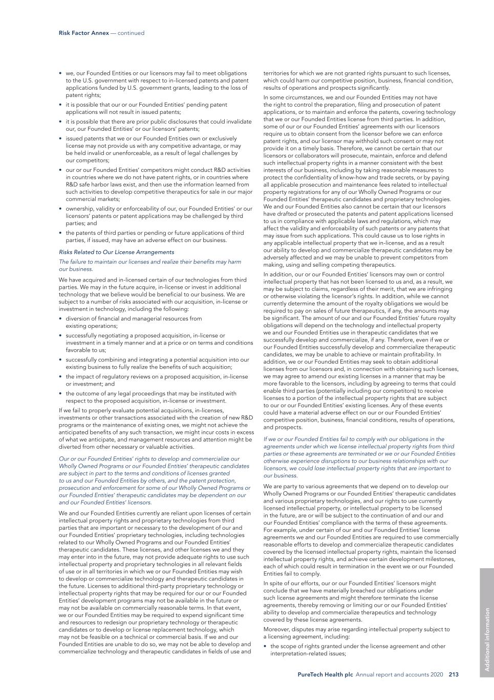 PureTech Health plc Annual report and accounts 2020 213 Risk Factor Annex — continued A d d it io n a l in fo rm a ti o n • we, our Founded Entities or our licensors may fail to meet obligations to the U.S. government with respect to in-licensed patents and patent applications funded by U.S. government grants, leading to the loss of patent rights; • it is possible that our or our Founded Entities’ pending patent applications will not result in issued patents; • it is possible that there are prior public disclosures that could invalidate our, our Founded Entities’ or our licensors’ patents; • issued patents that we or our Founded Entities own or exclusively license may not provide us with any competitive advantage, or may be held invalid or unenforceable, as a result of legal challenges by our competitors; • our or our Founded Entities’ competitors might conduct R&D activities in countries where we do not have patent rights, or in countries where R&D safe harbor laws exist, and then use the information learned from such activities to develop competitive therapeutics for sale in our major commercial markets; • ownership, validity or enforceability of our, our Founded Entities’ or our licensors’ patents or patent applications may be challenged by third parties; and • the patents of third parties or pending or future applications of third parties, if issued, may have an adverse effect on our business. Risks Related to Our License Arrangements The failure to maintain our licenses and realize their benefits may harm our business. We have acquired and in-licensed certain of our technologies from third parties. We may in the future acquire, in-license or invest in additional technology that we believe would be beneficial to our business. We are subject to a number of risks associated with our acquisition, in-license or investment in technology, including the following: • diversion of financial and managerial resources from existing operations; • successfully negotiating a proposed acquisition, in-license or investment in a timely manner and at a price or on terms and conditions favorable to us; • successfully combining and integrating a potential acquisition into our existing business to fully realize the benefits of such acquisition; • the impact of regulatory reviews on a proposed acquisition, in-license or investment; and • the outcome of any legal proceedings that may be instituted with respect to the proposed acquisition, in-license or investment. If we fail to properly evaluate potential acquisitions, in-licenses, investments or other transactions associated with the creation of new R&D programs or the maintenance of existing ones, we might not achieve the anticipated benefits of any such transaction, we might incur costs in excess of what we anticipate, and management resources and attention might be diverted from other necessary or valuable activities. Our or our Founded Entities’ rights to develop and commercialize our Wholly Owned Programs or our Founded Entities’ therapeutic candidates are subject in part to the terms and conditions of licenses granted to us and our Founded Entities by others, and the patent protection, prosecution and enforcement for some of our Wholly Owned Programs or our Founded Entities’ therapeutic candidates may be dependent on our and our Founded Entities’ licensors. We and our Founded Entities currently are reliant upon licenses of certain intellectual property rights and proprietary technologies from third parties that are important or necessary to the development of our and our Founded Entities’ proprietary technologies, including technologies related to our Wholly Owned Programs and our Founded Entities’ therapeutic candidates. These licenses, and other licenses we and they may enter into in the future, may not provide adequate rights to use such intellectual property and proprietary technologies in all relevant fields of use or in all territories in which we or our Founded Entities may wish to develop or commercialize technology and therapeutic candidates in the future. Licenses to additional third-party proprietary technology or intellectual property rights that may be required for our or our Founded Entities’ development programs may not be available in the future or may not be available on commercially reasonable terms. In that event, we or our Founded Entities may be required to expend significant time and resources to redesign our proprietary technology or therapeutic candidates or to develop or license replacement technology, which may not be feasible on a technical or commercial basis. If we and our Founded Entities are unable to do so, we may not be able to develop and commercialize technology and therapeutic candidates in fields of use and territories for which we are not granted rights pursuant to such licenses, which could harm our competitive position, business, financial condition, results of operations and prospects significantly. In some circumstances, we and our Founded Entities may not have the right to control the preparation, filing and prosecution of patent applications, or to maintain and enforce the patents, covering technology that we or our Founded Entities license from third parties. In addition, some of our or our Founded Entities’ agreements with our licensors require us to obtain consent from the licensor before we can enforce patent rights, and our licensor may withhold such consent or may not provide it on a timely basis. Therefore, we cannot be certain that our licensors or collaborators will prosecute, maintain, enforce and defend such intellectual property rights in a manner consistent with the best interests of our business, including by taking reasonable measures to protect the confidentiality of know-how and trade secrets, or by paying all applicable prosecution and maintenance fees related to intellectual property registrations for any of our Wholly Owned Programs o