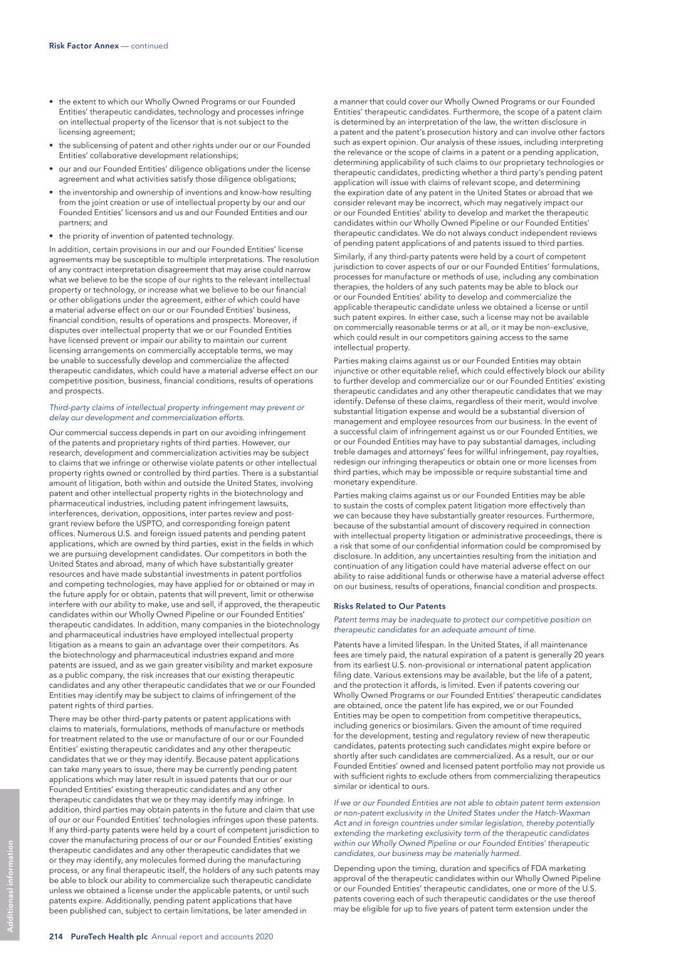 214 PureTech Health plc Annual report and accounts 2020 Risk Factor Annex — continued A d d it io n a sl i n fo rm a ti o n • the extent to which our Wholly Owned Programs or our Founded Entities’ therapeutic candidates, technology and processes infringe on intellectual property of the licensor that is not subject to the licensing agreement; • the sublicensing of patent and other rights under our or our Founded Entities’ collaborative development relationships; • our and our Founded Entities’ diligence obligations under the license agreement and what activities satisfy those diligence obligations; • the inventorship and ownership of inventions and know-how resulting from the joint creation or use of intellectual property by our and our Founded Entities’ licensors and us and our Founded Entities and our partners; and • the priority of invention of patented technology. In addition, certain provisions in our and our Founded Entities’ license agreements may be susceptible to multiple interpretations. The resolution of any contract interpretation disagreement that may arise could narrow what we believe to be the scope of our rights to the relevant intellectual property or technology, or increase what we believe to be our financial or other obligations under the agreement, either of which could have a material adverse effect on our or our Founded Entities’ business, financial condition, results of operations and prospects. Moreover, if disputes over intellectual property that we or our Founded Entities have licensed prevent or impair our ability to maintain our current licensing arrangements on commercially acceptable terms, we may be unable to successfully develop and commercialize the affected therapeutic candidates, which could have a material adverse effect on our competitive position, business, financial conditions, results of operations and prospects. Third-party claims of intellectual property infringement may prevent or delay our development and commercialization efforts. Our commercial success depends in part on our avoiding infringement of the patents and proprietary rights of third parties. However, our research, development and commercialization activities may be subject to claims that we infringe or otherwise violate patents or other intellectual property rights owned or controlled by third parties. There is a substantial amount of litigation, both within and outside the United States, involving patent and other intellectual property rights in the biotechnology and pharmaceutical industries, including patent infringement lawsuits, interferences, derivation, oppositions, inter partes review and post- grant review before the USPTO, and corresponding foreign patent offices. Numerous U.S. and foreign issued patents and pending patent applications, which are owned by third parties, exist in the fields in which we are pursuing development candidates. Our competitors in both the United States and abroad, many of which have substantially greater resources and have made substantial investments in patent portfolios and competing technologies, may have applied for or obtained or may in the future apply for or obtain, patents that will prevent, limit or otherwise interfere with our ability to make, use and sell, if approved, the therapeutic candidates within our Wholly Owned Pipeline or our Founded Entities’ therapeutic candidates. In addition, many companies in the biotechnology and pharmaceutical industries have employed intellectual property litigation as a means to gain an advantage over their competitors. As the biotechnology and pharmaceutical industries expand and more patents are issued, and as we gain greater visibility and market exposure as a public company, the risk increases that our existing therapeutic candidates and any other therapeutic candidates that we or our Founded Entities may identify may be subject to claims of infringement of the patent rights of third parties. There may be other third-party patents or patent applications with claims to materials, formulations, methods of manufacture or methods for treatment related to the use or manufacture of our or our Founded Entities’ existing therapeutic candidates and any other therapeutic candidates that we or they may identify. Because patent applications can take many years to issue, there may be currently pending patent applications which may later result in issued patents that our or our Founded Entities’ existing therapeutic candidates and any other therapeutic candidates that we or they may identify may infringe. In addition, third parties may obtain patents in the future and claim that use of our or our Founded Entities’ technologies infringes upon these patents. If any third-party patents were held by a court of competent jurisdiction to cover the manufacturing process of our or our Founded Entities’ existing therapeutic candidates and any other therapeutic candidates that we or they may identify, any molecules formed during the manufacturing process, or any final therapeutic itself, the holders of any such patents may be able to block our ability to commercialize such therapeutic candidate unless we obtained a license under the applicable patents, or until such patents expire. Additionally, pending patent applications that have been published can, subject to certain limitations, be later amended in a manner that could cover our Wholly Owned Programs or our Founded Entities’ therapeutic candidates. Furthermore, the scope of a patent claim is determined by an interpretation of the law, the written disclosure in a patent and the patent’s prosecution history and can involve other factors such as expert opinion. Our analysis of these issues, including interpreting the relevance or the scope of claims in a patent or a pending application, determining applicability of such claims to our proprietary technologies or therapeutic candidates, predicting whether a third party’s pending pate