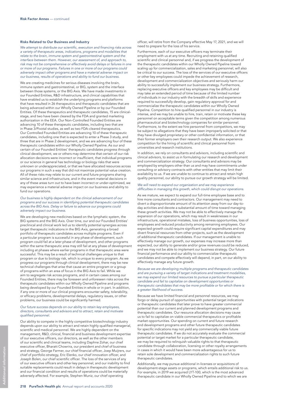 218 PureTech Health plc Annual report and accounts 2020 Risk Factor Annex — continued A d d it io n a sl i n fo rm a ti o n Risks Related to Our Business and Industry We attempt to distribute our scientific, execution and financing risks across a variety of therapeutic areas, indications, programs and modalities that relate to the brain, immune system and gastrointestinal system and the interface between them. However, our assessment of, and approach to, risk may not be comprehensive or effectively avoid delays or failures in one or more of our programs. Failures in one or more of our programs could adversely impact other programs and have a material adverse impact on our business, results of operations and ability to fund our business. We are creating medicines for serious diseases involving the brain, immune system and gastrointestinal, or BIG, system and the interface between those systems, or the BIG Axis. We have made investments in our Founded Entities, R&D infrastructure, and clinical capabilities that have enabled us to establish the underlying programs and platforms that have resulted in 26 therapeutics and therapeutic candidates that are being advanced within our Wholly Owned Pipeline or by our Founded Entities. Of these therapeutics and therapeutic candidates, 15 are clinical- stage, and two have been cleared by the FDA and granted marketing authorization in the EEA. Our Non-Controlled Founded Entities are advancing 10 of these therapeutic candidates, including two that are in Phase 3/Pivotal studies, as well as two FDA-cleared therapeutics. Our Controlled Founded Entities are advancing 10 of these therapeutic candidates, including one that is expected to enter a Phase 3 study, and three that are in Phase 2 development, and we are advancing four of these therapeutic candidates within our Wholly Owned Pipeline. As our and certain of our Founded Entities’ therapeutic candidates progress through clinical development, we or others may determine that certain of our risk allocation decisions were incorrect or insufficient, that individual programs or our science in general has technology or biology risks that were unknown or underappreciated, or that we have allocated resources across our programs in such a way that did not maximize potential value creation. All of these risks may relate to our current and future programs sharing similar science and infrastructure, and in the event material decisions in any of these areas turn out to have been incorrect or under-optimized, we may experience a material adverse impact on our business and ability to fund our operations. Our business is highly dependent on the clinical advancement of our programs and our success in identifying potential therapeutic candidates across the BIG Axis. Delay or failure to advance our programs could adversely impact our business. We are developing new medicines based on the lymphatic system, the BIG systems and the BIG Axis. Over time, our and our Founded Entities’ preclinical and clinical work led us to identify potential synergies across target therapeutic indications in the BIG Axis, generating a broad portfolio of therapeutic candidates across multiple programs. Even if a particular program is successful in any phase of development, such program could fail at a later phase of development, and other programs within the same therapeutic area may still fail at any phase of development including at phases where earlier programs in that therapeutic area were successful. This may be a result of technical challenges unique to that program or due to biology risk, which is unique to every program. As we progress our programs through clinical development, there may be new technical challenges that arise that cause an entire program or a group of programs within an area of focus in the BIG Axis to fail. While we aim to segregate risk across programs, and in certain cases among our Founded Entities, there may be foreseen and unforeseen risks across the therapeutic candidates within our Wholly Owned Pipeline and programs being developed by our Founded Entities in whole or in part. In addition, if any one or more of our clinical programs encounter safety, tolerability, or efficacy problems, developmental delays, regulatory issues, or other problems, our business could be significantly harmed. Our future success depends on our ability to retain key employees, directors, consultants and advisors and to attract, retain and motivate qualified personnel. Our ability to compete in the highly competitive biotechnology industry depends upon our ability to attract and retain highly qualified managerial, scientific and medical personnel. We are highly dependent on the management, R&D, clinical, financial and business development expertise of our executive officers, our directors, as well as the other members of our scientific and clinical teams, including Daphne Zohar, our chief executive officer, Bharatt Chowrira, our president and chief of business and strategy, George Farmer, our chief financial officer, Joep Muijrers, our chief of portfolio strategy, Eric Elenko, our chief innovation officer, and Joseph Bolen, our chief scientific officer. The loss of the services of any of our executive officers and other key personnel, and our inability to find suitable replacements could result in delays in therapeutic development and our financial condition and results of operations could be materially adversely affected. For example, Stephen Muniz, our chief operating officer, will retire from the Company effective May 17, 2021, and we will need to prepare for the loss of his service. Furthermore, each of our executive officers may terminate their employment with us at any time. Recruiting and retaining qualified scientific and clinical personnel and, if we progress the development of the therapeutic candidates within our Wholly Owned Pipeline toward scaling up for commercialization, sales and marketing personnel, will also be crit