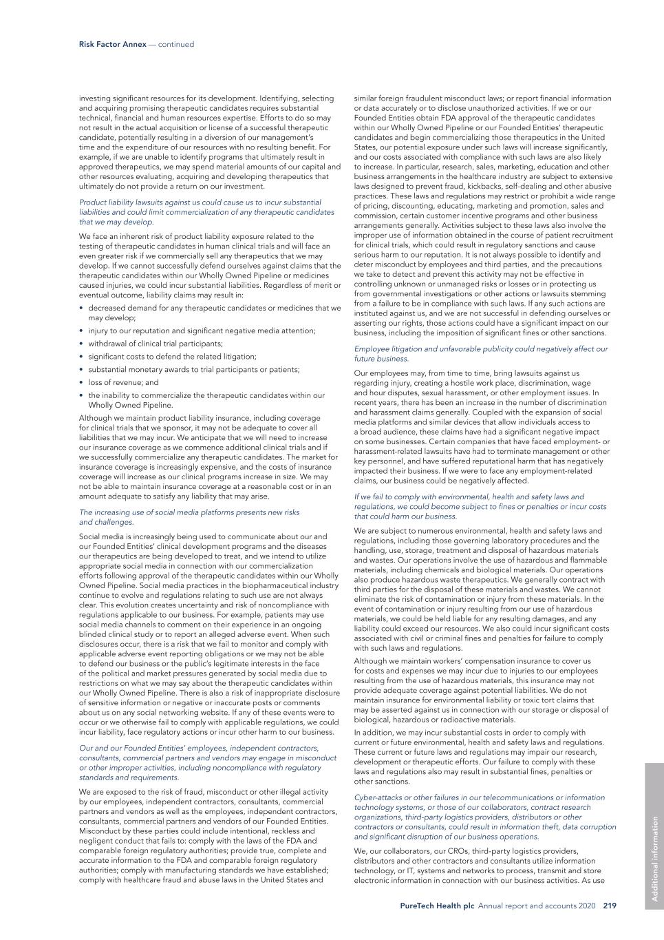 PureTech Health plc Annual report and accounts 2020 219 Risk Factor Annex — continued A d d it io n a l in fo rm a ti o n investing significant resources for its development. Identifying, selecting and acquiring promising therapeutic candidates requires substantial technical, financial and human resources expertise. Efforts to do so may not result in the actual acquisition or license of a successful therapeutic candidate, potentially resulting in a diversion of our management’s time and the expenditure of our resources with no resulting benefit. For example, if we are unable to identify programs that ultimately result in approved therapeutics, we may spend material amounts of our capital and other resources evaluating, acquiring and developing therapeutics that ultimately do not provide a return on our investment. Product liability lawsuits against us could cause us to incur substantial liabilities and could limit commercialization of any therapeutic candidates that we may develop. We face an inherent risk of product liability exposure related to the testing of therapeutic candidates in human clinical trials and will face an even greater risk if we commercially sell any therapeutics that we may develop. If we cannot successfully defend ourselves against claims that the therapeutic candidates within our Wholly Owned Pipeline or medicines caused injuries, we could incur substantial liabilities. Regardless of merit or eventual outcome, liability claims may result in: • decreased demand for any therapeutic candidates or medicines that we may develop; • injury to our reputation and significant negative media attention; • withdrawal of clinical trial participants; • significant costs to defend the related litigation; • substantial monetary awards to trial participants or patients; • loss of revenue; and • the inability to commercialize the therapeutic candidates within our Wholly Owned Pipeline. Although we maintain product liability insurance, including coverage for clinical trials that we sponsor, it may not be adequate to cover all liabilities that we may incur. We anticipate that we will need to increase our insurance coverage as we commence additional clinical trials and if we successfully commercialize any therapeutic candidates. The market for insurance coverage is increasingly expensive, and the costs of insurance coverage will increase as our clinical programs increase in size. We may not be able to maintain insurance coverage at a reasonable cost or in an amount adequate to satisfy any liability that may arise. The increasing use of social media platforms presents new risks and challenges. Social media is increasingly being used to communicate about our and our Founded Entities’ clinical development programs and the diseases our therapeutics are being developed to treat, and we intend to utilize appropriate social media in connection with our commercialization efforts following approval of the therapeutic candidates within our Wholly Owned Pipeline. Social media practices in the biopharmaceutical industry continue to evolve and regulations relating to such use are not always clear. This evolution creates uncertainty and risk of noncompliance with regulations applicable to our business. For example, patients may use social media channels to comment on their experience in an ongoing blinded clinical study or to report an alleged adverse event. When such disclosures occur, there is a risk that we fail to monitor and comply with applicable adverse event reporting obligations or we may not be able to defend our business or the public’s legitimate interests in the face of the political and market pressures generated by social media due to restrictions on what we may say about the therapeutic candidates within our Wholly Owned Pipeline. There is also a risk of inappropriate disclosure of sensitive information or negative or inaccurate posts or comments about us on any social networking website. If any of these events were to occur or we otherwise fail to comply with applicable regulations, we could incur liability, face regulatory actions or incur other harm to our business. Our and our Founded Entities’ employees, independent contractors, consultants, commercial partners and vendors may engage in misconduct or other improper activities, including noncompliance with regulatory standards and requirements. We are exposed to the risk of fraud, misconduct or other illegal activity by our employees, independent contractors, consultants, commercial partners and vendors as well as the employees, independent contractors, consultants, commercial partners and vendors of our Founded Entities. Misconduct by these parties could include intentional, reckless and negligent conduct that fails to: comply with the laws of the FDA and comparable foreign regulatory authorities; provide true, complete and accurate information to the FDA and comparable foreign regulatory authorities; comply with manufacturing standards we have established; comply with healthcare fraud and abuse laws in the United States and similar foreign fraudulent misconduct laws; or report financial information or data accurately or to disclose unauthorized activities. If we or our Founded Entities obtain FDA approval of the therapeutic candidates within our Wholly Owned Pipeline or our Founded Entities’ therapeutic candidates and begin commercializing those therapeutics in the United States, our potential exposure under such laws will increase significantly, and our costs associated with compliance with such laws are also likely to increase. In particular, research, sales, marketing, education and other business arrangements in the healthcare industry are subject to extensive laws designed to prevent fraud, kickbacks, self-dealing and other abusive practices. These laws and regulations may restrict or prohibit a wide range of pricing, discounting, educating, marketing and promotion, sales and commission, certain cu