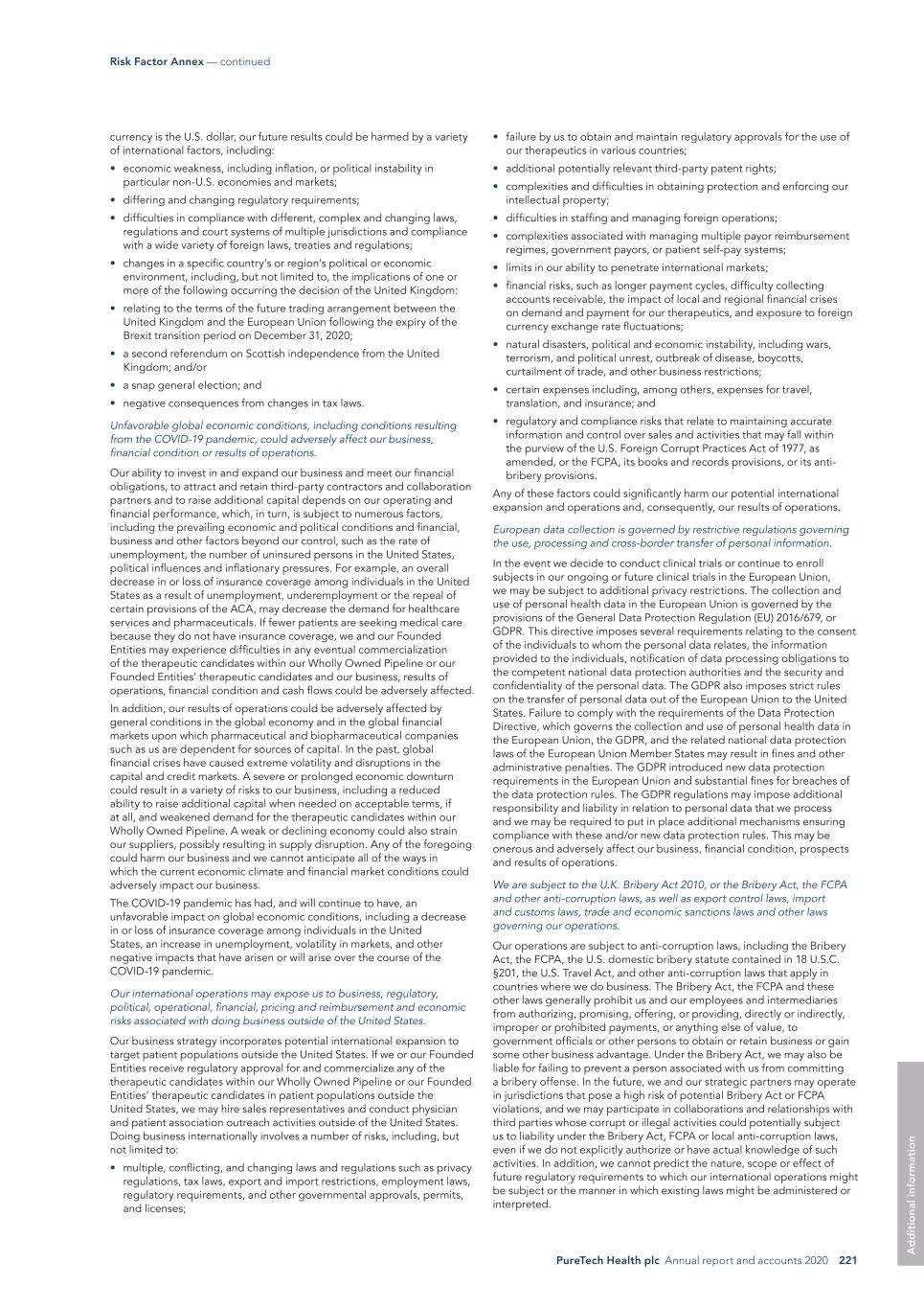 PureTech Health plc Annual report and accounts 2020 221 Risk Factor Annex — continued A d d it io n a l in fo rm a ti o n currency is the U.S. dollar, our future results could be harmed by a variety of international factors, including: • economic weakness, including inflation, or political instability in particular non-U.S. economies and markets; • differing and changing regulatory requirements; • difficulties in compliance with different, complex and changing laws, regulations and court systems of multiple jurisdictions and compliance with a wide variety of foreign laws, treaties and regulations; • changes in a specific country’s or region’s political or economic environment, including, but not limited to, the implications of one or more of the following occurring the decision of the United Kingdom: • relating to the terms of the future trading arrangement between the United Kingdom and the European Union following the expiry of the Brexit transition period on December 31, 2020; • a second referendum on Scottish independence from the United Kingdom; and/or • a snap general election; and • negative consequences from changes in tax laws. Unfavorable global economic conditions, including conditions resulting from the COVID-19 pandemic, could adversely affect our business, financial condition or results of operations. Our ability to invest in and expand our business and meet our financial obligations, to attract and retain third-party contractors and collaboration partners and to raise additional capital depends on our operating and financial performance, which, in turn, is subject to numerous factors, including the prevailing economic and political conditions and financial, business and other factors beyond our control, such as the rate of unemployment, the number of uninsured persons in the United States, political influences and inflationary pressures. For example, an overall decrease in or loss of insurance coverage among individuals in the United States as a result of unemployment, underemployment or the repeal of certain provisions of the ACA, may decrease the demand for healthcare services and pharmaceuticals. If fewer patients are seeking medical care because they do not have insurance coverage, we and our Founded Entities may experience difficulties in any eventual commercialization of the therapeutic candidates within our Wholly Owned Pipeline or our Founded Entities’ therapeutic candidates and our business, results of operations, financial condition and cash flows could be adversely affected. In addition, our results of operations could be adversely affected by general conditions in the global economy and in the global financial markets upon which pharmaceutical and biopharmaceutical companies such as us are dependent for sources of capital. In the past, global financial crises have caused extreme volatility and disruptions in the capital and credit markets. A severe or prolonged economic downturn could result in a variety of risks to our business, including a reduced ability to raise additional capital when needed on acceptable terms, if at all, and weakened demand for the therapeutic candidates within our Wholly Owned Pipeline. A weak or declining economy could also strain our suppliers, possibly resulting in supply disruption. Any of the foregoing could harm our business and we cannot anticipate all of the ways in which the current economic climate and financial market conditions could adversely impact our business. The COVID-19 pandemic has had, and will continue to have, an unfavorable impact on global economic conditions, including a decrease in or loss of insurance coverage among individuals in the United States, an increase in unemployment, volatility in markets, and other negative impacts that have arisen or will arise over the course of the COVID-19 pandemic. Our international operations may expose us to business, regulatory, political, operational, financial, pricing and reimbursement and economic risks associated with doing business outside of the United States. Our business strategy incorporates potential international expansion to target patient populations outside the United States. If we or our Founded Entities receive regulatory approval for and commercialize any of the therapeutic candidates within our Wholly Owned Pipeline or our Founded Entities’ therapeutic candidates in patient populations outside the United States, we may hire sales representatives and conduct physician and patient association outreach activities outside of the United States. Doing business internationally involves a number of risks, including, but not limited to: • multiple, conflicting, and changing laws and regulations such as privacy regulations, tax laws, export and import restrictions, employment laws, regulatory requirements, and other governmental approvals, permits, and licenses; • failure by us to obtain and maintain regulatory approvals for the use of our therapeutics in various countries; • additional potentially relevant third-party patent rights; • complexities and difficulties in obtaining protection and enforcing our intellectual property; • difficulties in staffing and managing foreign operations; • complexities associated with managing multiple payor reimbursement regimes, government payors, or patient self-pay systems; • limits in our ability to penetrate international markets; • financial risks, such as longer payment cycles, difficulty collecting accounts receivable, the impact of local and regional financial crises on demand and payment for our therapeutics, and exposure to foreign currency exchange rate fluctuations; • natural disasters, political and economic instability, including wars, terrorism, and political unrest, outbreak of disease, boycotts, curtailment of trade, and other business restrictions; • certain expenses including, among others, expenses for travel, translation, and insurance; and • regulatory and com