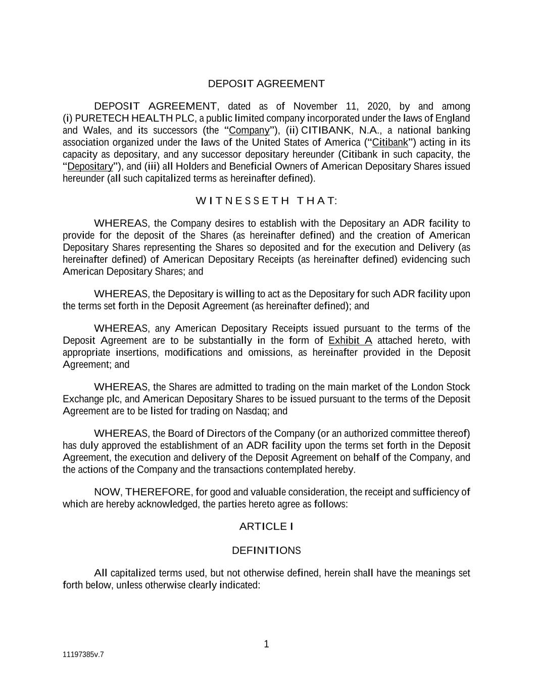 1 11197385v.7 DEPOSIT AGREEMENT DEPOSIT AGREEMENT, dated as of November 11, 2020, by and among (i) PURETECH HEALTH PLC, a public limited company incorporated under the laws of England and Wales, and its successors (the “Company”), (ii) CITIBANK, N.A., a national banking association organized under the laws of the United States of America (“Citibank”) acting in its capacity as depositary, and any successor depositary hereunder (Citibank in such capacity, the “Depositary”), and (iii) all Holders and Beneficial Owners of American Depositary Shares issued hereunder (all such capitalized terms as hereinafter defined). W I T N E S S E T H T H A T: WHEREAS, the Company desires to establish with the Depositary an ADR facility to provide for the deposit of the Shares (as hereinafter defined) and the creation of American Depositary Shares representing the Shares so deposited and for the execution and Delivery (as hereinafter defined) of American Depositary Receipts (as hereinafter defined) evidencing such American Depositary Shares; and WHEREAS, the Depositary is willing to act as the Depositary for such ADR facility upon the terms set forth in the Deposit Agreement (as hereinafter defined); and WHEREAS, any American Depositary Receipts issued pursuant to the terms of the Deposit Agreement are to be substantially in the form of Exhibit A attached hereto, with appropriate insertions, modifications and omissions, as hereinafter provided in the Deposit Agreement; and WHEREAS, the Shares are admitted to trading on the main market of the London Stock Exchange plc, and American Depositary Shares to be issued pursuant to the terms of the Deposit Agreement are to be listed for trading on Nasdaq; and WHEREAS, the Board of Directors of the Company (or an authorized committee thereof) has duly approved the establishment of an ADR facility upon the terms set forth in the Deposit Agreement, the execution and delivery of the Deposit Agreement on behalf of the Company, and the actions of the Company and the transactions contemplated hereby. NOW, THEREFORE, for good and valuable consideration, the receipt and sufficiency of which are hereby acknowledged, the parties hereto agree as follows: ARTICLE I DEFINITIONS All capitalized terms used, but not otherwise defined, herein shall have the meanings set forth below, unless otherwise clearly indicated: