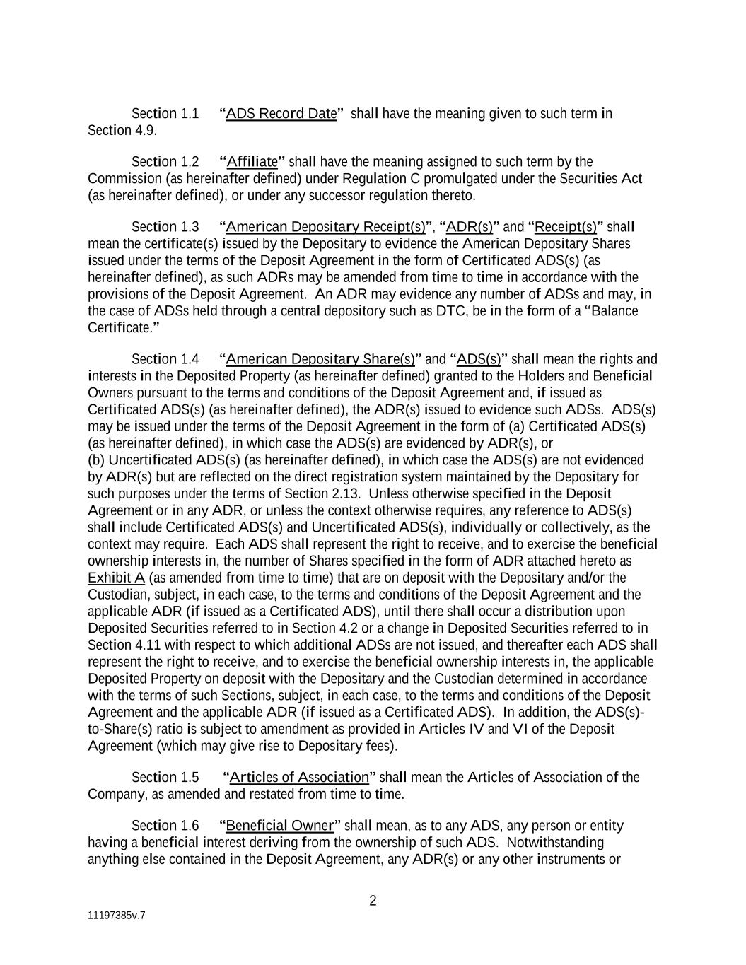 2 11197385v.7 Section 1.1 “ADS Record Date” shall have the meaning given to such term in Section 4.9. Section 1.2 “Affiliate” shall have the meaning assigned to such term by the Commission (as hereinafter defined) under Regulation C promulgated under the Securities Act (as hereinafter defined), or under any successor regulation thereto. Section 1.3 “American Depositary Receipt(s)”, “ADR(s)” and “Receipt(s)” shall mean the certificate(s) issued by the Depositary to evidence the American Depositary Shares issued under the terms of the Deposit Agreement in the form of Certificated ADS(s) (as hereinafter defined), as such ADRs may be amended from time to time in accordance with the provisions of the Deposit Agreement. An ADR may evidence any number of ADSs and may, in the case of ADSs held through a central depository such as DTC, be in the form of a “Balance Certificate.” Section 1.4 “American Depositary Share(s)” and “ADS(s)” shall mean the rights and interests in the Deposited Property (as hereinafter defined) granted to the Holders and Beneficial Owners pursuant to the terms and conditions of the Deposit Agreement and, if issued as Certificated ADS(s) (as hereinafter defined), the ADR(s) issued to evidence such ADSs. ADS(s) may be issued under the terms of the Deposit Agreement in the form of (a) Certificated ADS(s) (as hereinafter defined), in which case the ADS(s) are evidenced by ADR(s), or (b) Uncertificated ADS(s) (as hereinafter defined), in which case the ADS(s) are not evidenced by ADR(s) but are reflected on the direct registration system maintained by the Depositary for such purposes under the terms of Section 2.13. Unless otherwise specified in the Deposit Agreement or in any ADR, or unless the context otherwise requires, any reference to ADS(s) shall include Certificated ADS(s) and Uncertificated ADS(s), individually or collectively, as the context may require. Each ADS shall represent the right to receive, and to exercise the beneficial ownership interests in, the number of Shares specified in the form of ADR attached hereto as Exhibit A (as amended from time to time) that are on deposit with the Depositary and/or the Custodian, subject, in each case, to the terms and conditions of the Deposit Agreement and the applicable ADR (if issued as a Certificated ADS), until there shall occur a distribution upon Deposited Securities referred to in Section 4.2 or a change in Deposited Securities referred to in Section 4.11 with respect to which additional ADSs are not issued, and thereafter each ADS shall represent the right to receive, and to exercise the beneficial ownership interests in, the applicable Deposited Property on deposit with the Depositary and the Custodian determined in accordance with the terms of such Sections, subject, in each case, to the terms and conditions of the Deposit Agreement and the applicable ADR (if issued as a Certificated ADS). In addition, the ADS(s)- to-Share(s) ratio is subject to amendment as provided in Articles IV and VI of the Deposit Agreement (which may give rise to Depositary fees). Section 1.5 “Articles of Association” shall mean the Articles of Association of the Company, as amended and restated from time to time. Section 1.6 “Beneficial Owner” shall mean, as to any ADS, any person or entity having a beneficial interest deriving from the ownership of such ADS. Notwithstanding anything else contained in the Deposit Agreement, any ADR(s) or any other instruments or