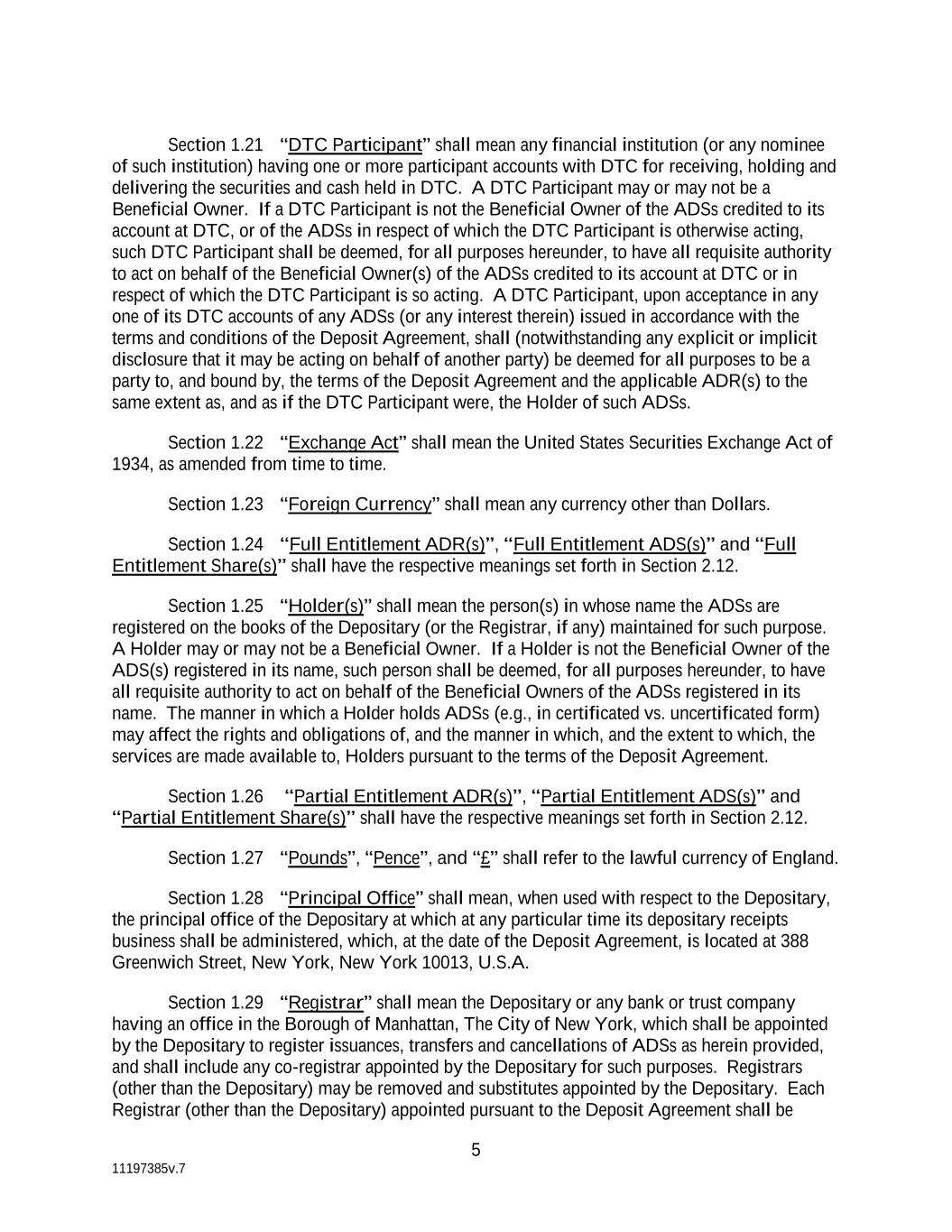 5 11197385v.7 Section 1.21 “DTC Participant” shall mean any financial institution (or any nominee of such institution) having one or more participant accounts with DTC for receiving, holding and delivering the securities and cash held in DTC. A DTC Participant may or may not be a Beneficial Owner. If a DTC Participant is not the Beneficial Owner of the ADSs credited to its account at DTC, or of the ADSs in respect of which the DTC Participant is otherwise acting, such DTC Participant shall be deemed, for all purposes hereunder, to have all requisite authority to act on behalf of the Beneficial Owner(s) of the ADSs credited to its account at DTC or in respect of which the DTC Participant is so acting. A DTC Participant, upon acceptance in any one of its DTC accounts of any ADSs (or any interest therein) issued in accordance with the terms and conditions of the Deposit Agreement, shall (notwithstanding any explicit or implicit disclosure that it may be acting on behalf of another party) be deemed for all purposes to be a party to, and bound by, the terms of the Deposit Agreement and the applicable ADR(s) to the same extent as, and as if the DTC Participant were, the Holder of such ADSs. Section 1.22 “Exchange Act” shall mean the United States Securities Exchange Act of 1934, as amended from time to time. Section 1.23 “Foreign Currency” shall mean any currency other than Dollars. Section 1.24 “Full Entitlement ADR(s)”, “Full Entitlement ADS(s)” and “Full Entitlement Share(s)” shall have the respective meanings set forth in Section 2.12. Section 1.25 “Holder(s)” shall mean the person(s) in whose name the ADSs are registered on the books of the Depositary (or the Registrar, if any) maintained for such purpose. A Holder may or may not be a Beneficial Owner. If a Holder is not the Beneficial Owner of the ADS(s) registered in its name, such person shall be deemed, for all purposes hereunder, to have all requisite authority to act on behalf of the Beneficial Owners of the ADSs registered in its name. The manner in which a Holder holds ADSs (e.g., in certificated vs. uncertificated form) may affect the rights and obligations of, and the manner in which, and the extent to which, the services are made available to, Holders pursuant to the terms of the Deposit Agreement. Section 1.26 “Partial Entitlement ADR(s)”, “Partial Entitlement ADS(s)” and “Partial Entitlement Share(s)” shall have the respective meanings set forth in Section 2.12. Section 1.27 “Pounds”, “Pence”, and “£” shall refer to the lawful currency of England. Section 1.28 “Principal Office” shall mean, when used with respect to the Depositary, the principal office of the Depositary at which at any particular time its depositary receipts business shall be administered, which, at the date of the Deposit Agreement, is located at 388 Greenwich Street, New York, New York 10013, U.S.A. Section 1.29 “Registrar” shall mean the Depositary or any bank or trust company having an office in the Borough of Manhattan, The City of New York, which shall be appointed by the Depositary to register issuances, transfers and cancellations of ADSs as herein provided, and shall include any co-registrar appointed by the Depositary for such purposes. Registrars (other than the Depositary) may be removed and substitutes appointed by the Depositary. Each Registrar (other than the Depositary) appointed pursuant to the Deposit Agreement shall be