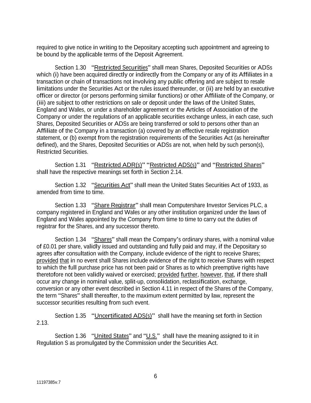 6 11197385v.7 required to give notice in writing to the Depositary accepting such appointment and agreeing to be bound by the applicable terms of the Deposit Agreement. Section 1.30 “Restricted Securities” shall mean Shares, Deposited Securities or ADSs which (i) have been acquired directly or indirectly from the Company or any of its Affiliates in a transaction or chain of transactions not involving any public offering and are subject to resale limitations under the Securities Act or the rules issued thereunder, or (ii) are held by an executive officer or director (or persons performing similar functions) or other Affiliate of the Company, or (iii) are subject to other restrictions on sale or deposit under the laws of the United States, England and Wales, or under a shareholder agreement or the Articles of Association of the Company or under the regulations of an applicable securities exchange unless, in each case, such Shares, Deposited Securities or ADSs are being transferred or sold to persons other than an Affiliate of the Company in a transaction (a) covered by an effective resale registration statement, or (b) exempt from the registration requirements of the Securities Act (as hereinafter defined), and the Shares, Deposited Securities or ADSs are not, when held by such person(s), Restricted Securities. Section 1.31 “Restricted ADR(s)” “Restricted ADS(s)” and “Restricted Shares” shall have the respective meanings set forth in Section 2.14. Section 1.32 “Securities Act” shall mean the United States Securities Act of 1933, as amended from time to time. Section 1.33 “Share Registrar” shall mean Computershare Investor Services PLC, a company registered in England and Wales or any other institution organized under the laws of England and Wales appointed by the Company from time to time to carry out the duties of registrar for the Shares, and any successor thereto. Section 1.34 “Shares” shall mean the Company’s ordinary shares, with a nominal value of £0.01 per share, validly issued and outstanding and fully paid and may, if the Depositary so agrees after consultation with the Company, include evidence of the right to receive Shares; provided that in no event shall Shares include evidence of the right to receive Shares with respect to which the full purchase price has not been paid or Shares as to which preemptive rights have theretofore not been validly waived or exercised; provided further, however, that, if there shall occur any change in nominal value, split-up, consolidation, reclassification, exchange, conversion or any other event described in Section 4.11 in respect of the Shares of the Company, the term “Shares” shall thereafter, to the maximum extent permitted by law, represent the successor securities resulting from such event. Section 1.35 “Uncertificated ADS(s)” shall have the meaning set forth in Section 2.13. Section 1.36 “United States” and “U.S.” shall have the meaning assigned to it in Regulation S as promulgated by the Commission under the Securities Act.
