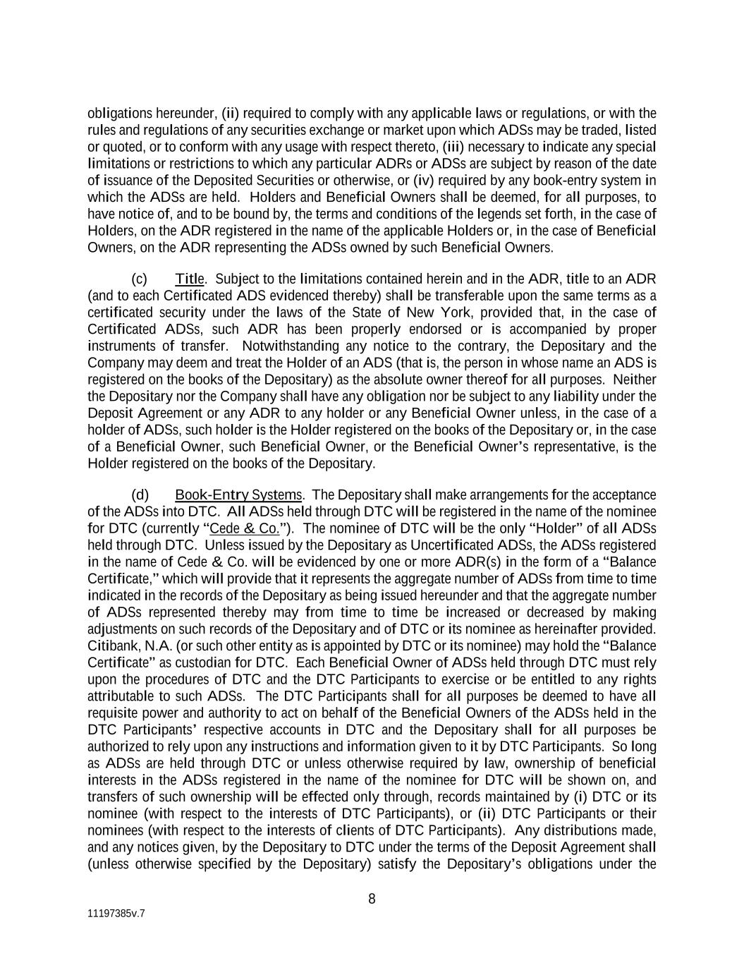 8 11197385v.7 obligations hereunder, (ii) required to comply with any applicable laws or regulations, or with the rules and regulations of any securities exchange or market upon which ADSs may be traded, listed or quoted, or to conform with any usage with respect thereto, (iii) necessary to indicate any special limitations or restrictions to which any particular ADRs or ADSs are subject by reason of the date of issuance of the Deposited Securities or otherwise, or (iv) required by any book-entry system in which the ADSs are held. Holders and Beneficial Owners shall be deemed, for all purposes, to have notice of, and to be bound by, the terms and conditions of the legends set forth, in the case of Holders, on the ADR registered in the name of the applicable Holders or, in the case of Beneficial Owners, on the ADR representing the ADSs owned by such Beneficial Owners. (c) Title. Subject to the limitations contained herein and in the ADR, title to an ADR (and to each Certificated ADS evidenced thereby) shall be transferable upon the same terms as a certificated security under the laws of the State of New York, provided that, in the case of Certificated ADSs, such ADR has been properly endorsed or is accompanied by proper instruments of transfer. Notwithstanding any notice to the contrary, the Depositary and the Company may deem and treat the Holder of an ADS (that is, the person in whose name an ADS is registered on the books of the Depositary) as the absolute owner thereof for all purposes. Neither the Depositary nor the Company shall have any obligation nor be subject to any liability under the Deposit Agreement or any ADR to any holder or any Beneficial Owner unless, in the case of a holder of ADSs, such holder is the Holder registered on the books of the Depositary or, in the case of a Beneficial Owner, such Beneficial Owner, or the Beneficial Owner’s representative, is the Holder registered on the books of the Depositary. (d) Book-Entry Systems. The Depositary shall make arrangements for the acceptance of the ADSs into DTC. All ADSs held through DTC will be registered in the name of the nominee for DTC (currently “Cede & Co.”). The nominee of DTC will be the only “Holder” of all ADSs held through DTC. Unless issued by the Depositary as Uncertificated ADSs, the ADSs registered in the name of Cede & Co. will be evidenced by one or more ADR(s) in the form of a “Balance Certificate,” which will provide that it represents the aggregate number of ADSs from time to time indicated in the records of the Depositary as being issued hereunder and that the aggregate number of ADSs represented thereby may from time to time be increased or decreased by making adjustments on such records of the Depositary and of DTC or its nominee as hereinafter provided. Citibank, N.A. (or such other entity as is appointed by DTC or its nominee) may hold the “Balance Certificate” as custodian for DTC. Each Beneficial Owner of ADSs held through DTC must rely upon the procedures of DTC and the DTC Participants to exercise or be entitled to any rights attributable to such ADSs. The DTC Participants shall for all purposes be deemed to have all requisite power and authority to act on behalf of the Beneficial Owners of the ADSs held in the DTC Participants’ respective accounts in DTC and the Depositary shall for all purposes be authorized to rely upon any instructions and information given to it by DTC Participants. So long as ADSs are held through DTC or unless otherwise required by law, ownership of beneficial interests in the ADSs registered in the name of the nominee for DTC will be shown on, and transfers of such ownership will be effected only through, records maintained by (i) DTC or its nominee (with respect to the interests of DTC Participants), or (ii) DTC Participants or their nominees (with respect to the interests of clients of DTC Participants). Any distributions made, and any notices given, by the Depositary to DTC under the terms of the Deposit Agreement shall (unless otherwise specified by the Depositary) satisfy the Depositary’s obligations under the