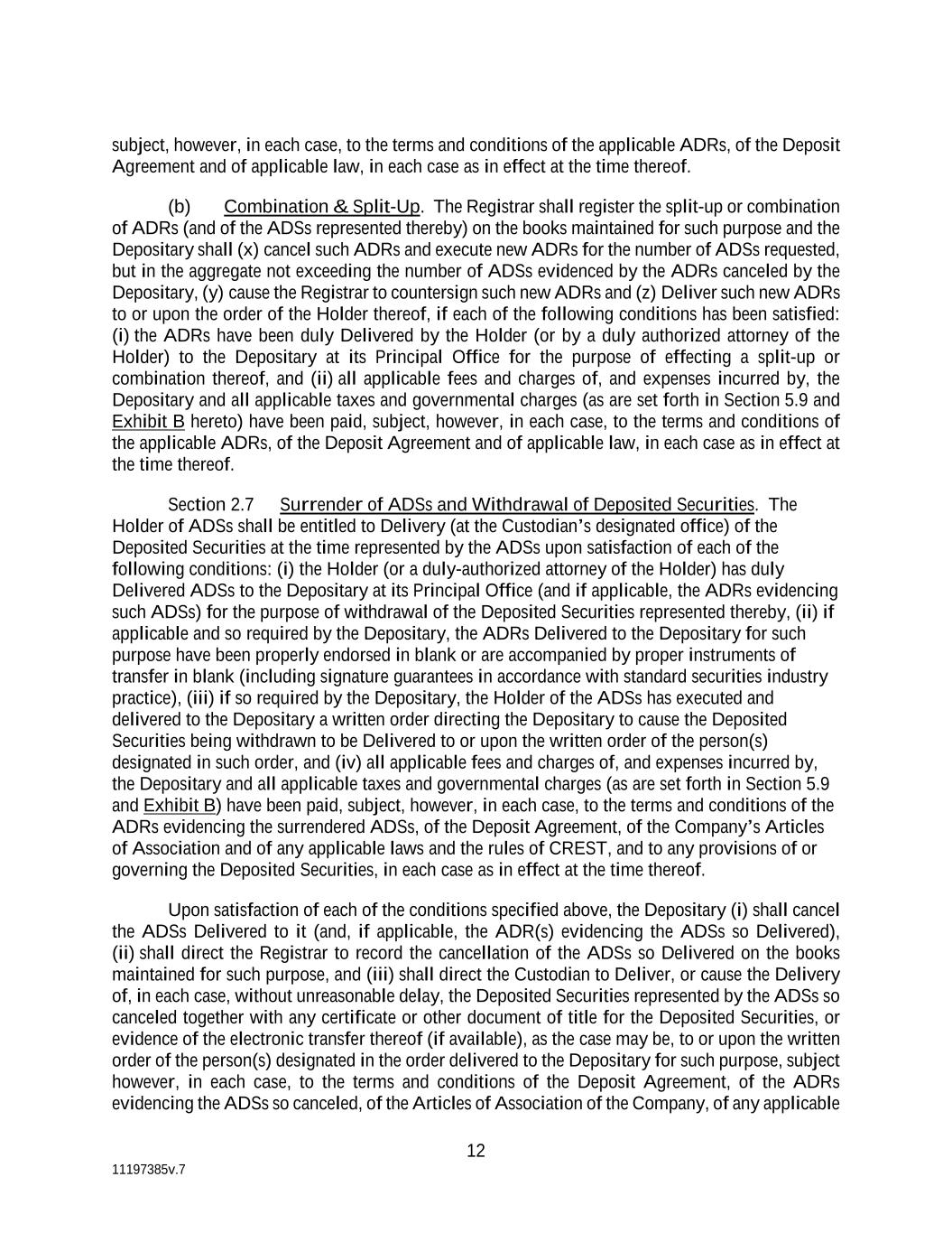 A-4 11197385v.7 the Registrar to countersign such new ADRs, and (z) Deliver such new ADRs to or upon the order of the person entitled thereto, if each of the following conditions has been satisfied: (i) this ADR has been duly Delivered by the Holder (or by a duly authorized attorney of the Holder) to the Depositary at its Principal Office for the purpose of effecting a transfer thereof, (ii) this surrendered ADR has been properly endorsed or is accompanied by proper instruments of transfer (including signature guarantees in accordance with standard securities industry practice), (iii) this surrendered ADR has been duly stamped (if required by the laws of the State of New York or of the United States), and (iv) all applicable fees and charges of, and expenses incurred by, the Depositary and all applicable taxes and governmental charges (as are set forth in Section 5.9 of, and Exhibit B to, the Deposit Agreement) have been paid, subject, however, in each case, to the terms and conditions of this ADR, of the Deposit Agreement and of applicable law, in each case as in effect at the time thereof. The Registrar shall register the split-up or combination of this ADR (and of the ADSs represented hereby) on the books maintained for such purpose and the Depositary shall (x) cancel this ADR and execute new ADRs for the number of ADSs requested, but in the aggregate not exceeding the number of ADSs evidenced by this ADR canceled by the Depositary, (y) cause the Registrar to countersign such new ADRs, and (z) Deliver such new ADRs to or upon the order of the Holder thereof, if each of the following conditions has been satisfied: (i) this ADR has been duly Delivered by the Holder (or by a duly authorized attorney of the Holder) to the Depositary at its Principal Office for the purpose of effecting a split-up or combination hereof, and (ii) all applicable fees and charges of, and expenses incurred by, the Depositary and all applicable taxes and governmental charges (as are set forth in Section 5.9 of, and Exhibit B to, the Deposit Agreement) have been paid, subject, however, in each case, to the terms and conditions of this ADR, of the Deposit Agreement and of applicable law, in each case as in effect at the time thereof. (4) Pre-Conditions to Registration, Transfer, Etc. As a condition precedent to the execution and Delivery, the registration of issuance, transfer, split-up, combination or surrender, of any ADS, the delivery of any distribution thereon, or the withdrawal of any Deposited Property, the Depositary or the Custodian may require (i) payment from the depositor of Shares or presenter of ADSs or of this ADR of a sum sufficient to reimburse it for any tax or other governmental charge and any stock transfer or registration fee with respect thereto (including any such tax or charge and fee with respect to Shares being deposited or withdrawn) and payment of any applicable fees and charges of the Depositary as provided in Section 5.9 and Exhibit B to the Deposit Agreement and in this ADR, (ii) the production of proof reasonably satisfactory to it as to the identity and genuineness of any signature or any other matter contemplated by Section 3.1 of the Deposit Agreement, and (iii) compliance with (A) any laws or governmental regulations relating to the execution and Delivery of this ADR or ADSs or to the withdrawal of Deposited Securities and (B) such reasonable regulations as the Depositary and the Company may establish consistent with the provisions of this ADR, if applicable, the Deposit Agreement and applicable law. The issuance of ADSs against deposits of Shares generally or against deposits of particular Shares may be suspended, or the deposit of particular Shares may be refused, or the registration of transfer of ADSs in particular instances may be refused, or the registration of transfer of ADSs generally may be suspended, during any period when the transfer books of the Company, the Depositary, a Registrar or the Share Registrar are closed or if any such action is deemed necessary or advisable by the Depositary or the Company, in good faith, at any time or from time to time