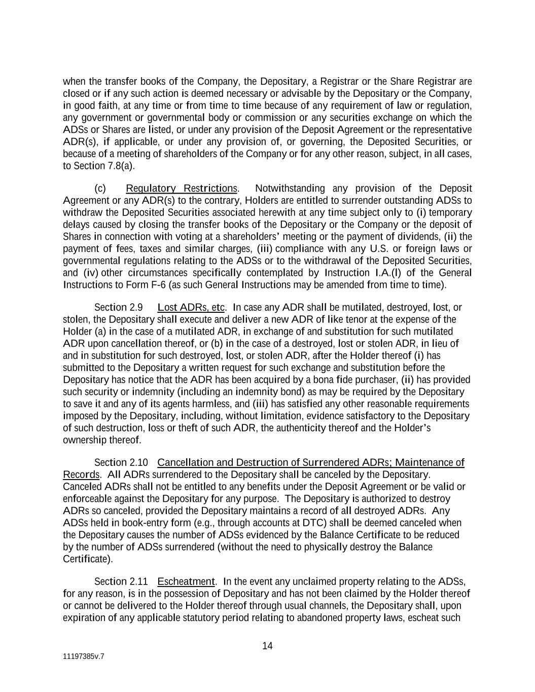 14 11197385v.7 when the transfer books of the Company, the Depositary, a Registrar or the Share Registrar are closed or if any such action is deemed necessary or advisable by the Depositary or the Company, in good faith, at any time or from time to time because of any requirement of law or regulation, any government or governmental body or commission or any securities exchange on which the ADSs or Shares are listed, or under any provision of the Deposit Agreement or the representative ADR(s), if applicable, or under any provision of, or governing, the Deposited Securities, or because of a meeting of shareholders of the Company or for any other reason, subject, in all cases, to Section 7.8(a). (c) Regulatory Restrictions. Notwithstanding any provision of the Deposit Agreement or any ADR(s) to the contrary, Holders are entitled to surrender outstanding ADSs to withdraw the Deposited Securities associated herewith at any time subject only to (i) temporary delays caused by closing the transfer books of the Depositary or the Company or the deposit of Shares in connection with voting at a shareholders’ meeting or the payment of dividends, (ii) the payment of fees, taxes and similar charges, (iii) compliance with any U.S. or foreign laws or governmental regulations relating to the ADSs or to the withdrawal of the Deposited Securities, and (iv) other circumstances specifically contemplated by Instruction I.A.(l) of the General Instructions to Form F-6 (as such General Instructions may be amended from time to time). Section 2.9 Lost ADRs, etc. In case any ADR shall be mutilated, destroyed, lost, or stolen, the Depositary shall execute and deliver a new ADR of like tenor at the expense of the Holder (a) in the case of a mutilated ADR, in exchange of and substitution for such mutilated ADR upon cancellation thereof, or (b) in the case of a destroyed, lost or stolen ADR, in lieu of and in substitution for such destroyed, lost, or stolen ADR, after the Holder thereof (i) has submitted to the Depositary a written request for such exchange and substitution before the Depositary has notice that the ADR has been acquired by a bona fide purchaser, (ii) has provided such security or indemnity (including an indemnity bond) as may be required by the Depositary to save it and any of its agents harmless, and (iii) has satisfied any other reasonable requirements imposed by the Depositary, including, without limitation, evidence satisfactory to the Depositary of such destruction, loss or theft of such ADR, the authenticity thereof and the Holder’s ownership thereof. Section 2.10 Cancellation and Destruction of Surrendered ADRs; Maintenance of Records. All ADRs surrendered to the Depositary shall be canceled by the Depositary. Canceled ADRs shall not be entitled to any benefits under the Deposit Agreement or be valid or enforceable against the Depositary for any purpose. The Depositary is authorized to destroy ADRs so canceled, provided the Depositary maintains a record of all destroyed ADRs. Any ADSs held in book-entry form (e.g., through accounts at DTC) shall be deemed canceled when the Depositary causes the number of ADSs evidenced by the Balance Certificate to be reduced by the number of ADSs surrendered (without the need to physically destroy the Balance Certificate). Section 2.11 Escheatment. In the event any unclaimed property relating to the ADSs, for any reason, is in the possession of Depositary and has not been claimed by the Holder thereof or cannot be delivered to the Holder thereof through usual channels, the Depositary shall, upon expiration of any applicable statutory period relating to abandoned property laws, escheat such