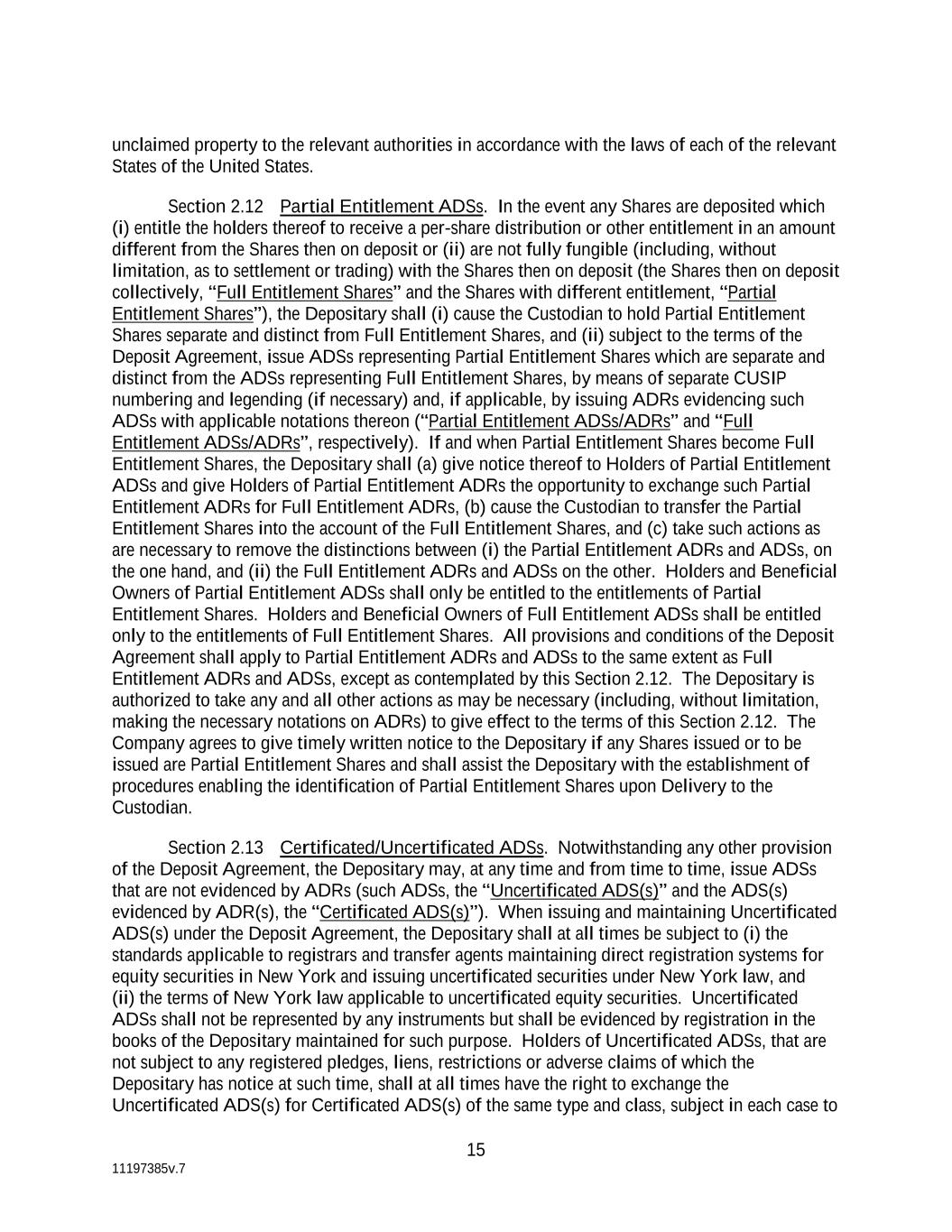15 11197385v.7 unclaimed property to the relevant authorities in accordance with the laws of each of the relevant States of the United States. Section 2.12 Partial Entitlement ADSs. In the event any Shares are deposited which (i) entitle the holders thereof to receive a per-share distribution or other entitlement in an amount different from the Shares then on deposit or (ii) are not fully fungible (including, without limitation, as to settlement or trading) with the Shares then on deposit (the Shares then on deposit collectively, “Full Entitlement Shares” and the Shares with different entitlement, “Partial Entitlement Shares”), the Depositary shall (i) cause the Custodian to hold Partial Entitlement Shares separate and distinct from Full Entitlement Shares, and (ii) subject to the terms of the Deposit Agreement, issue ADSs representing Partial Entitlement Shares which are separate and distinct from the ADSs representing Full Entitlement Shares, by means of separate CUSIP numbering and legending (if necessary) and, if applicable, by issuing ADRs evidencing such ADSs with applicable notations thereon (“Partial Entitlement ADSs/ADRs” and “Full Entitlement ADSs/ADRs”, respectively). If and when Partial Entitlement Shares become Full Entitlement Shares, the Depositary shall (a) give notice thereof to Holders of Partial Entitlement ADSs and give Holders of Partial Entitlement ADRs the opportunity to exchange such Partial Entitlement ADRs for Full Entitlement ADRs, (b) cause the Custodian to transfer the Partial Entitlement Shares into the account of the Full Entitlement Shares, and (c) take such actions as are necessary to remove the distinctions between (i) the Partial Entitlement ADRs and ADSs, on the one hand, and (ii) the Full Entitlement ADRs and ADSs on the other. Holders and Beneficial Owners of Partial Entitlement ADSs shall only be entitled to the entitlements of Partial Entitlement Shares. Holders and Beneficial Owners of Full Entitlement ADSs shall be entitled only to the entitlements of Full Entitlement Shares. All provisions and conditions of the Deposit Agreement shall apply to Partial Entitlement ADRs and ADSs to the same extent as Full Entitlement ADRs and ADSs, except as contemplated by this Section 2.12. The Depositary is authorized to take any and all other actions as may be necessary (including, without limitation, making the necessary notations on ADRs) to give effect to the terms of this Section 2.12. The Company agrees to give timely written notice to the Depositary if any Shares issued or to be issued are Partial Entitlement Shares and shall assist the Depositary with the establishment of procedures enabling the identification of Partial Entitlement Shares upon Delivery to the Custodian. Section 2.13 Certificated/Uncertificated ADSs. Notwithstanding any other provision of the Deposit Agreement, the Depositary may, at any time and from time to time, issue ADSs that are not evidenced by ADRs (such ADSs, the “Uncertificated ADS(s)” and the ADS(s) evidenced by ADR(s), the “Certificated ADS(s)”). When issuing and maintaining Uncertificated ADS(s) under the Deposit Agreement, the Depositary shall at all times be subject to (i) the standards applicable to registrars and transfer agents maintaining direct registration systems for equity securities in New York and issuing uncertificated securities under New York law, and (ii) the terms of New York law applicable to uncertificated equity securities. Uncertificated ADSs shall not be represented by any instruments but shall be evidenced by registration in the books of the Depositary maintained for such purpose. Holders of Uncertificated ADSs, that are not subject to any registered pledges, liens, restrictions or adverse claims of which the Depositary has notice at such time, shall at all times have the right to exchange the Uncertificated ADS(s) for Certificated ADS(s) of the same type and class, subject in each case to