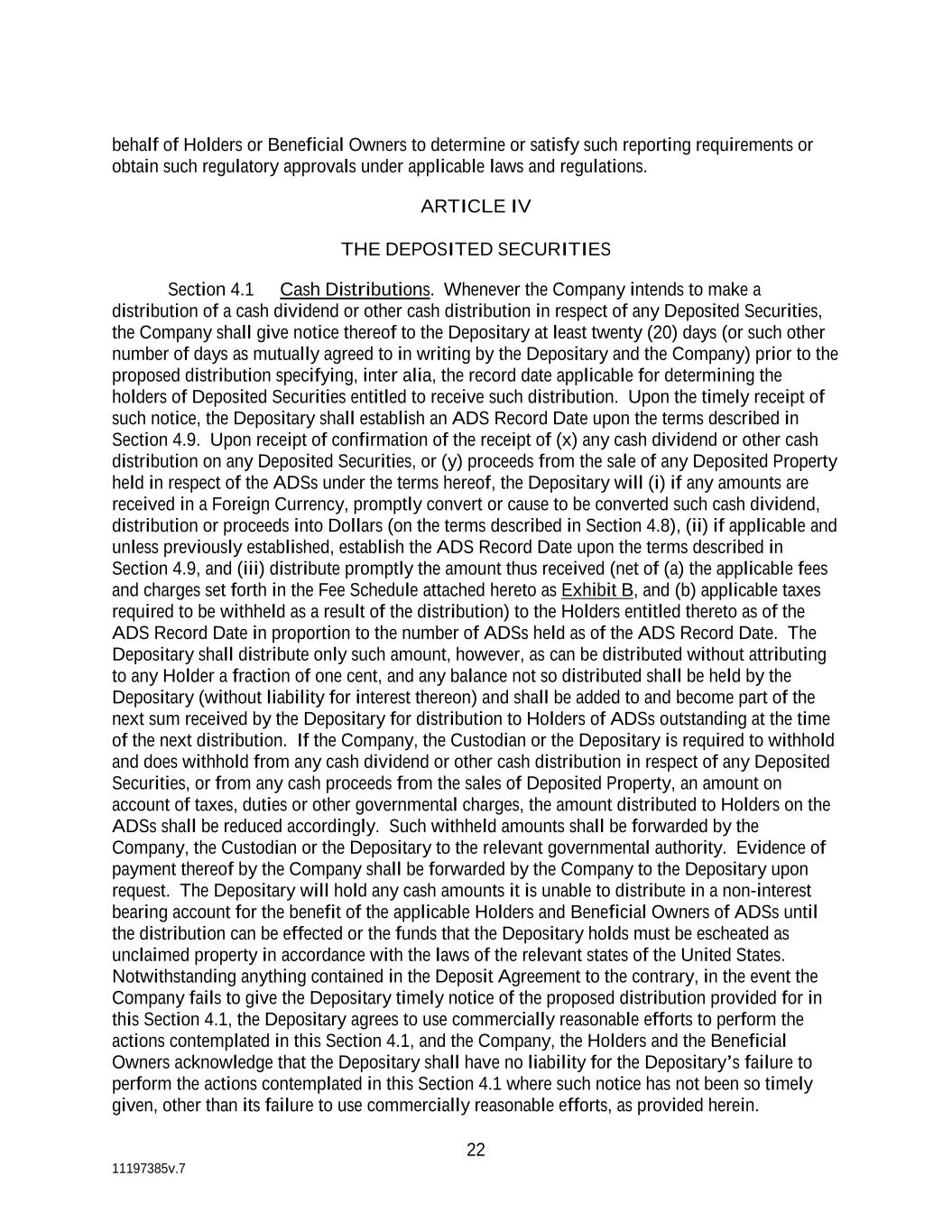 22 11197385v.7 behalf of Holders or Beneficial Owners to determine or satisfy such reporting requirements or obtain such regulatory approvals under applicable laws and regulations. ARTICLE IV THE DEPOSITED SECURITIES Section 4.1 Cash Distributions. Whenever the Company intends to make a distribution of a cash dividend or other cash distribution in respect of any Deposited Securities, the Company shall give notice thereof to the Depositary at least twenty (20) days (or such other number of days as mutually agreed to in writing by the Depositary and the Company) prior to the proposed distribution specifying, inter alia, the record date applicable for determining the holders of Deposited Securities entitled to receive such distribution. Upon the timely receipt of such notice, the Depositary shall establish an ADS Record Date upon the terms described in Section 4.9. Upon receipt of confirmation of the receipt of (x) any cash dividend or other cash distribution on any Deposited Securities, or (y) proceeds from the sale of any Deposited Property held in respect of the ADSs under the terms hereof, the Depositary will (i) if any amounts are received in a Foreign Currency, promptly convert or cause to be converted such cash dividend, distribution or proceeds into Dollars (on the terms described in Section 4.8), (ii) if applicable and unless previously established, establish the ADS Record Date upon the terms described in Section 4.9, and (iii) distribute promptly the amount thus received (net of (a) the applicable fees and charges set forth in the Fee Schedule attached hereto as Exhibit B, and (b) applicable taxes required to be withheld as a result of the distribution) to the Holders entitled thereto as of the ADS Record Date in proportion to the number of ADSs held as of the ADS Record Date. The Depositary shall distribute only such amount, however, as can be distributed without attributing to any Holder a fraction of one cent, and any balance not so distributed shall be held by the Depositary (without liability for interest thereon) and shall be added to and become part of the next sum received by the Depositary for distribution to Holders of ADSs outstanding at the time of the next distribution. If the Company, the Custodian or the Depositary is required to withhold and does withhold from any cash dividend or other cash distribution in respect of any Deposited Securities, or from any cash proceeds from the sales of Deposited Property, an amount on account of taxes, duties or other governmental charges, the amount distributed to Holders on the ADSs shall be reduced accordingly. Such withheld amounts shall be forwarded by the Company, the Custodian or the Depositary to the relevant governmental authority. Evidence of payment thereof by the Company shall be forwarded by the Company to the Depositary upon request. The Depositary will hold any cash amounts it is unable to distribute in a non-interest bearing account for the benefit of the applicable Holders and Beneficial Owners of ADSs until the distribution can be effected or the funds that the Depositary holds must be escheated as unclaimed property in accordance with the laws of the relevant states of the United States. Notwithstanding anything contained in the Deposit Agreement to the contrary, in the event the Company fails to give the Depositary timely notice of the proposed distribution provided for in this Section 4.1, the Depositary agrees to use commercially reasonable efforts to perform the actions contemplated in this Section 4.1, and the Company, the Holders and the Beneficial Owners acknowledge that the Depositary shall have no liability for the Depositary’s failure to perform the actions contemplated in this Section 4.1 where such notice has not been so timely given, other than its failure to use commercially reasonable efforts, as provided herein.