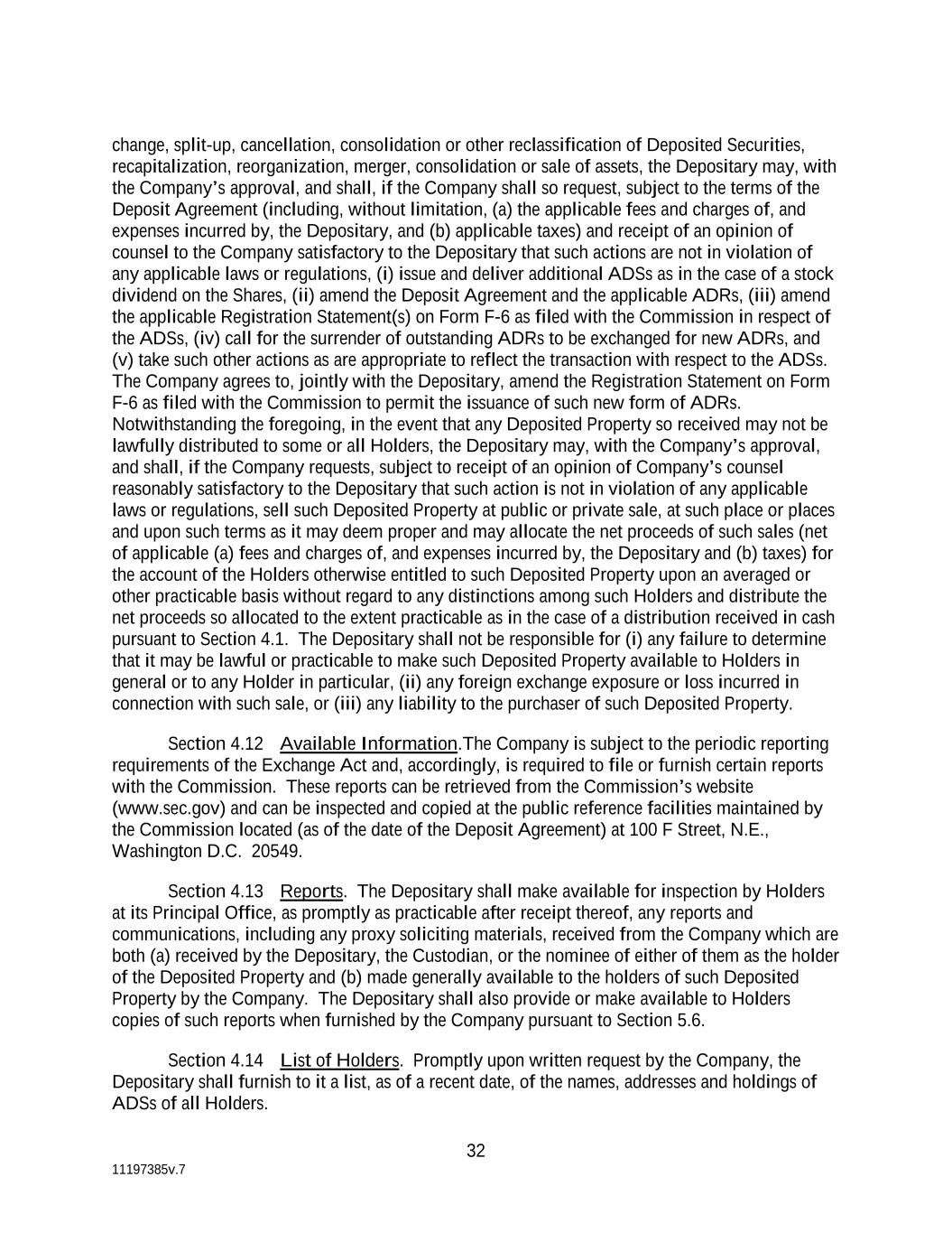 32 11197385v.7 change, split-up, cancellation, consolidation or other reclassification of Deposited Securities, recapitalization, reorganization, merger, consolidation or sale of assets, the Depositary may, with the Company’s approval, and shall, if the Company shall so request, subject to the terms of the Deposit Agreement (including, without limitation, (a) the applicable fees and charges of, and expenses incurred by, the Depositary, and (b) applicable taxes) and receipt of an opinion of counsel to the Company satisfactory to the Depositary that such actions are not in violation of any applicable laws or regulations, (i) issue and deliver additional ADSs as in the case of a stock dividend on the Shares, (ii) amend the Deposit Agreement and the applicable ADRs, (iii) amend the applicable Registration Statement(s) on Form F-6 as filed with the Commission in respect of the ADSs, (iv) call for the surrender of outstanding ADRs to be exchanged for new ADRs, and (v) take such other actions as are appropriate to reflect the transaction with respect to the ADSs. The Company agrees to, jointly with the Depositary, amend the Registration Statement on Form F-6 as filed with the Commission to permit the issuance of such new form of ADRs. Notwithstanding the foregoing, in the event that any Deposited Property so received may not be lawfully distributed to some or all Holders, the Depositary may, with the Company’s approval, and shall, if the Company requests, subject to receipt of an opinion of Company’s counsel reasonably satisfactory to the Depositary that such action is not in violation of any applicable laws or regulations, sell such Deposited Property at public or private sale, at such place or places and upon such terms as it may deem proper and may allocate the net proceeds of such sales (net of applicable (a) fees and charges of, and expenses incurred by, the Depositary and (b) taxes) for the account of the Holders otherwise entitled to such Deposited Property upon an averaged or other practicable basis without regard to any distinctions among such Holders and distribute the net proceeds so allocated to the extent practicable as in the case of a distribution received in cash pursuant to Section 4.1. The Depositary shall not be responsible for (i) any failure to determine that it may be lawful or practicable to make such Deposited Property available to Holders in general or to any Holder in particular, (ii) any foreign exchange exposure or loss incurred in connection with such sale, or (iii) any liability to the purchaser of such Deposited Property. Section 4.12 Available Information.The Company is subject to the periodic reporting requirements of the Exchange Act and, accordingly, is required to file or furnish certain reports with the Commission. These reports can be retrieved from the Commission’s website (www.sec.gov) and can be inspected and copied at the public reference facilities maintained by the Commission located (as of the date of the Deposit Agreement) at 100 F Street, N.E., Washington D.C. 20549. Section 4.13 Reports. The Depositary shall make available for inspection by Holders at its Principal Office, as promptly as practicable after receipt thereof, any reports and communications, including any proxy soliciting materials, received from the Company which are both (a) received by the Depositary, the Custodian, or the nominee of either of them as the holder of the Deposited Property and (b) made generally available to the holders of such Deposited Property by the Company. The Depositary shall also provide or make available to Holders copies of such reports when furnished by the Company pursuant to Section 5.6. Section 4.14 List of Holders. Promptly upon written request by the Company, the Depositary shall furnish to it a list, as of a recent date, of the names, addresses and holdings of ADSs of all Holders.