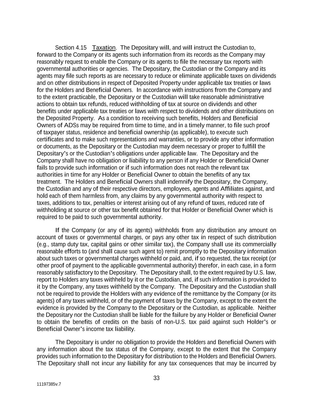 33 11197385v.7 Section 4.15 Taxation. The Depositary will, and will instruct the Custodian to, forward to the Company or its agents such information from its records as the Company may reasonably request to enable the Company or its agents to file the necessary tax reports with governmental authorities or agencies. The Depositary, the Custodian or the Company and its agents may file such reports as are necessary to reduce or eliminate applicable taxes on dividends and on other distributions in respect of Deposited Property under applicable tax treaties or laws for the Holders and Beneficial Owners. In accordance with instructions from the Company and to the extent practicable, the Depositary or the Custodian will take reasonable administrative actions to obtain tax refunds, reduced withholding of tax at source on dividends and other benefits under applicable tax treaties or laws with respect to dividends and other distributions on the Deposited Property. As a condition to receiving such benefits, Holders and Beneficial Owners of ADSs may be required from time to time, and in a timely manner, to file such proof of taxpayer status, residence and beneficial ownership (as applicable), to execute such certificates and to make such representations and warranties, or to provide any other information or documents, as the Depositary or the Custodian may deem necessary or proper to fulfill the Depositary’s or the Custodian’s obligations under applicable law. The Depositary and the Company shall have no obligation or liability to any person if any Holder or Beneficial Owner fails to provide such information or if such information does not reach the relevant tax authorities in time for any Holder or Beneficial Owner to obtain the benefits of any tax treatment. The Holders and Beneficial Owners shall indemnify the Depositary, the Company, the Custodian and any of their respective directors, employees, agents and Affiliates against, and hold each of them harmless from, any claims by any governmental authority with respect to taxes, additions to tax, penalties or interest arising out of any refund of taxes, reduced rate of withholding at source or other tax benefit obtained for that Holder or Beneficial Owner which is required to be paid to such governmental authority. If the Company (or any of its agents) withholds from any distribution any amount on account of taxes or governmental charges, or pays any other tax in respect of such distribution (e.g., stamp duty tax, capital gains or other similar tax), the Company shall use its commercially reasonable efforts to (and shall cause such agent to) remit promptly to the Depositary information about such taxes or governmental charges withheld or paid, and, if so requested, the tax receipt (or other proof of payment to the applicable governmental authority) therefor, in each case, in a form reasonably satisfactory to the Depositary. The Depositary shall, to the extent required by U.S. law, report to Holders any taxes withheld by it or the Custodian, and, if such information is provided to it by the Company, any taxes withheld by the Company. The Depositary and the Custodian shall not be required to provide the Holders with any evidence of the remittance by the Company (or its agents) of any taxes withheld, or of the payment of taxes by the Company, except to the extent the evidence is provided by the Company to the Depositary or the Custodian, as applicable. Neither the Depositary nor the Custodian shall be liable for the failure by any Holder or Beneficial Owner to obtain the benefits of credits on the basis of non-U.S. tax paid against such Holder’s or Beneficial Owner’s income tax liability. The Depositary is under no obligation to provide the Holders and Beneficial Owners with any information about the tax status of the Company, except to the extent that the Company provides such information to the Depositary for distribution to the Holders and Beneficial Owners. The Depositary shall not incur any liability for any tax consequences that may be incurred by