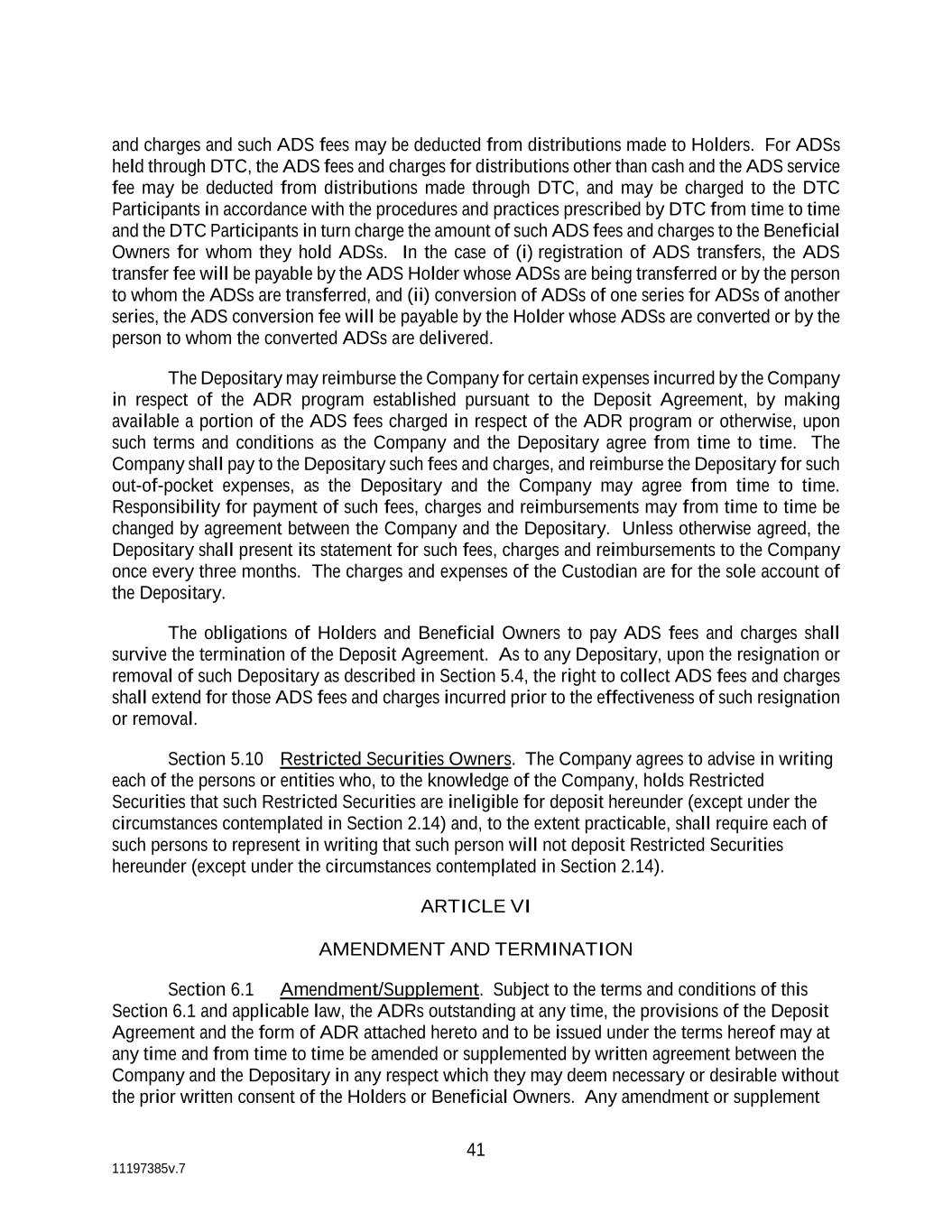 41 11197385v.7 and charges and such ADS fees may be deducted from distributions made to Holders. For ADSs held through DTC, the ADS fees and charges for distributions other than cash and the ADS service fee may be deducted from distributions made through DTC, and may be charged to the DTC Participants in accordance with the procedures and practices prescribed by DTC from time to time and the DTC Participants in turn charge the amount of such ADS fees and charges to the Beneficial Owners for whom they hold ADSs. In the case of (i) registration of ADS transfers, the ADS transfer fee will be payable by the ADS Holder whose ADSs are being transferred or by the person to whom the ADSs are transferred, and (ii) conversion of ADSs of one series for ADSs of another series, the ADS conversion fee will be payable by the Holder whose ADSs are converted or by the person to whom the converted ADSs are delivered. The Depositary may reimburse the Company for certain expenses incurred by the Company in respect of the ADR program established pursuant to the Deposit Agreement, by making available a portion of the ADS fees charged in respect of the ADR program or otherwise, upon such terms and conditions as the Company and the Depositary agree from time to time. The Company shall pay to the Depositary such fees and charges, and reimburse the Depositary for such out-of-pocket expenses, as the Depositary and the Company may agree from time to time. Responsibility for payment of such fees, charges and reimbursements may from time to time be changed by agreement between the Company and the Depositary. Unless otherwise agreed, the Depositary shall present its statement for such fees, charges and reimbursements to the Company once every three months. The charges and expenses of the Custodian are for the sole account of the Depositary. The obligations of Holders and Beneficial Owners to pay ADS fees and charges shall survive the termination of the Deposit Agreement. As to any Depositary, upon the resignation or removal of such Depositary as described in Section 5.4, the right to collect ADS fees and charges shall extend for those ADS fees and charges incurred prior to the effectiveness of such resignation or removal. Section 5.10 Restricted Securities Owners. The Company agrees to advise in writing each of the persons or entities who, to the knowledge of the Company, holds Restricted Securities that such Restricted Securities are ineligible for deposit hereunder (except under the circumstances contemplated in Section 2.14) and, to the extent practicable, shall require each of such persons to represent in writing that such person will not deposit Restricted Securities hereunder (except under the circumstances contemplated in Section 2.14). ARTICLE VI AMENDMENT AND TERMINATION Section 6.1 Amendment/Supplement. Subject to the terms and conditions of this Section 6.1 and applicable law, the ADRs outstanding at any time, the provisions of the Deposit Agreement and the form of ADR attached hereto and to be issued under the terms hereof may at any time and from time to time be amended or supplemented by written agreement between the Company and the Depositary in any respect which they may deem necessary or desirable without the prior written consent of the Holders or Beneficial Owners. Any amendment or supplement
