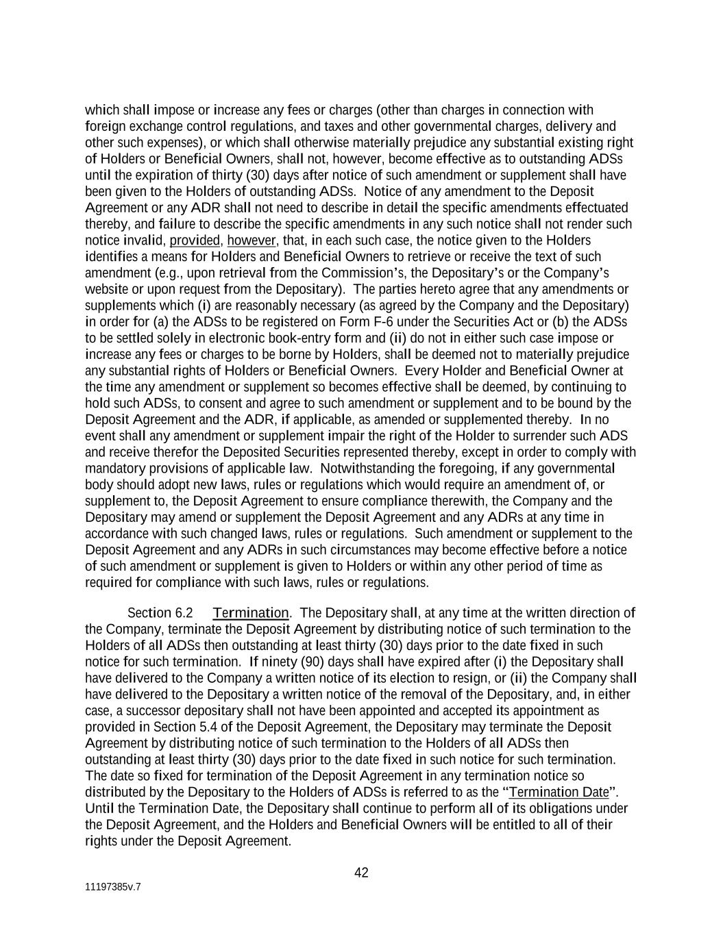 42 11197385v.7 which shall impose or increase any fees or charges (other than charges in connection with foreign exchange control regulations, and taxes and other governmental charges, delivery and other such expenses), or which shall otherwise materially prejudice any substantial existing right of Holders or Beneficial Owners, shall not, however, become effective as to outstanding ADSs until the expiration of thirty (30) days after notice of such amendment or supplement shall have been given to the Holders of outstanding ADSs. Notice of any amendment to the Deposit Agreement or any ADR shall not need to describe in detail the specific amendments effectuated thereby, and failure to describe the specific amendments in any such notice shall not render such notice invalid, provided, however, that, in each such case, the notice given to the Holders identifies a means for Holders and Beneficial Owners to retrieve or receive the text of such amendment (e.g., upon retrieval from the Commission’s, the Depositary’s or the Company’s website or upon request from the Depositary). The parties hereto agree that any amendments or supplements which (i) are reasonably necessary (as agreed by the Company and the Depositary) in order for (a) the ADSs to be registered on Form F-6 under the Securities Act or (b) the ADSs to be settled solely in electronic book-entry form and (ii) do not in either such case impose or increase any fees or charges to be borne by Holders, shall be deemed not to materially prejudice any substantial rights of Holders or Beneficial Owners. Every Holder and Beneficial Owner at the time any amendment or supplement so becomes effective shall be deemed, by continuing to hold such ADSs, to consent and agree to such amendment or supplement and to be bound by the Deposit Agreement and the ADR, if applicable, as amended or supplemented thereby. In no event shall any amendment or supplement impair the right of the Holder to surrender such ADS and receive therefor the Deposited Securities represented thereby, except in order to comply with mandatory provisions of applicable law. Notwithstanding the foregoing, if any governmental body should adopt new laws, rules or regulations which would require an amendment of, or supplement to, the Deposit Agreement to ensure compliance therewith, the Company and the Depositary may amend or supplement the Deposit Agreement and any ADRs at any time in accordance with such changed laws, rules or regulations. Such amendment or supplement to the Deposit Agreement and any ADRs in such circumstances may become effective before a notice of such amendment or supplement is given to Holders or within any other period of time as required for compliance with such laws, rules or regulations. Section 6.2 Termination. The Depositary shall, at any time at the written direction of the Company, terminate the Deposit Agreement by distributing notice of such termination to the Holders of all ADSs then outstanding at least thirty (30) days prior to the date fixed in such notice for such termination. If ninety (90) days shall have expired after (i) the Depositary shall have delivered to the Company a written notice of its election to resign, or (ii) the Company shall have delivered to the Depositary a written notice of the removal of the Depositary, and, in either case, a successor depositary shall not have been appointed and accepted its appointment as provided in Section 5.4 of the Deposit Agreement, the Depositary may terminate the Deposit Agreement by distributing notice of such termination to the Holders of all ADSs then outstanding at least thirty (30) days prior to the date fixed in such notice for such termination. The date so fixed for termination of the Deposit Agreement in any termination notice so distributed by the Depositary to the Holders of ADSs is referred to as the “Termination Date”. Until the Termination Date, the Depositary shall continue to perform all of its obligations under the Deposit Agreement, and the Holders and Beneficial Owners will be entitled to all of their rights under the Deposit Agreement.