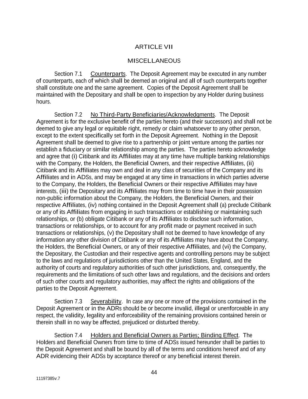 44 11197385v.7 ARTICLE VII MISCELLANEOUS Section 7.1 Counterparts. The Deposit Agreement may be executed in any number of counterparts, each of which shall be deemed an original and all of such counterparts together shall constitute one and the same agreement. Copies of the Deposit Agreement shall be maintained with the Depositary and shall be open to inspection by any Holder during business hours. Section 7.2 No Third-Party Beneficiaries/Acknowledgments. The Deposit Agreement is for the exclusive benefit of the parties hereto (and their successors) and shall not be deemed to give any legal or equitable right, remedy or claim whatsoever to any other person, except to the extent specifically set forth in the Deposit Agreement. Nothing in the Deposit Agreement shall be deemed to give rise to a partnership or joint venture among the parties nor establish a fiduciary or similar relationship among the parties. The parties hereto acknowledge and agree that (i) Citibank and its Affiliates may at any time have multiple banking relationships with the Company, the Holders, the Beneficial Owners, and their respective Affiliates, (ii) Citibank and its Affiliates may own and deal in any class of securities of the Company and its Affiliates and in ADSs, and may be engaged at any time in transactions in which parties adverse to the Company, the Holders, the Beneficial Owners or their respective Affiliates may have interests, (iii) the Depositary and its Affiliates may from time to time have in their possession non-public information about the Company, the Holders, the Beneficial Owners, and their respective Affiliates, (iv) nothing contained in the Deposit Agreement shall (a) preclude Citibank or any of its Affiliates from engaging in such transactions or establishing or maintaining such relationships, or (b) obligate Citibank or any of its Affiliates to disclose such information, transactions or relationships, or to account for any profit made or payment received in such transactions or relationships, (v) the Depositary shall not be deemed to have knowledge of any information any other division of Citibank or any of its Affiliates may have about the Company, the Holders, the Beneficial Owners, or any of their respective Affiliates, and (vi) the Company, the Depositary, the Custodian and their respective agents and controlling persons may be subject to the laws and regulations of jurisdictions other than the United States, England, and the authority of courts and regulatory authorities of such other jurisdictions, and, consequently, the requirements and the limitations of such other laws and regulations, and the decisions and orders of such other courts and regulatory authorities, may affect the rights and obligations of the parties to the Deposit Agreement. Section 7.3 Severability. In case any one or more of the provisions contained in the Deposit Agreement or in the ADRs should be or become invalid, illegal or unenforceable in any respect, the validity, legality and enforceability of the remaining provisions contained herein or therein shall in no way be affected, prejudiced or disturbed thereby. Section 7.4 Holders and Beneficial Owners as Parties; Binding Effect. The Holders and Beneficial Owners from time to time of ADSs issued hereunder shall be parties to the Deposit Agreement and shall be bound by all of the terms and conditions hereof and of any ADR evidencing their ADSs by acceptance thereof or any beneficial interest therein.