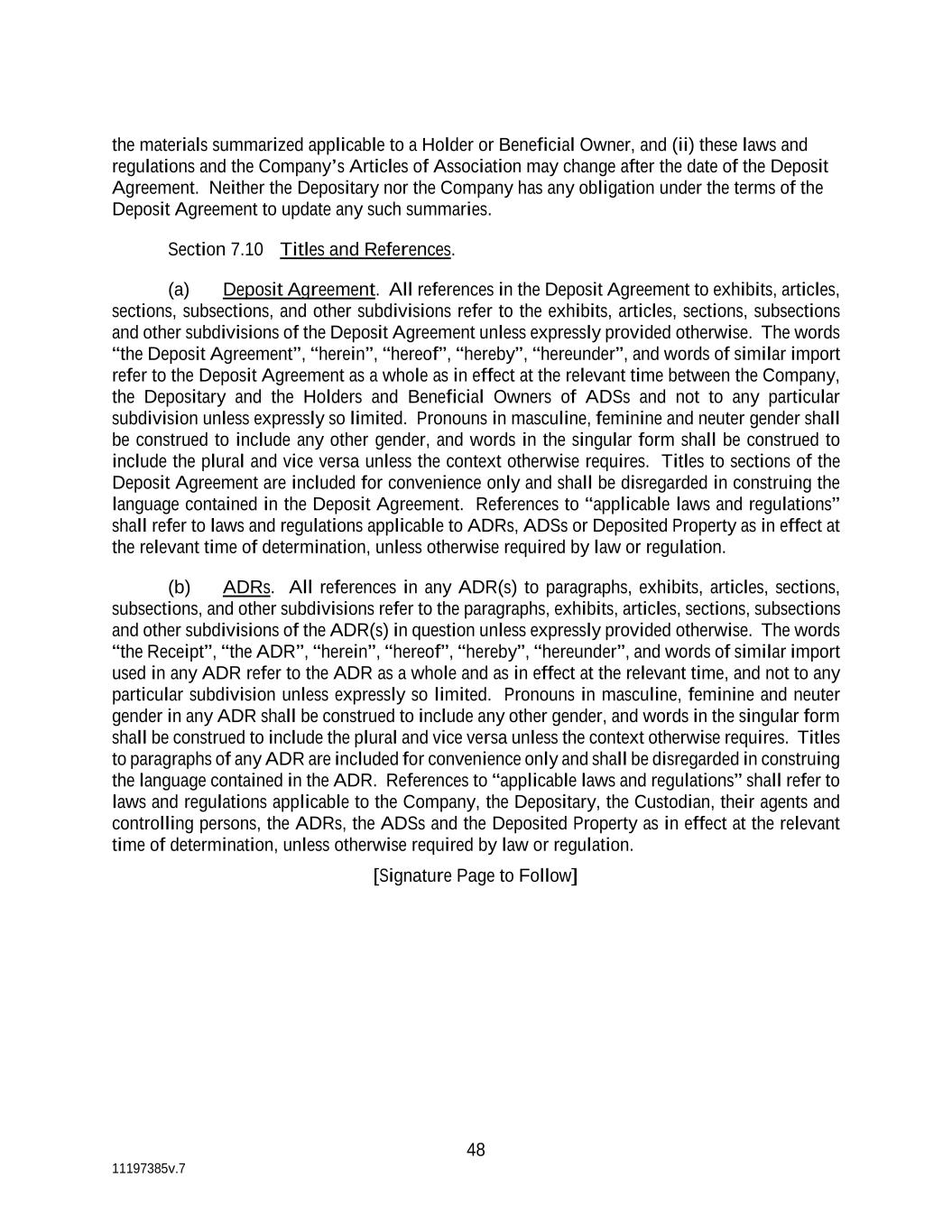 48 11197385v.7 the materials summarized applicable to a Holder or Beneficial Owner, and (ii) these laws and regulations and the Company’s Articles of Association may change after the date of the Deposit Agreement. Neither the Depositary nor the Company has any obligation under the terms of the Deposit Agreement to update any such summaries. Section 7.10 Titles and References. (a) Deposit Agreement. All references in the Deposit Agreement to exhibits, articles, sections, subsections, and other subdivisions refer to the exhibits, articles, sections, subsections and other subdivisions of the Deposit Agreement unless expressly provided otherwise. The words “the Deposit Agreement”, “herein”, “hereof”, “hereby”, “hereunder”, and words of similar import refer to the Deposit Agreement as a whole as in effect at the relevant time between the Company, the Depositary and the Holders and Beneficial Owners of ADSs and not to any particular subdivision unless expressly so limited. Pronouns in masculine, feminine and neuter gender shall be construed to include any other gender, and words in the singular form shall be construed to include the plural and vice versa unless the context otherwise requires. Titles to sections of the Deposit Agreement are included for convenience only and shall be disregarded in construing the language contained in the Deposit Agreement. References to “applicable laws and regulations” shall refer to laws and regulations applicable to ADRs, ADSs or Deposited Property as in effect at the relevant time of determination, unless otherwise required by law or regulation. (b) ADRs. All references in any ADR(s) to paragraphs, exhibits, articles, sections, subsections, and other subdivisions refer to the paragraphs, exhibits, articles, sections, subsections and other subdivisions of the ADR(s) in question unless expressly provided otherwise. The words “the Receipt”, “the ADR”, “herein”, “hereof”, “hereby”, “hereunder”, and words of similar import used in any ADR refer to the ADR as a whole and as in effect at the relevant time, and not to any particular subdivision unless expressly so limited. Pronouns in masculine, feminine and neuter gender in any ADR shall be construed to include any other gender, and words in the singular form shall be construed to include the plural and vice versa unless the context otherwise requires. Titles to paragraphs of any ADR are included for convenience only and shall be disregarded in construing the language contained in the ADR. References to “applicable laws and regulations” shall refer to laws and regulations applicable to the Company, the Depositary, the Custodian, their agents and controlling persons, the ADRs, the ADSs and the Deposited Property as in effect at the relevant time of determination, unless otherwise required by law or regulation. [Signature Page to Follow]