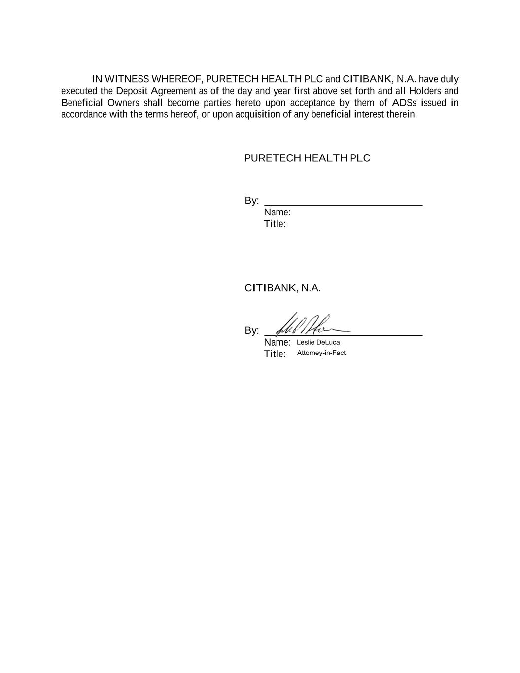 IN WITNESS WHEREOF, PURETECH HEALTH PLC and CITIBANK, N.A. have duly executed the Deposit Agreement as of the day and year first above set forth and all Holders and Beneficial Owners shall become parties hereto upon acceptance by them of ADSs issued in accordance with the terms hereof, or upon acquisition of any beneficial interest therein. PURETECH HEALTH PLC By: _______________________________ Name: Title: CITIBANK, N.A. By: _______________________________ Name: Title: Leslie DeLuca Attorney-in-Fact