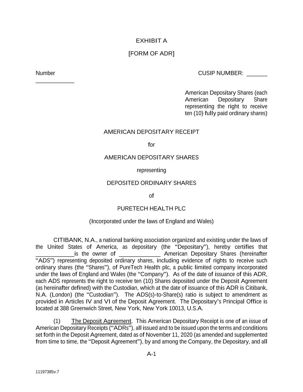 A-1 11197385v.7 EXHIBIT A [FORM OF ADR] Number CUSIP NUMBER: _______ _____________ American Depositary Shares (each American Depositary Share representing the right to receive ten (10) fully paid ordinary shares) AMERICAN DEPOSITARY RECEIPT for AMERICAN DEPOSITARY SHARES representing DEPOSITED ORDINARY SHARES of PURETECH HEALTH PLC (Incorporated under the laws of England and Wales) CITIBANK, N.A., a national banking association organized and existing under the laws of the United States of America, as depositary (the “Depositary”), hereby certifies that _____________is the owner of ______________ American Depositary Shares (hereinafter “ADS”) representing deposited ordinary shares, including evidence of rights to receive such ordinary shares (the “Shares”), of PureTech Health plc, a public limited company incorporated under the laws of England and Wales (the “Company”). As of the date of issuance of this ADR, each ADS represents the right to receive ten (10) Shares deposited under the Deposit Agreement (as hereinafter defined) with the Custodian, which at the date of issuance of this ADR is Citibank, N.A. (London) (the “Custodian”). The ADS(s)-to-Share(s) ratio is subject to amendment as provided in Articles IV and VI of the Deposit Agreement. The Depositary’s Principal Office is located at 388 Greenwich Street, New York, New York 10013, U.S.A. (1) The Deposit Agreement. This American Depositary Receipt is one of an issue of American Depositary Receipts (“ADRs”), all issued and to be issued upon the terms and conditions set forth in the Deposit Agreement, dated as of November 11, 2020 (as amended and supplemented from time to time, the “Deposit Agreement”), by and among the Company, the Depositary, and all