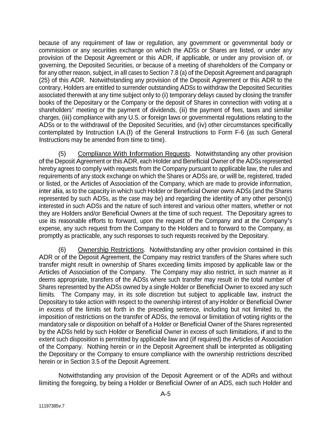 A-5 11197385v.7 because of any requirement of law or regulation, any government or governmental body or commission or any securities exchange on which the ADSs or Shares are listed, or under any provision of the Deposit Agreement or this ADR, if applicable, or under any provision of, or governing, the Deposited Securities, or because of a meeting of shareholders of the Company or for any other reason, subject, in all cases to Section 7.8 (a) of the Deposit Agreement and paragraph (25) of this ADR. Notwithstanding any provision of the Deposit Agreement or this ADR to the contrary, Holders are entitled to surrender outstanding ADSs to withdraw the Deposited Securities associated therewith at any time subject only to (i) temporary delays caused by closing the transfer books of the Depositary or the Company or the deposit of Shares in connection with voting at a shareholders’ meeting or the payment of dividends, (ii) the payment of fees, taxes and similar charges, (iii) compliance with any U.S. or foreign laws or governmental regulations relating to the ADSs or to the withdrawal of the Deposited Securities, and (iv) other circumstances specifically contemplated by Instruction I.A.(l) of the General Instructions to Form F-6 (as such General Instructions may be amended from time to time). (5) Compliance With Information Requests. Notwithstanding any other provision of the Deposit Agreement or this ADR, each Holder and Beneficial Owner of the ADSs represented hereby agrees to comply with requests from the Company pursuant to applicable law, the rules and requirements of any stock exchange on which the Shares or ADSs are, or will be, registered, traded or listed, or the Articles of Association of the Company, which are made to provide information, inter alia, as to the capacity in which such Holder or Beneficial Owner owns ADSs (and the Shares represented by such ADSs, as the case may be) and regarding the identity of any other person(s) interested in such ADSs and the nature of such interest and various other matters, whether or not they are Holders and/or Beneficial Owners at the time of such request. The Depositary agrees to use its reasonable efforts to forward, upon the request of the Company and at the Company’s expense, any such request from the Company to the Holders and to forward to the Company, as promptly as practicable, any such responses to such requests received by the Depositary. (6) Ownership Restrictions. Notwithstanding any other provision contained in this ADR or of the Deposit Agreement, the Company may restrict transfers of the Shares where such transfer might result in ownership of Shares exceeding limits imposed by applicable law or the Articles of Association of the Company. The Company may also restrict, in such manner as it deems appropriate, transfers of the ADSs where such transfer may result in the total number of Shares represented by the ADSs owned by a single Holder or Beneficial Owner to exceed any such limits. The Company may, in its sole discretion but subject to applicable law, instruct the Depositary to take action with respect to the ownership interest of any Holder or Beneficial Owner in excess of the limits set forth in the preceding sentence, including but not limited to, the imposition of restrictions on the transfer of ADSs, the removal or limitation of voting rights or the mandatory sale or disposition on behalf of a Holder or Beneficial Owner of the Shares represented by the ADSs held by such Holder or Beneficial Owner in excess of such limitations, if and to the extent such disposition is permitted by applicable law and (if required) the Articles of Association of the Company. Nothing herein or in the Deposit Agreement shall be interpreted as obligating the Depositary or the Company to ensure compliance with the ownership restrictions described herein or in Section 3.5 of the Deposit Agreement. Notwithstanding any provision of the Deposit Agreement or of the ADRs and without limiting the foregoing, by being a Holder or Beneficial Owner of an ADS, each such Holder and