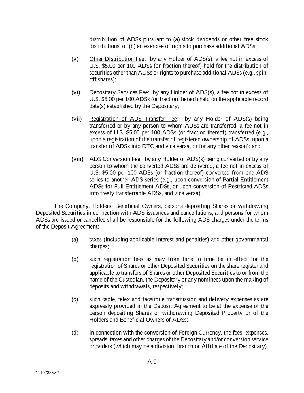 A-9 11197385v.7 distribution of ADSs pursuant to (a) stock dividends or other free stock distributions, or (b) an exercise of rights to purchase additional ADSs; (v) Other Distribution Fee: by any Holder of ADS(s), a fee not in excess of U.S. $5.00 per 100 ADSs (or fraction thereof) held for the distribution of securities other than ADSs or rights to purchase additional ADSs (e.g., spin- off shares); (vi) Depositary Services Fee: by any Holder of ADS(s), a fee not in excess of U.S. $5.00 per 100 ADSs (or fraction thereof) held on the applicable record date(s) established by the Depositary; (vii) Registration of ADS Transfer Fee: by any Holder of ADS(s) being transferred or by any person to whom ADSs are transferred, a fee not in excess of U.S. $5.00 per 100 ADSs (or fraction thereof) transferred (e.g., upon a registration of the transfer of registered ownership of ADSs, upon a transfer of ADSs into DTC and vice versa, or for any other reason); and (viii) ADS Conversion Fee: by any Holder of ADS(s) being converted or by any person to whom the converted ADSs are delivered, a fee not in excess of U.S. $5.00 per 100 ADSs (or fraction thereof) converted from one ADS series to another ADS series (e.g., upon conversion of Partial Entitlement ADSs for Full Entitlement ADSs, or upon conversion of Restricted ADSs into freely transferrable ADSs, and vice versa). The Company, Holders, Beneficial Owners, persons depositing Shares or withdrawing Deposited Securities in connection with ADS issuances and cancellations, and persons for whom ADSs are issued or cancelled shall be responsible for the following ADS charges under the terms of the Deposit Agreement: (a) taxes (including applicable interest and penalties) and other governmental charges; (b) such registration fees as may from time to time be in effect for the registration of Shares or other Deposited Securities on the share register and applicable to transfers of Shares or other Deposited Securities to or from the name of the Custodian, the Depositary or any nominees upon the making of deposits and withdrawals, respectively; (c) such cable, telex and facsimile transmission and delivery expenses as are expressly provided in the Deposit Agreement to be at the expense of the person depositing Shares or withdrawing Deposited Property or of the Holders and Beneficial Owners of ADSs; (d) in connection with the conversion of Foreign Currency, the fees, expenses, spreads, taxes and other charges of the Depositary and/or conversion service providers (which may be a division, branch or Affiliate of the Depositary).