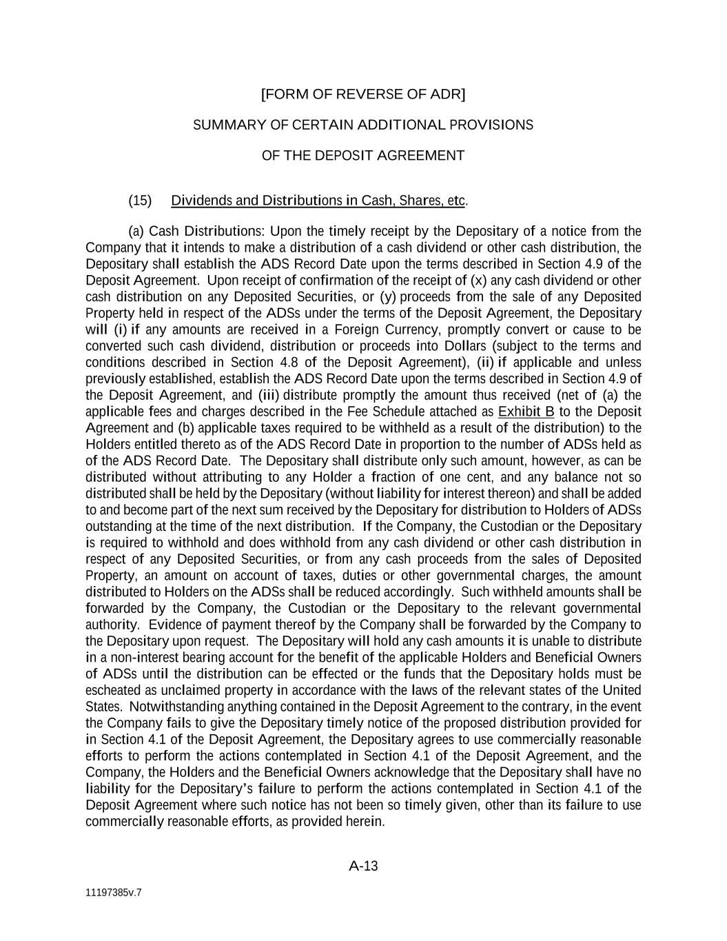 A-13 11197385v.7 [FORM OF REVERSE OF ADR] SUMMARY OF CERTAIN ADDITIONAL PROVISIONS OF THE DEPOSIT AGREEMENT (15) Dividends and Distributions in Cash, Shares, etc. (a) Cash Distributions: Upon the timely receipt by the Depositary of a notice from the Company that it intends to make a distribution of a cash dividend or other cash distribution, the Depositary shall establish the ADS Record Date upon the terms described in Section 4.9 of the Deposit Agreement. Upon receipt of confirmation of the receipt of (x) any cash dividend or other cash distribution on any Deposited Securities, or (y) proceeds from the sale of any Deposited Property held in respect of the ADSs under the terms of the Deposit Agreement, the Depositary will (i) if any amounts are received in a Foreign Currency, promptly convert or cause to be converted such cash dividend, distribution or proceeds into Dollars (subject to the terms and conditions described in Section 4.8 of the Deposit Agreement), (ii) if applicable and unless previously established, establish the ADS Record Date upon the terms described in Section 4.9 of the Deposit Agreement, and (iii) distribute promptly the amount thus received (net of (a) the applicable fees and charges described in the Fee Schedule attached as Exhibit B to the Deposit Agreement and (b) applicable taxes required to be withheld as a result of the distribution) to the Holders entitled thereto as of the ADS Record Date in proportion to the number of ADSs held as of the ADS Record Date. The Depositary shall distribute only such amount, however, as can be distributed without attributing to any Holder a fraction of one cent, and any balance not so distributed shall be held by the Depositary (without liability for interest thereon) and shall be added to and become part of the next sum received by the Depositary for distribution to Holders of ADSs outstanding at the time of the next distribution. If the Company, the Custodian or the Depositary is required to withhold and does withhold from any cash dividend or other cash distribution in respect of any Deposited Securities, or from any cash proceeds from the sales of Deposited Property, an amount on account of taxes, duties or other governmental charges, the amount distributed to Holders on the ADSs shall be reduced accordingly. Such withheld amounts shall be forwarded by the Company, the Custodian or the Depositary to the relevant governmental authority. Evidence of payment thereof by the Company shall be forwarded by the Company to the Depositary upon request. The Depositary will hold any cash amounts it is unable to distribute in a non-interest bearing account for the benefit of the applicable Holders and Beneficial Owners of ADSs until the distribution can be effected or the funds that the Depositary holds must be escheated as unclaimed property in accordance with the laws of the relevant states of the United States. Notwithstanding anything contained in the Deposit Agreement to the contrary, in the event the Company fails to give the Depositary timely notice of the proposed distribution provided for in Section 4.1 of the Deposit Agreement, the Depositary agrees to use commercially reasonable efforts to perform the actions contemplated in Section 4.1 of the Deposit Agreement, and the Company, the Holders and the Beneficial Owners acknowledge that the Depositary shall have no liability for the Depositary’s failure to perform the actions contemplated in Section 4.1 of the Deposit Agreement where such notice has not been so timely given, other than its failure to use commercially reasonable efforts, as provided herein.