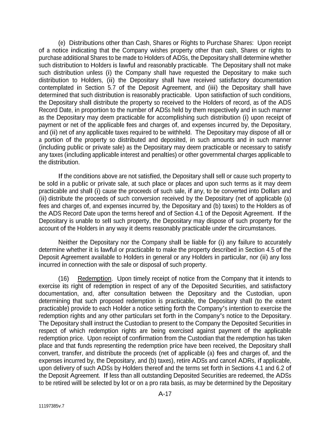 A-17 11197385v.7 (e) Distributions other than Cash, Shares or Rights to Purchase Shares: Upon receipt of a notice indicating that the Company wishes property other than cash, Shares or rights to purchase additional Shares to be made to Holders of ADSs, the Depositary shall determine whether such distribution to Holders is lawful and reasonably practicable. The Depositary shall not make such distribution unless (i) the Company shall have requested the Depositary to make such distribution to Holders, (ii) the Depositary shall have received satisfactory documentation contemplated in Section 5.7 of the Deposit Agreement, and (iii) the Depositary shall have determined that such distribution is reasonably practicable. Upon satisfaction of such conditions, the Depositary shall distribute the property so received to the Holders of record, as of the ADS Record Date, in proportion to the number of ADSs held by them respectively and in such manner as the Depositary may deem practicable for accomplishing such distribution (i) upon receipt of payment or net of the applicable fees and charges of, and expenses incurred by, the Depositary, and (ii) net of any applicable taxes required to be withheld. The Depositary may dispose of all or a portion of the property so distributed and deposited, in such amounts and in such manner (including public or private sale) as the Depositary may deem practicable or necessary to satisfy any taxes (including applicable interest and penalties) or other governmental charges applicable to the distribution. If the conditions above are not satisfied, the Depositary shall sell or cause such property to be sold in a public or private sale, at such place or places and upon such terms as it may deem practicable and shall (i) cause the proceeds of such sale, if any, to be converted into Dollars and (ii) distribute the proceeds of such conversion received by the Depositary (net of applicable (a) fees and charges of, and expenses incurred by, the Depositary and (b) taxes) to the Holders as of the ADS Record Date upon the terms hereof and of Section 4.1 of the Deposit Agreement. If the Depositary is unable to sell such property, the Depositary may dispose of such property for the account of the Holders in any way it deems reasonably practicable under the circumstances. Neither the Depositary nor the Company shall be liable for (i) any failure to accurately determine whether it is lawful or practicable to make the property described in Section 4.5 of the Deposit Agreement available to Holders in general or any Holders in particular, nor (ii) any loss incurred in connection with the sale or disposal of such property. (16) Redemption. Upon timely receipt of notice from the Company that it intends to exercise its right of redemption in respect of any of the Deposited Securities, and satisfactory documentation, and, after consultation between the Depositary and the Custodian, upon determining that such proposed redemption is practicable, the Depositary shall (to the extent practicable) provide to each Holder a notice setting forth the Company’s intention to exercise the redemption rights and any other particulars set forth in the Company’s notice to the Depositary. The Depositary shall instruct the Custodian to present to the Company the Deposited Securities in respect of which redemption rights are being exercised against payment of the applicable redemption price. Upon receipt of confirmation from the Custodian that the redemption has taken place and that funds representing the redemption price have been received, the Depositary shall convert, transfer, and distribute the proceeds (net of applicable (a) fees and charges of, and the expenses incurred by, the Depositary, and (b) taxes), retire ADSs and cancel ADRs, if applicable, upon delivery of such ADSs by Holders thereof and the terms set forth in Sections 4.1 and 6.2 of the Deposit Agreement. If less than all outstanding Deposited Securities are redeemed, the ADSs to be retired will be selected by lot or on a pro rata basis, as may be determined by the Depositary