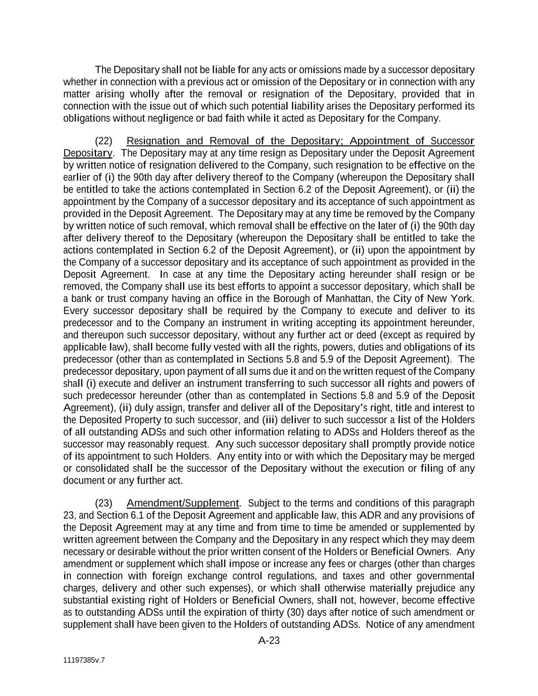 A-23 11197385v.7 The Depositary shall not be liable for any acts or omissions made by a successor depositary whether in connection with a previous act or omission of the Depositary or in connection with any matter arising wholly after the removal or resignation of the Depositary, provided that in connection with the issue out of which such potential liability arises the Depositary performed its obligations without negligence or bad faith while it acted as Depositary for the Company. (22) Resignation and Removal of the Depositary; Appointment of Successor Depositary. The Depositary may at any time resign as Depositary under the Deposit Agreement by written notice of resignation delivered to the Company, such resignation to be effective on the earlier of (i) the 90th day after delivery thereof to the Company (whereupon the Depositary shall be entitled to take the actions contemplated in Section 6.2 of the Deposit Agreement), or (ii) the appointment by the Company of a successor depositary and its acceptance of such appointment as provided in the Deposit Agreement. The Depositary may at any time be removed by the Company by written notice of such removal, which removal shall be effective on the later of (i) the 90th day after delivery thereof to the Depositary (whereupon the Depositary shall be entitled to take the actions contemplated in Section 6.2 of the Deposit Agreement), or (ii) upon the appointment by the Company of a successor depositary and its acceptance of such appointment as provided in the Deposit Agreement. In case at any time the Depositary acting hereunder shall resign or be removed, the Company shall use its best efforts to appoint a successor depositary, which shall be a bank or trust company having an office in the Borough of Manhattan, the City of New York. Every successor depositary shall be required by the Company to execute and deliver to its predecessor and to the Company an instrument in writing accepting its appointment hereunder, and thereupon such successor depositary, without any further act or deed (except as required by applicable law), shall become fully vested with all the rights, powers, duties and obligations of its predecessor (other than as contemplated in Sections 5.8 and 5.9 of the Deposit Agreement). The predecessor depositary, upon payment of all sums due it and on the written request of the Company shall (i) execute and deliver an instrument transferring to such successor all rights and powers of such predecessor hereunder (other than as contemplated in Sections 5.8 and 5.9 of the Deposit Agreement), (ii) duly assign, transfer and deliver all of the Depositary’s right, title and interest to the Deposited Property to such successor, and (iii) deliver to such successor a list of the Holders of all outstanding ADSs and such other information relating to ADSs and Holders thereof as the successor may reasonably request. Any such successor depositary shall promptly provide notice of its appointment to such Holders. Any entity into or with which the Depositary may be merged or consolidated shall be the successor of the Depositary without the execution or filing of any document or any further act. (23) Amendment/Supplement. Subject to the terms and conditions of this paragraph 23, and Section 6.1 of the Deposit Agreement and applicable law, this ADR and any provisions of the Deposit Agreement may at any time and from time to time be amended or supplemented by written agreement between the Company and the Depositary in any respect which they may deem necessary or desirable without the prior written consent of the Holders or Beneficial Owners. Any amendment or supplement which shall impose or increase any fees or charges (other than charges in connection with foreign exchange control regulations, and taxes and other governmental charges, delivery and other such expenses), or which shall otherwise materially prejudice any substantial existing right of Holders or Beneficial Owners, shall not, however, become effective as to outstanding ADSs until the expiration of thirty (30) days after notice of such amendment or supplement shall have been given to the Holders of outstanding ADSs. Notice of any amendment