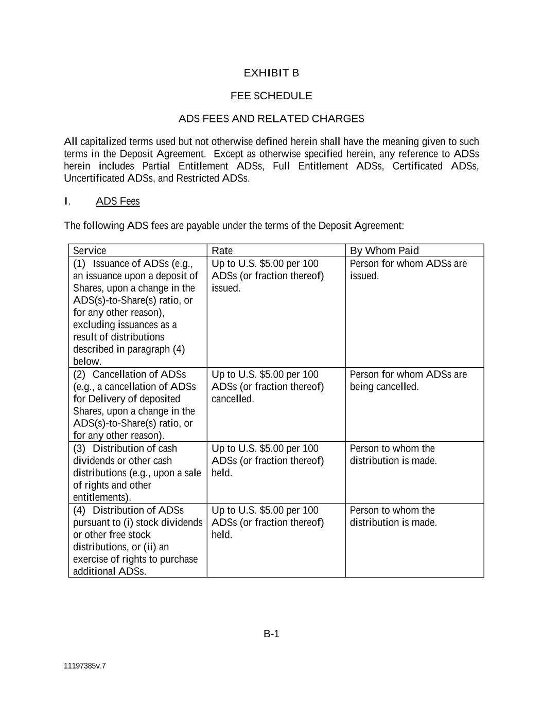 B-1 11197385v.7 EXHIBIT B FEE SCHEDULE ADS FEES AND RELATED CHARGES All capitalized terms used but not otherwise defined herein shall have the meaning given to such terms in the Deposit Agreement. Except as otherwise specified herein, any reference to ADSs herein includes Partial Entitlement ADSs, Full Entitlement ADSs, Certificated ADSs, Uncertificated ADSs, and Restricted ADSs. I. ADS Fees The following ADS fees are payable under the terms of the Deposit Agreement: Service Rate By Whom Paid (1) Issuance of ADSs (e.g., an issuance upon a deposit of Shares, upon a change in the ADS(s)-to-Share(s) ratio, or for any other reason), excluding issuances as a result of distributions described in paragraph (4) below. Up to U.S. $5.00 per 100 ADSs (or fraction thereof) issued. Person for whom ADSs are issued. (2) Cancellation of ADSs (e.g., a cancellation of ADSs for Delivery of deposited Shares, upon a change in the ADS(s)-to-Share(s) ratio, or for any other reason). Up to U.S. $5.00 per 100 ADSs (or fraction thereof) cancelled. Person for whom ADSs are being cancelled. (3) Distribution of cash dividends or other cash distributions (e.g., upon a sale of rights and other entitlements). Up to U.S. $5.00 per 100 ADSs (or fraction thereof) held. Person to whom the distribution is made. (4) Distribution of ADSs pursuant to (i) stock dividends or other free stock distributions, or (ii) an exercise of rights to purchase additional ADSs. Up to U.S. $5.00 per 100 ADSs (or fraction thereof) held. Person to whom the distribution is made.