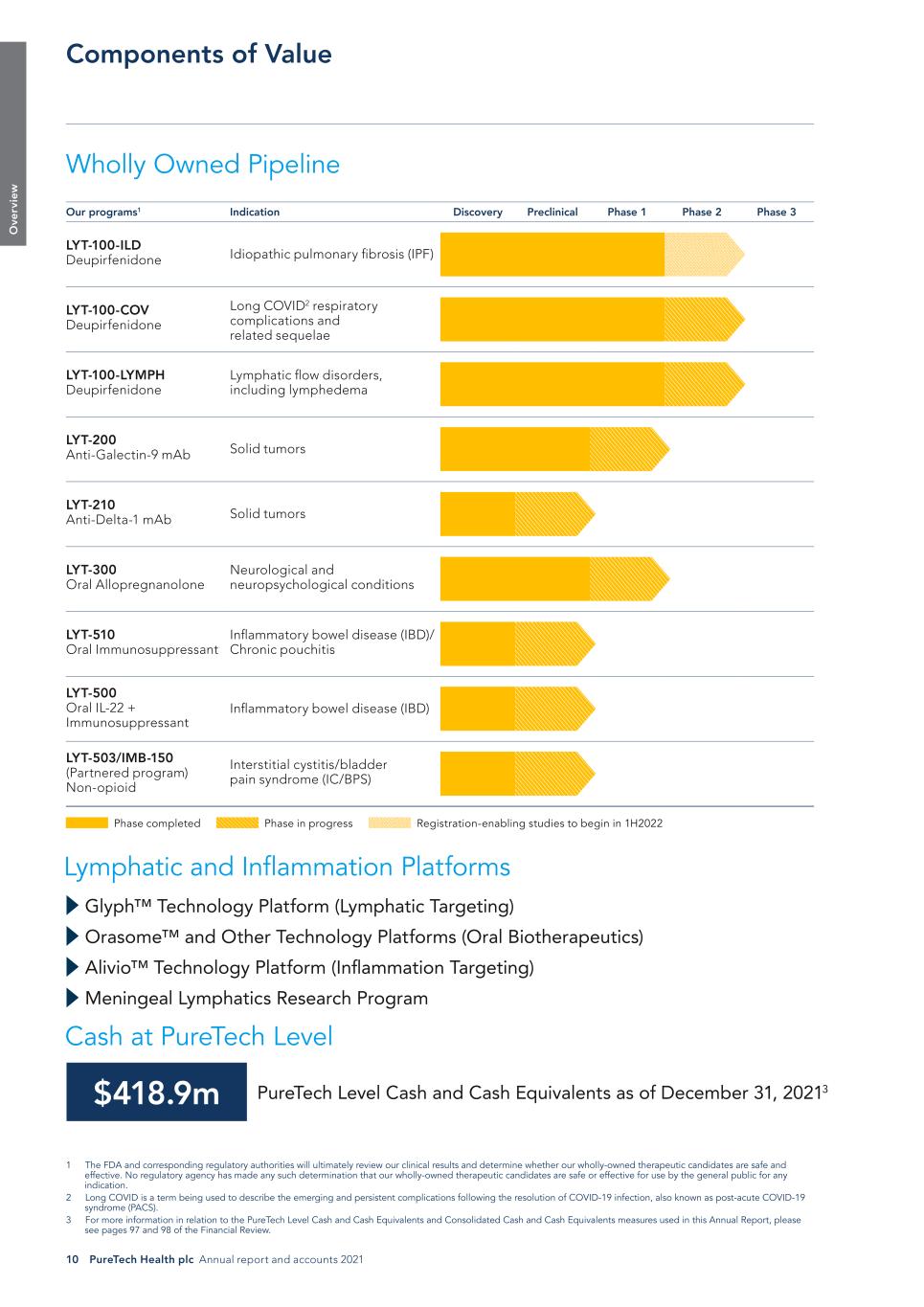 10 PureTech Health plc Annual report and accounts 2021 O ve rv ie w Components of Value 1 The FDA and corresponding regulatory authorities will ultimately review our clinical results and determine whether our wholly-owned therapeutic candidates are safe and effective. No regulatory agency has made any such determination that our wholly-owned therapeutic candidates are safe or effective for use by the general public for any indication. 2 Long COVID is a term being used to describe the emerging and persistent complications following the resolution of COVID-19 infection, also known as post-acute COVID-19 syndrome (PACS). 3 For more information in relation to the PureTech Level Cash and Cash Equivalents and Consolidated Cash and Cash Equivalents measures used in this Annual Report, please see pages 97 and 98 of the Financial Review. Wholly Owned Pipeline PureTech Level Cash and Cash Equivalents as of December 31, 20213$418.9m Glyph™ Technology Platform (Lymphatic Targeting) Orasome™ and Other Technology Platforms (Oral Biotherapeutics) Alivio™ Technology Platform (Inflammation Targeting) Meningeal Lymphatics Research Program Lymphatic and Inflammation Platforms Cash at PureTech Level Our programs1 Indication Discovery Preclinical Phase 1 Phase 2 Phase 3 LYT-100-ILD Deupirfenidone Idiopathic pulmonary fibrosis (IPF) LYT-100-COV Deupirfenidone Long COVID2 respiratory complications and related sequelae LYT-100-LYMPH Deupirfenidone Lymphatic flow disorders, including lymphedema LYT-200 Anti-Galectin-9 mAb Solid tumors LYT-210 Anti-Delta-1 mAb Solid tumors LYT-300 Oral Allopregnanolone Neurological and neuropsychological conditions LYT-510 Oral Immunosuppressant Inflammatory bowel disease (IBD)/ Chronic pouchitis LYT-500 Oral IL-22 + Immunosuppressant Inflammatory bowel disease (IBD) LYT-503/IMB-150 (Partnered program) Non-opioid Interstitial cystitis/bladder pain syndrome (IC/BPS) Registration-enabling studies to begin in 1H2022Phase completed Phase in progress