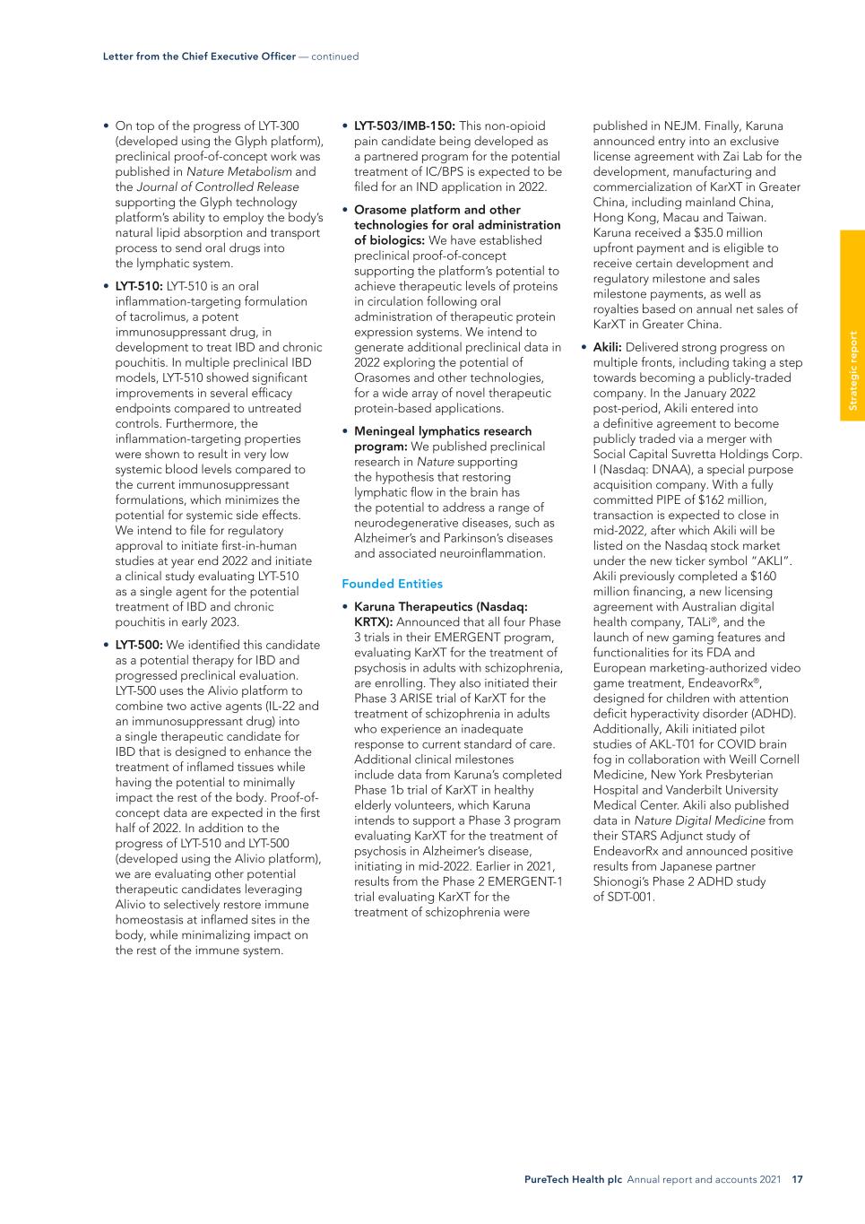 PureTech Health plc Annual report and accounts 2021 17 St ra te g ic r ep o rt published in NEJM. Finally, Karuna announced entry into an exclusive license agreement with Zai Lab for the development, manufacturing and commercialization of KarXT in Greater China, including mainland China, Hong Kong, Macau and Taiwan. Karuna received a $35.0 million upfront payment and is eligible to receive certain development and regulatory milestone and sales milestone payments, as well as royalties based on annual net sales of KarXT in Greater China. • Akili: Delivered strong progress on multiple fronts, including taking a step towards becoming a publicly-traded company. In the January 2022 post-period, Akili entered into a definitive agreement to become publicly traded via a merger with Social Capital Suvretta Holdings Corp. I (Nasdaq: DNAA), a special purpose acquisition company. With a fully committed PIPE of $162 million, transaction is expected to close in mid-2022, after which Akili will be listed on the Nasdaq stock market under the new ticker symbol “AKLI”. Akili previously completed a $160 million financing, a new licensing agreement with Australian digital health company, TALi®, and the launch of new gaming features and functionalities for its FDA and European marketing-authorized video game treatment, EndeavorRx®, designed for children with attention deficit hyperactivity disorder (ADHD). Additionally, Akili initiated pilot studies of AKL-T01 for COVID brain fog in collaboration with Weill Cornell Medicine, New York Presbyterian Hospital and Vanderbilt University Medical Center. Akili also published data in Nature Digital Medicine from their STARS Adjunct study of EndeavorRx and announced positive results from Japanese partner Shionogi’s Phase 2 ADHD study of SDT-001. • LYT-503/IMB-150: This non-opioid pain candidate being developed as a partnered program for the potential treatment of IC/BPS is expected to be filed for an IND application in 2022. • Orasome platform and other technologies for oral administration of biologics: We have established preclinical proof-of-concept supporting the platform’s potential to achieve therapeutic levels of proteins in circulation following oral administration of therapeutic protein expression systems. We intend to generate additional preclinical data in 2022 exploring the potential of Orasomes and other technologies, for a wide array of novel therapeutic protein-based applications. • Meningeal lymphatics research program: We published preclinical research in Nature supporting the hypothesis that restoring lymphatic flow in the brain has the potential to address a range of neurodegenerative diseases, such as Alzheimer’s and Parkinson’s diseases and associated neuroinflammation. Founded Entities • Karuna Therapeutics (Nasdaq: KRTX): Announced that all four Phase 3 trials in their EMERGENT program, evaluating KarXT for the treatment of psychosis in adults with schizophrenia, are enrolling. They also initiated their Phase 3 ARISE trial of KarXT for the treatment of schizophrenia in adults who experience an inadequate response to current standard of care. Additional clinical milestones include data from Karuna’s completed Phase 1b trial of KarXT in healthy elderly volunteers, which Karuna intends to support a Phase 3 program evaluating KarXT for the treatment of psychosis in Alzheimer’s disease, initiating in mid-2022. Earlier in 2021, results from the Phase 2 EMERGENT-1 trial evaluating KarXT for the treatment of schizophrenia were • On top of the progress of LYT-300 (developed using the Glyph platform), preclinical proof-of-concept work was published in Nature Metabolism and the Journal of Controlled Release supporting the Glyph technology platform’s ability to employ the body’s natural lipid absorption and transport process to send oral drugs into the lymphatic system. • LYT-510: LYT-510 is an oral inflammation-targeting formulation of tacrolimus, a potent immunosuppressant drug, in development to treat IBD and chronic pouchitis. In multiple preclinical IBD models, LYT-510 showed significant improvements in several efficacy endpoints compared to untreated controls. Furthermore, the inflammation-targeting properties were shown to result in very low systemic blood levels compared to the current immunosuppressant formulations, which minimizes the potential for systemic side effects. We intend to file for regulatory approval to initiate first-in-human studies at year end 2022 and initiate a clinical study evaluating LYT-510 as a single agent for the potential treatment of IBD and chronic pouchitis in early 2023. • LYT-500: We identified this candidate as a potential therapy for IBD and progressed preclinical evaluation. LYT-500 uses the Alivio platform to combine two active agents (IL-22 and an immunosuppressant drug) into a single therapeutic candidate for IBD that is designed to enhance the treatment of inflamed tissues while having the potential to minimally impact the rest of the body. Proof-of- concept data are expected in the first half of 2022. In addition to the progress of LYT-510 and LYT-500 (developed using the Alivio platform), we are evaluating other potential therapeutic candidates leveraging Alivio to selectively restore immune homeostasis at inflamed sites in the body, while minimalizing impact on the rest of the immune system. Letter from the Chief Executive Officer — continued
