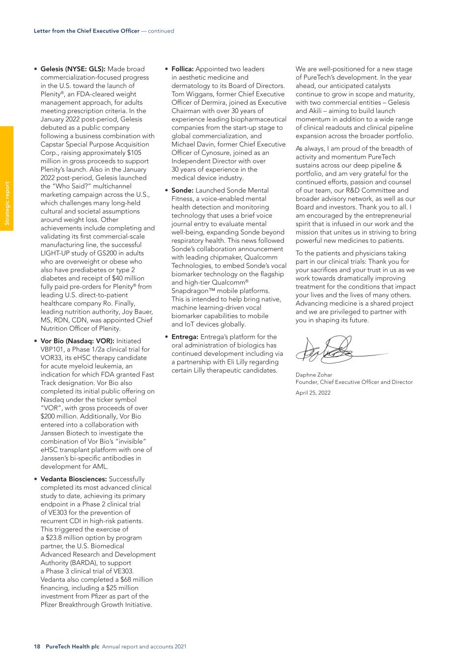 18 PureTech Health plc Annual report and accounts 2021 St ra te g ic r ep o rt We are well-positioned for a new stage of PureTech’s development. In the year ahead, our anticipated catalysts continue to grow in scope and maturity, with two commercial entities – Gelesis and Akili – aiming to build launch momentum in addition to a wide range of clinical readouts and clinical pipeline expansion across the broader portfolio. As always, I am proud of the breadth of activity and momentum PureTech sustains across our deep pipeline & portfolio, and am very grateful for the continued efforts, passion and counsel of our team, our R&D Committee and broader advisory network, as well as our Board and investors. Thank you to all. I am encouraged by the entrepreneurial spirit that is infused in our work and the mission that unites us in striving to bring powerful new medicines to patients. To the patients and physicians taking part in our clinical trials: Thank you for your sacrifices and your trust in us as we work towards dramatically improving treatment for the conditions that impact your lives and the lives of many others. Advancing medicine is a shared project and we are privileged to partner with you in shaping its future. Daphne Zohar Founder, Chief Executive Officer and Director April 25, 2022 • Follica: Appointed two leaders in aesthetic medicine and dermatology to its Board of Directors. Tom Wiggans, former Chief Executive Officer of Dermira, joined as Executive Chairman with over 30 years of experience leading biopharmaceutical companies from the start-up stage to global commercialization, and Michael Davin, former Chief Executive Officer of Cynosure, joined as an Independent Director with over 30 years of experience in the medical device industry. • Sonde: Launched Sonde Mental Fitness, a voice-enabled mental health detection and monitoring technology that uses a brief voice journal entry to evaluate mental well-being, expanding Sonde beyond respiratory health. This news followed Sonde’s collaboration announcement with leading chipmaker, Qualcomm Technologies, to embed Sonde’s vocal biomarker technology on the flagship and high-tier Qualcomm® Snapdragon™ mobile platforms. This is intended to help bring native, machine learning-driven vocal biomarker capabilities to mobile and IoT devices globally. • Entrega: Entrega’s platform for the oral administration of biologics has continued development including via a partnership with Eli Lilly regarding certain Lilly therapeutic candidates. • Gelesis (NYSE: GLS): Made broad commercialization-focused progress in the U.S. toward the launch of Plenity®, an FDA-cleared weight management approach, for adults meeting prescription criteria. In the January 2022 post-period, Gelesis debuted as a public company following a business combination with Capstar Special Purpose Acquisition Corp., raising approximately $105 million in gross proceeds to support Plenity’s launch. Also in the January 2022 post-period, Gelesis launched the “Who Said?” multichannel marketing campaign across the U.S., which challenges many long-held cultural and societal assumptions around weight loss. Other achievements include completing and validating its first commercial-scale manufacturing line, the successful LIGHT-UP study of GS200 in adults who are overweight or obese who also have prediabetes or type 2 diabetes and receipt of $40 million fully paid pre-orders for Plenity® from leading U.S. direct-to-patient healthcare company Ro. Finally, leading nutrition authority, Joy Bauer, MS, RDN, CDN, was appointed Chief Nutrition Officer of Plenity. • Vor Bio (Nasdaq: VOR): Initiated VBP101, a Phase 1/2a clinical trial for VOR33, its eHSC therapy candidate for acute myeloid leukemia, an indication for which FDA granted Fast Track designation. Vor Bio also completed its initial public offering on Nasdaq under the ticker symbol “VOR”, with gross proceeds of over $200 million. Additionally, Vor Bio entered into a collaboration with Janssen Biotech to investigate the combination of Vor Bio’s “invisible” eHSC transplant platform with one of Janssen’s bi-specific antibodies in development for AML. • Vedanta Biosciences: Successfully completed its most advanced clinical study to date, achieving its primary endpoint in a Phase 2 clinical trial of VE303 for the prevention of recurrent CDI in high-risk patients. This triggered the exercise of a $23.8 million option by program partner, the U.S. Biomedical Advanced Research and Development Authority (BARDA), to support a Phase 3 clinical trial of VE303. Vedanta also completed a $68 million financing, including a $25 million investment from Pfizer as part of the Pfizer Breakthrough Growth Initiative. Letter from the Chief Executive Officer — continued