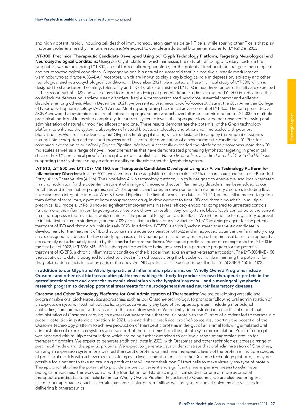 PureTech Health plc Annual report and accounts 2021 27 St ra te g ic r ep o rt How PureTech is building value for investors — continued and highly potent, rapidly inducing cell death of immunomodulatory gamma delta-1 T cells, while sparing other T cells that play important roles in a healthy immune response. We expect to complete additional biomarker studies for LYT-210 in 2022. LYT-300, Preclinical Therapeutic Candidate Developed Using our Glyph Technology Platform, Targeting Neurological and Neuropsychological Conditions: Using our Glyph platform, which harnesses the natural trafficking of dietary lipids via the lymphatics, we are advancing LYT-300, an oral form of allopregnanolone, for the potential treatment for a range of neurological and neuropsychological conditions. Allopregnanolone is a natural neurosteroid that is a positive allosteric modulator of γ-aminobutyric-acid type A (GABAA) receptors, which are known to play a key biological role in depression, epilepsy and other neurological and neuropsychological conditions. In December 2021, we initiated a Phase 1 clinical study of LYT-300, which is designed to characterize the safety, tolerability and PK of orally administered LYT-300 in healthy volunteers. Results are expected in the second half of 2022 and will be used to inform the design of possible future studies evaluating LYT-300 in indications that could include depression, anxiety, sleep disorders, fragile X tremor-associated syndrome, essential tremor and epileptic disorders, among others. Also in December 2021, we presented preclinical proof-of-concept data at the 60th American College of Neuropsychopharmacology (ACNP) Annual Meeting supporting the clinical advancement of LYT-300. The data presented at ACNP showed that systemic exposure of natural allopregnanolone was achieved after oral administration of LYT-300 in multiple preclinical models of increasing complexity. In contrast, systemic levels of allopregnanolone were not observed following oral administration of natural unmodified allopregnanolone. These results demonstrate the potential of the Glyph technology platform to enhance the systemic absorption of natural bioactive molecules and other small molecules with poor oral bioavailability. We are also advancing our Glyph technology platform, which is designed to employ the lymphatic system’s natural lipid absorption and transport process and has led to the nomination of a new therapeutic candidate, LYT-300, for continued expansion of our Wholly Owned Pipeline. We have successfully extended the platform to encompass more than 20 molecules as well as a range of novel linker chemistries that have demonstrated promising lymphatic targeting in preclinical studies. In 2021, preclinical proof-of-concept work was published in Nature Metabolism and the Journal of Controlled Release supporting the Glyph technology platform’s ability to directly target the lymphatic system. LYT-510, LYT-500 and LYT-503/IMB-150, our Therapeutic Candidates Developed Using our Alivio Technology Platform for Inflammatory Disorders: In June 2021, we announced the acquisition of the remaining 22% of shares outstanding in our Founded Entity, Alivio Therapeutics (Alivio). The underlying Alivio technology platform, which is designed to enable oral and locally targeted immunomodulation for the potential treatment of a range of chronic and acute inflammatory disorders, has been added to our lymphatic and inflammation programs. Alivio’s therapeutic candidates, in development for inflammatory disorders including IBD, have also been integrated into our Wholly Owned Pipeline. The first of these candidates is LYT-510, an oral inflammation-targeting formulation of tacrolimus, a potent immunosuppressant drug, in development to treat IBD and chronic pouchitis. In multiple preclinical IBD models, LYT-510 showed significant improvements in several efficacy endpoints compared to untreated controls. Furthermore, the inflammation-targeting properties were shown to result in very low systemic blood levels compared to the current immunosuppressant formulations, which minimizes the potential for systemic side effects. We intend to file for regulatory approval to initiate first-in-human studies at year end 2022 and initiate a clinical study evaluating LYT-510 as a single agent for the potential treatment of IBD and chronic pouchitis in early 2023. In addition, LYT-500 is an orally-administered therapeutic candidate in development for the treatment of IBD that contains a unique combination of IL-22 and an approved potent anti-inflammatory drug and is designed to address the key underlying causes of IBD pathogenesis and progression, such as mucosal barrier disruption that are currently not adequately treated by the standard of care medicines. We expect preclinical proof-of-concept data for LYT-500 in the first half of 2022. LYT-503/IMB-150 is a therapeutic candidate being advanced as a partnered program for the potential treatment of IC/BPS, a chronic inflammatory condition of the bladder that lacks an effective treatment option. The LYT-503/IMB-150 therapeutic candidate is designed to selectively treat inflamed tissues along the bladder wall while minimizing the potential for drug-related side effects in healthy parts of the body. An IND application is expected to be filed for LYT-503/IMB-150 in 2022. In addition to our Glyph and Alivio lymphatic and inflammation platforms, our Wholly Owned Programs include Orasome and other oral biotherapeutics platforms enabling the body to produce its own therapeutic protein in the gastrointestinal tract and enter the systemic circulation via the lymphatic system – and a meningeal lymphatics research program to develop potential treatments for neurodegenerative and neuroinflammatory diseases. Orasome and Other Technology Platforms for Oral Administration of Therapeutics: We are developing versatile and programmable oral biotherapeutics approaches, such as our Orasome techn