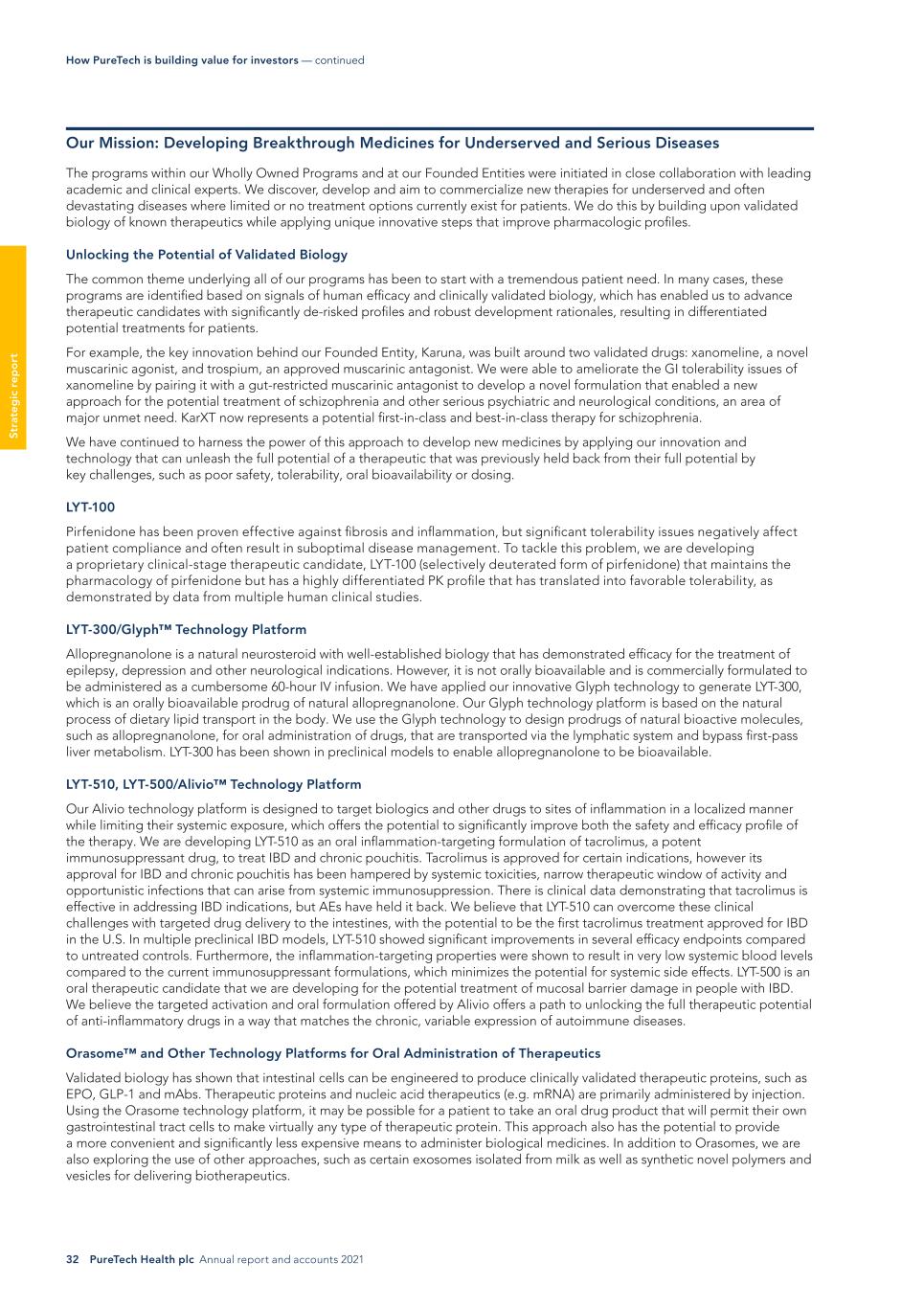 32 PureTech Health plc Annual report and accounts 2021 St ra te g ic r ep o rt Our Mission: Developing Breakthrough Medicines for Underserved and Serious Diseases The programs within our Wholly Owned Programs and at our Founded Entities were initiated in close collaboration with leading academic and clinical experts. We discover, develop and aim to commercialize new therapies for underserved and often devastating diseases where limited or no treatment options currently exist for patients. We do this by building upon validated biology of known therapeutics while applying unique innovative steps that improve pharmacologic profiles. Unlocking the Potential of Validated Biology The common theme underlying all of our programs has been to start with a tremendous patient need. In many cases, these programs are identified based on signals of human efficacy and clinically validated biology, which has enabled us to advance therapeutic candidates with significantly de-risked profiles and robust development rationales, resulting in differentiated potential treatments for patients. For example, the key innovation behind our Founded Entity, Karuna, was built around two validated drugs: xanomeline, a novel muscarinic agonist, and trospium, an approved muscarinic antagonist. We were able to ameliorate the GI tolerability issues of xanomeline by pairing it with a gut-restricted muscarinic antagonist to develop a novel formulation that enabled a new approach for the potential treatment of schizophrenia and other serious psychiatric and neurological conditions, an area of major unmet need. KarXT now represents a potential first-in-class and best-in-class therapy for schizophrenia. We have continued to harness the power of this approach to develop new medicines by applying our innovation and technology that can unleash the full potential of a therapeutic that was previously held back from their full potential by key challenges, such as poor safety, tolerability, oral bioavailability or dosing. LYT-100 Pirfenidone has been proven effective against fibrosis and inflammation, but significant tolerability issues negatively affect patient compliance and often result in suboptimal disease management. To tackle this problem, we are developing a proprietary clinical-stage therapeutic candidate, LYT-100 (selectively deuterated form of pirfenidone) that maintains the pharmacology of pirfenidone but has a highly differentiated PK profile that has translated into favorable tolerability, as demonstrated by data from multiple human clinical studies. LYT-300/Glyph™ Technology Platform Allopregnanolone is a natural neurosteroid with well-established biology that has demonstrated efficacy for the treatment of epilepsy, depression and other neurological indications. However, it is not orally bioavailable and is commercially formulated to be administered as a cumbersome 60-hour IV infusion. We have applied our innovative Glyph technology to generate LYT-300, which is an orally bioavailable prodrug of natural allopregnanolone. Our Glyph technology platform is based on the natural process of dietary lipid transport in the body. We use the Glyph technology to design prodrugs of natural bioactive molecules, such as allopregnanolone, for oral administration of drugs, that are transported via the lymphatic system and bypass first-pass liver metabolism. LYT-300 has been shown in preclinical models to enable allopregnanolone to be bioavailable. LYT-510, LYT-500/Alivio™ Technology Platform Our Alivio technology platform is designed to target biologics and other drugs to sites of inflammation in a localized manner while limiting their systemic exposure, which offers the potential to significantly improve both the safety and efficacy profile of the therapy. We are developing LYT-510 as an oral inflammation-targeting formulation of tacrolimus, a potent immunosuppressant drug, to treat IBD and chronic pouchitis. Tacrolimus is approved for certain indications, however its approval for IBD and chronic pouchitis has been hampered by systemic toxicities, narrow therapeutic window of activity and opportunistic infections that can arise from systemic immunosuppression. There is clinical data demonstrating that tacrolimus is effective in addressing IBD indications, but AEs have held it back. We believe that LYT-510 can overcome these clinical challenges with targeted drug delivery to the intestines, with the potential to be the first tacrolimus treatment approved for IBD in the U.S. In multiple preclinical IBD models, LYT-510 showed significant improvements in several efficacy endpoints compared to untreated controls. Furthermore, the inflammation-targeting properties were shown to result in very low systemic blood levels compared to the current immunosuppressant formulations, which minimizes the potential for systemic side effects. LYT-500 is an oral therapeutic candidate that we are developing for the potential treatment of mucosal barrier damage in people with IBD. We believe the targeted activation and oral formulation offered by Alivio offers a path to unlocking the full therapeutic potential of anti-inflammatory drugs in a way that matches the chronic, variable expression of autoimmune diseases. Orasome™ and Other Technology Platforms for Oral Administration of Therapeutics Validated biology has shown that intestinal cells can be engineered to produce clinically validated therapeutic proteins, such as EPO, GLP-1 and mAbs. Therapeutic proteins and nucleic acid therapeutics (e.g. mRNA) are primarily administered by injection. Using the Orasome technology platform, it may be possible for a patient to take an oral drug product that will permit their own gastrointestinal tract cells to make virtually any type of therapeutic protein. This approach also has the potential to provide a more convenient and significantly less expensive means to administer biological medicines. In addition to Orasomes, we are also exploring the use of other appr