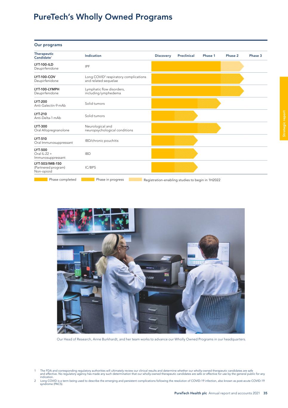 PureTech Health plc Annual report and accounts 2021 35 St ra te g ic r ep o rt PureTech’s Wholly Owned Programs 1 The FDA and corresponding regulatory authorities will ultimately review our clinical results and determine whether our wholly-owned therapeutic candidates are safe and effective. No regulatory agency has made any such determination that our wholly-owned therapeutic candidates are safe or effective for use by the general public for any indication. 2 Long COVID is a term being used to describe the emerging and persistent complications following the resolution of COVID-19 infection, also known as post-acute COVID-19 syndrome (PACS). Our Head of Research, Anne Burkhardt, and her team works to advance our Wholly Owned Programs in our headquarters. Our programs Therapeutic Candidate1 Indication Discovery Preclinical Phase 1 Phase 2 Phase 3 LYT-100-ILD Deupirfenidone IPF LYT-100-COV Deupirfenidone Long COVID2 respiratory complications and related sequelae LYT-100-LYMPH Deupirfenidone Lymphatic flow disorders, including lymphedema LYT-200 Anti-Galectin-9 mAb Solid tumors LYT-210 Anti-Delta-1 mAb Solid tumors LYT-300 Oral Allopregnanolone Neurological and neuropsychological conditions LYT-510 Oral Immunosuppressant IBD/chronic pouchitis LYT-500 Oral IL-22 + Immunosuppressant IBD LYT-503/IMB-150 (Partnered program) Non-opioid IC/BPS Phase completed Phase in progress Registration-enabling studies to begin in 1H2022