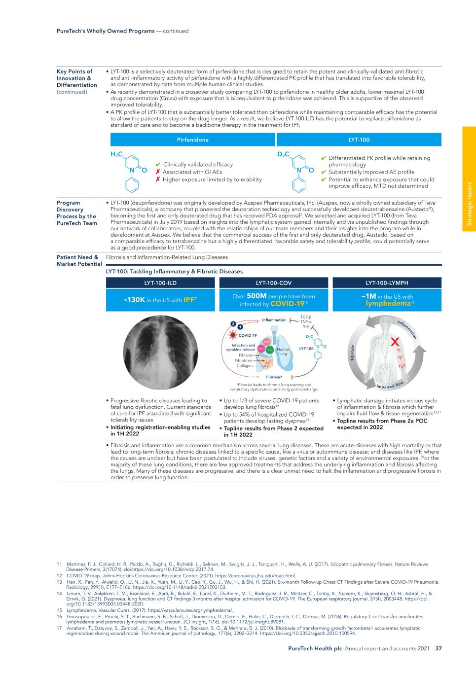 36 PureTech Health plc Annual report and accounts 2021 St ra te g ic r ep o rt LYT-100 Therapeutic Candidate1 PureTech Ownership Indication Stage of Development LYT-100 Wholly-owned Idiopathic pulmonary fibrosis (IPF) Long COVID2 respiratory complications and related sequelae Lymphatic flow disorders, including lymphedema Exploring potential opportunities in other inflammatory and fibrotic conditions, such as radiation induced fibrosis, myocardial fibrosis, and other organ system fibrosis Registration-enabling studies planned Phase 2 Phase 2 Clinical studies being planned • Our lead wholly-owned therapeutic candidate, LYT-100 (deupirfenidone), is being advanced for the potential treatment of conditions involving inflammation and fibrosis, including lung disease (IPF and Long COVID respiratory complications and related sequelae) and disorders of lymphatic flow, such as lymphedema. We are also exploring the potential evaluation of LYT-100 in other inflammatory and fibrotic conditions, such as radiation induced fibrosis, myocardial fibrosis and other organ system fibrosis based on the strength of existing clinical data around the use of pirfenidone in these indications. LYT-100 is a selectively deuterated form of pirfenidone that is designed to retain the potent and clinically validated anti-fibrotic and anti-inflammatory activity of pirfenidone, but with a highly differentiated PK profile that has translated into favorable tolerability, as supported by data from multiple human clinical studies. To date, LYT-100 has been studied in more than 400 subjects and demonstrated a favorable safety profile as part of our ongoing development work and indication prioritization. Key Points of Innovation & Differentiation • Pirfenidone (Esbriet®3) slows the progression of IPF and has been approved for the treatment of IPF in the U.S. and other countries. IPF is a chronic orphan condition that causes progressive scarring of the lungs. Median overall survival of IPF patients is 3-5 years. Pirfenidone is one of the two standard of care treatments for IPF, with nintedanib (OFEV®3) being the other drug. Despite its proven efficacy, there are serious limitations to pirfenidone’s clinical use primarily due to severe GI-related tolerability issues, which have significantly curtailed its effectiveness in patients with IPF4. The other standard of care treatment for IPF, nintedanib, has similar GI-related tolerability issues and limitations that have limited its broad usage. Although the combined sales of these two standard of care IPF drugs are over $3B, only about 25% of IPF patients are currently being treated with either of these drugs5. The vast majority of IPF patients are not currently on any approved therapies, primarily due to tolerability issues associated with these drugs. In a large post-marketing analysis of 10,996 patients diagnosed with IPF, only 13.2% received treatment with pirfenidone during a five-year follow-up period6. Additionally, real-world experience with pirfenidone in the IPF treatment setting highlights significant problems with treatment compliance, resulting in approximately half of the patients that start therapy either discontinuing therapy, dose- reducing or switching to other therapies, all of which lead to suboptimal disease management. We are developing LYT-100-ILD to offer an improved tolerability profile compared to current standard of care drugs, which may enable better patient compliance and potentially lead to improved disease outcomes. Pirfenidone has also shown activity in investigational clinical studies in patients with unclassifiable interstitial lung disease (uILD), radiation induced fibrosis, myocardial fibrosis and other organ system fibrosis and has demonstrated activity in a preclinical model of lymphedema and radiation-induced fibrosis. PureTech’s Wholly Owned Programs — continued 1 We have an active IND on file with the FDA for LYT-100. The FDA and corresponding regulatory authorities will ultimately review our clinical results and determine whether our wholly-owned therapeutic candidates are safe and effective. No regulatory agency has made any such determination that LYT-100 is safe or effective for use by the general public for any indication. 2 Long COVID is a term being used to describe the emerging and persistent complications following the resolution of COVID-19 infection, also known as post-acute COVID-19 syndrome (PACS). 3 Esbriet®, OFEV® and AUSTEDO® are trademarks of Genentech, Boehringer Ingelheim Pharmaceuticals and Auspex Pharmaceuticals, Inc., respectively, and are not owned by or affiliated with PureTech Health. LYT-100 is an investigational drug not approved by any regulatory authority. 4 Rubino C. M., Bhavnani S. M., Ambrose P. G., Forrest A., Loutit J. S. Effect of food and antacids on the pharmacokinetics of pirfenidone in older healthy adults. Pulmonary Pharmacology & Therapeutics. 2009 Aug;22(4):279-285. DOI: 10.1016/j.pupt.2009.03.003. 5 Based on 2021 ESBRIET® and OFEV® total WW sales of $3.7B; Ofev sales are inclusive of SSc-ILD, PF-ILD and IPF indications. 6 Dempsey TM, Payne S, Sangaralingham L, Yao X, Shah ND, Limper AH. Adoption of the Anti-Fibrotic Medications Pirfenidone and Nintedanib for Patients with Idiopathic Pulmonary Fibrosis. Ann Am Thorac Soc. 2021 Jan 19. doi: 10.1513/AnnalsATS.202007-901OC. Epub ahead of print. PMID: 33465323. 7 Noble, P. W., Albera, C., Bradford, W. Z., Costabel, U., du Bois, R. M., Fagan, E. A., Fishman, R. S., Glaspole, I., Glassberg, M. K., Lancaster, L., Lederer, D. J., Leff, J. A., Nathan, S. D., Pereira, C. A., Swigris, J. J., Valeyre, D., & King, T. E., Jr (2016). Pirfenidone for idiopathic pulmonary fibrosis: analysis of pooled data from three multinational phase 3 trials. The European Respiratory Journal, 47(1), 243–253. https://doi.org/10.1183/13993003.00026-2015. 8 ERS 2019: http://bit.ly/2lJ9WCC 9 Saad, M. I., Mcleod, L., Hodges, C., Vlahos, R., Rose-John, S., Ruwanpura, S.