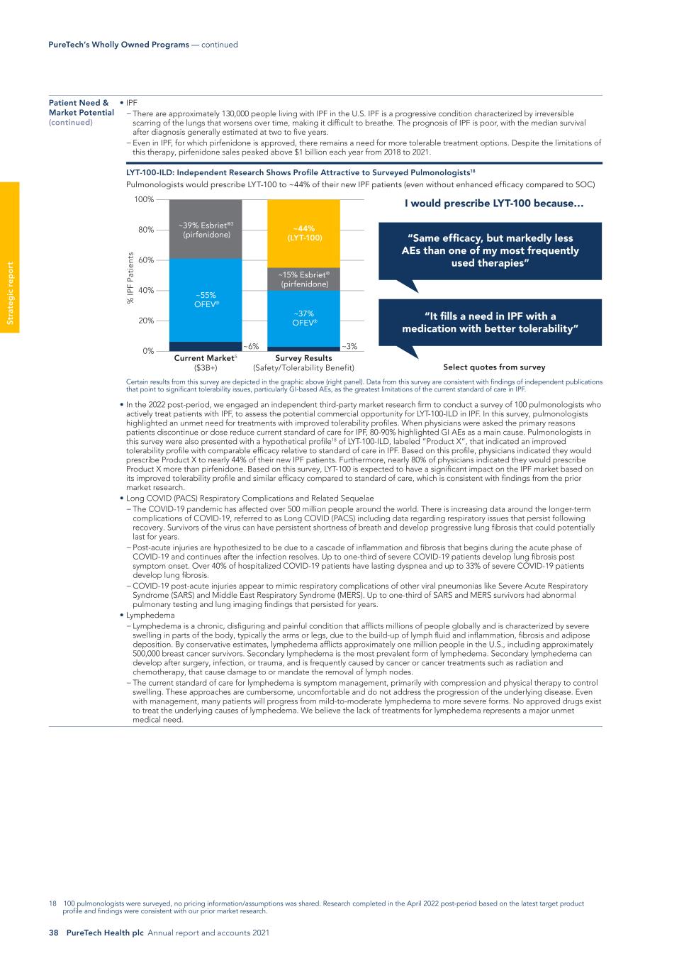 38 PureTech Health plc Annual report and accounts 2021 St ra te g ic r ep o rt Patient Need & Market Potential (continued) • IPF − There are approximately 130,000 people living with IPF in the U.S. IPF is a progressive condition characterized by irreversible scarring of the lungs that worsens over time, making it difficult to breathe. The prognosis of IPF is poor, with the median survival after diagnosis generally estimated at two to five years. − Even in IPF, for which pirfenidone is approved, there remains a need for more tolerable treatment options. Despite the limitations of this therapy, pirfenidone sales peaked above $1 billion each year from 2018 to 2021. LYT-100-ILD: Independent Research Shows Profile Attractive to Surveyed Pulmonologists18 Pulmonologists would prescribe LYT-100 to ~44% of their new IPF patients (even without enhanced efficacy compared to SOC) Certain results from this survey are depicted in the graphic above (right panel). Data from this survey are consistent with findings of independent publications that point to significant tolerability issues, particularly GI-based AEs, as the greatest limitations of the current standard of care in IPF. • In the 2022 post-period, we engaged an independent third-party market research firm to conduct a survey of 100 pulmonologists who actively treat patients with IPF, to assess the potential commercial opportunity for LYT-100-ILD in IPF. In this survey, pulmonologists highlighted an unmet need for treatments with improved tolerability profiles. When physicians were asked the primary reasons patients discontinue or dose reduce current standard of care for IPF, 80-90% highlighted GI AEs as a main cause. Pulmonologists in this survey were also presented with a hypothetical profile18 of LYT-100-ILD, labeled “Product X”, that indicated an improved tolerability profile with comparable efficacy relative to standard of care in IPF. Based on this profile, physicians indicated they would prescribe Product X to nearly 44% of their new IPF patients. Furthermore, nearly 80% of physicians indicated they would prescribe Product X more than pirfenidone. Based on this survey, LYT-100 is expected to have a significant impact on the IPF market based on its improved tolerability profile and similar efficacy compared to standard of care, which is consistent with findings from the prior market research. • Long COVID (PACS) Respiratory Complications and Related Sequelae − The COVID-19 pandemic has affected over 500 million people around the world. There is increasing data around the longer-term complications of COVID-19, referred to as Long COVID (PACS) including data regarding respiratory issues that persist following recovery. Survivors of the virus can have persistent shortness of breath and develop progressive lung fibrosis that could potentially last for years. − Post-acute injuries are hypothesized to be due to a cascade of inflammation and fibrosis that begins during the acute phase of COVID-19 and continues after the infection resolves. Up to one-third of severe COVID-19 patients develop lung fibrosis post symptom onset. Over 40% of hospitalized COVID-19 patients have lasting dyspnea and up to 33% of severe COVID-19 patients develop lung fibrosis. − COVID-19 post-acute injuries appear to mimic respiratory complications of other viral pneumonias like Severe Acute Respiratory Syndrome (SARS) and Middle East Respiratory Syndrome (MERS). Up to one-third of SARS and MERS survivors had abnormal pulmonary testing and lung imaging findings that persisted for years. • Lymphedema − Lymphedema is a chronic, disfiguring and painful condition that afflicts millions of people globally and is characterized by severe swelling in parts of the body, typically the arms or legs, due to the build-up of lymph fluid and inflammation, fibrosis and adipose deposition. By conservative estimates, lymphedema afflicts approximately one million people in the U.S., including approximately 500,000 breast cancer survivors. Secondary lymphedema is the most prevalent form of lymphedema. Secondary lymphedema can develop after surgery, infection, or trauma, and is frequently caused by cancer or cancer treatments such as radiation and chemotherapy, that cause damage to or mandate the removal of lymph nodes. − The current standard of care for lymphedema is symptom management, primarily with compression and physical therapy to control swelling. These approaches are cumbersome, uncomfortable and do not address the progression of the underlying disease. Even with management, many patients will progress from mild-to-moderate lymphedema to more severe forms. No approved drugs exist to treat the underlying causes of lymphedema. We believe the lack of treatments for lymphedema represents a major unmet medical need. PureTech’s Wholly Owned Programs — continued 18 100 pulmonologists were surveyed, no pricing information/assumptions was shared. Research completed in the April 2022 post-period based on the latest target product profile and findings were consistent with our prior market research.