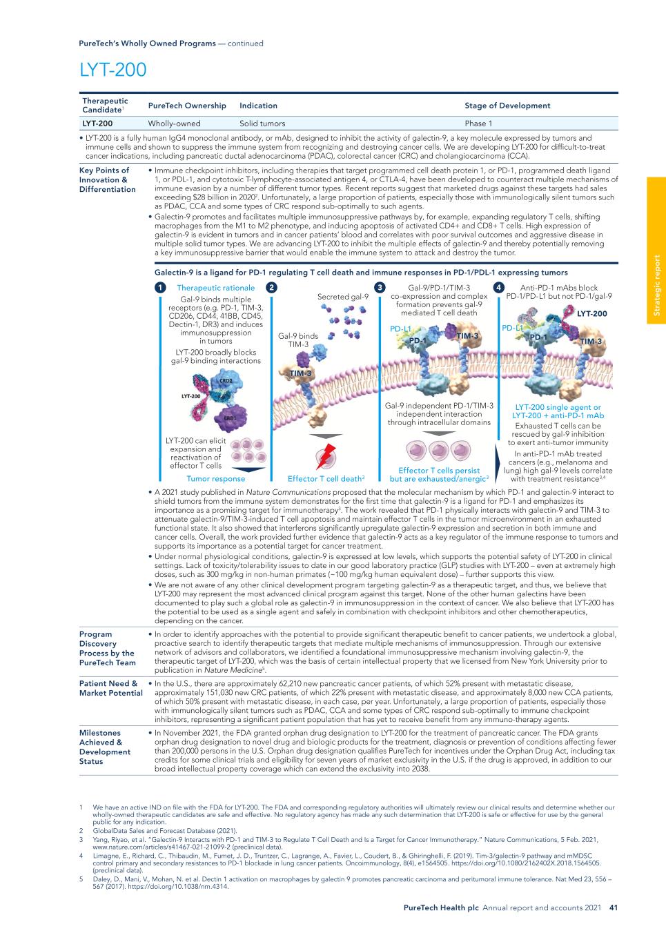 PureTech Health plc Annual report and accounts 2021 41 St ra te g ic r ep o rt LYT-200 Therapeutic Candidate1 PureTech Ownership Indication Stage of Development LYT-200 Wholly-owned Solid tumors Phase 1 • LYT-200 is a fully human IgG4 monoclonal antibody, or mAb, designed to inhibit the activity of galectin-9, a key molecule expressed by tumors and immune cells and shown to suppress the immune system from recognizing and destroying cancer cells. We are developing LYT-200 for difficult-to-treat cancer indications, including pancreatic ductal adenocarcinoma (PDAC), colorectal cancer (CRC) and cholangiocarcinoma (CCA). Key Points of Innovation & Differentiation • Immune checkpoint inhibitors, including therapies that target programmed cell death protein 1, or PD-1, programmed death ligand 1, or PDL-1, and cytotoxic T-lymphocyte-associated antigen 4, or CTLA-4, have been developed to counteract multiple mechanisms of immune evasion by a number of different tumor types. Recent reports suggest that marketed drugs against these targets had sales exceeding $28 billion in 20202. Unfortunately, a large proportion of patients, especially those with immunologically silent tumors such as PDAC, CCA and some types of CRC respond sub-optimally to such agents. • Galectin-9 promotes and facilitates multiple immunosuppressive pathways by, for example, expanding regulatory T cells, shifting macrophages from the M1 to M2 phenotype, and inducing apoptosis of activated CD4+ and CD8+ T cells. High expression of galectin-9 is evident in tumors and in cancer patients’ blood and correlates with poor survival outcomes and aggressive disease in multiple solid tumor types. We are advancing LYT-200 to inhibit the multiple effects of galectin-9 and thereby potentially removing a key immunosuppressive barrier that would enable the immune system to attack and destroy the tumor. Galectin-9 is a ligand for PD-1 regulating T cell death and immune responses in PD-1/PDL-1 expressing tumors • A 2021 study published in Nature Communications proposed that the molecular mechanism by which PD-1 and galectin-9 interact to shield tumors from the immune system demonstrates for the first time that galectin-9 is a ligand for PD-1 and emphasizes its importance as a promising target for immunotherapy3. The work revealed that PD-1 physically interacts with galectin-9 and TIM-3 to attenuate galectin-9/TIM-3-induced T cell apoptosis and maintain effector T cells in the tumor microenvironment in an exhausted functional state. It also showed that interferons significantly upregulate galectin-9 expression and secretion in both immune and cancer cells. Overall, the work provided further evidence that galectin-9 acts as a key regulator of the immune response to tumors and supports its importance as a potential target for cancer treatment. • Under normal physiological conditions, galectin-9 is expressed at low levels, which supports the potential safety of LYT-200 in clinical settings. Lack of toxicity/tolerability issues to date in our good laboratory practice (GLP) studies with LYT-200 – even at extremely high doses, such as 300 mg/kg in non-human primates (~100 mg/kg human equivalent dose) – further supports this view. • We are not aware of any other clinical development program targeting galectin-9 as a therapeutic target, and thus, we believe that LYT-200 may represent the most advanced clinical program against this target. None of the other human galectins have been documented to play such a global role as galectin-9 in immunosuppression in the context of cancer. We also believe that LYT-200 has the potential to be used as a single agent and safely in combination with checkpoint inhibitors and other chemotherapeutics, depending on the cancer. Program Discovery Process by the PureTech Team • In order to identify approaches with the potential to provide significant therapeutic benefit to cancer patients, we undertook a global, proactive search to identify therapeutic targets that mediate multiple mechanisms of immunosuppression. Through our extensive network of advisors and collaborators, we identified a foundational immunosuppressive mechanism involving galectin-9, the therapeutic target of LYT-200, which was the basis of certain intellectual property that we licensed from New York University prior to publication in Nature Medicine5. Patient Need & Market Potential • In the U.S., there are approximately 62,210 new pancreatic cancer patients, of which 52% present with metastatic disease, approximately 151,030 new CRC patients, of which 22% present with metastatic disease, and approximately 8,000 new CCA patients, of which 50% present with metastatic disease, in each case, per year. Unfortunately, a large proportion of patients, especially those with immunologically silent tumors such as PDAC, CCA and some types of CRC respond sub-optimally to immune checkpoint inhibitors, representing a significant patient population that has yet to receive benefit from any immuno-therapy agents. Milestones Achieved & Development Status • In November 2021, the FDA granted orphan drug designation to LYT-200 for the treatment of pancreatic cancer. The FDA grants orphan drug designation to novel drug and biologic products for the treatment, diagnosis or prevention of conditions affecting fewer than 200,000 persons in the U.S. Orphan drug designation qualifies PureTech for incentives under the Orphan Drug Act, including tax credits for some clinical trials and eligibility for seven years of market exclusivity in the U.S. if the drug is approved, in addition to our broad intellectual property coverage which can extend the exclusivity into 2038. PureTech’s Wholly Owned Programs — continued 1 We have an active IND on file with the FDA for LYT-200. The FDA and corresponding regulatory authorities will ultimately review our clinical results and determine whether our wholly-owned therapeutic candidates are safe and effective. No regulatory a