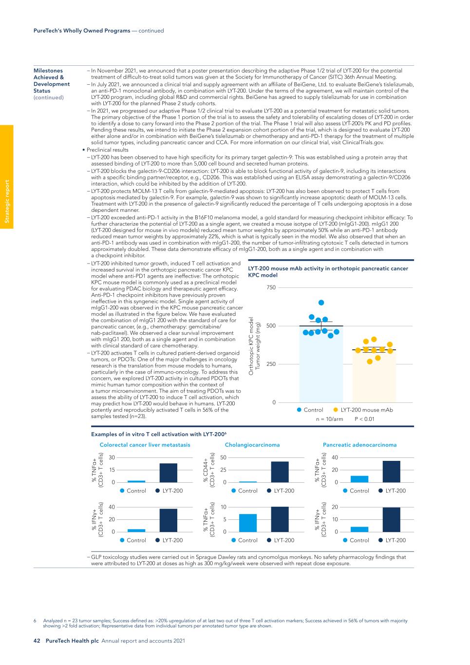 42 PureTech Health plc Annual report and accounts 2021 St ra te g ic r ep o rt Milestones Achieved & Development Status (continued) − In November 2021, we announced that a poster presentation describing the adaptive Phase 1/2 trial of LYT-200 for the potential treatment of difficult-to-treat solid tumors was given at the Society for Immunotherapy of Cancer (SITC) 36th Annual Meeting. − In July 2021, we announced a clinical trial and supply agreement with an affiliate of BeiGene, Ltd. to evaluate BeiGene’s tislelizumab, an anti-PD-1 monoclonal antibody, in combination with LYT-200. Under the terms of the agreement, we will maintain control of the LYT-200 program, including global R&D and commercial rights. BeiGene has agreed to supply tislelizumab for use in combination with LYT-200 for the planned Phase 2 study cohorts. − In 2021, we progressed our adaptive Phase 1/2 clinical trial to evaluate LYT-200 as a potential treatment for metastatic solid tumors. The primary objective of the Phase 1 portion of the trial is to assess the safety and tolerability of escalating doses of LYT-200 in order to identify a dose to carry forward into the Phase 2 portion of the trial. The Phase 1 trial will also assess LYT-200’s PK and PD profiles. Pending these results, we intend to initiate the Phase 2 expansion cohort portion of the trial, which is designed to evaluate LYT-200 either alone and/or in combination with BeiGene’s tislelizumab or chemotherapy and anti-PD-1 therapy for the treatment of multiple solid tumor types, including pancreatic cancer and CCA. For more information on our clinical trial, visit ClinicalTrials.gov. • Preclinical results − LYT-200 has been observed to have high specificity for its primary target galectin-9: This was established using a protein array that assessed binding of LYT-200 to more than 5,000 cell bound and secreted human proteins. − LYT-200 blocks the galectin-9-CD206 interaction: LYT-200 is able to block functional activity of galectin-9, including its interactions with a specific binding partner/receptor, e.g., CD206. This was established using an ELISA assay demonstrating a galectin-9/CD206 interaction, which could be inhibited by the addition of LYT-200. − LYT-200 protects MOLM-13 T cells from galectin-9-mediated apoptosis: LYT-200 has also been observed to protect T cells from apoptosis mediated by galectin-9. For example, galectin-9 was shown to significantly increase apoptotic death of MOLM-13 cells. Treatment with LYT-200 in the presence of galectin-9 significantly reduced the percentage of T cells undergoing apoptosis in a dose dependent manner. − LYT-200 exceeded anti-PD-1 activity in the B16F10 melanoma model, a gold standard for measuring checkpoint inhibitor efficacy: To further characterize the potential of LYT-200 as a single agent, we created a mouse isotype of LYT-200 (mIgG1-200). mIgG1 200 (LYT-200 designed for mouse in vivo models) reduced mean tumor weights by approximately 50% while an anti-PD-1 antibody reduced mean tumor weights by approximately 22%, which is what is typically seen in the model. We also observed that when an anti-PD-1 antibody was used in combination with mIgG1-200, the number of tumor-infiltrating cytotoxic T cells detected in tumors approximately doubled. These data demonstrate efficacy of mIgG1-200, both as a single agent and in combination with a checkpoint inhibitor. − LYT-200 inhibited tumor growth, induced T cell activation and increased survival in the orthotopic pancreatic cancer KPC model where anti-PD1 agents are ineffective: The orthotopic KPC mouse model is commonly used as a preclinical model for evaluating PDAC biology and therapeutic agent efficacy. Anti-PD-1 checkpoint inhibitors have previously proven ineffective in this syngeneic model. Single agent activity of mIgG1-200 was observed in the KPC mouse pancreatic cancer model as illustrated in the figure below. We have evaluated the combination of mIgG1 200 with the standard of care for pancreatic cancer, (e.g., chemotherapy: gemcitabine/ nab-paclitaxel). We observed a clear survival improvement with mIgG1 200, both as a single agent and in combination with clinical standard of care chemotherapy. − LYT-200 activates T cells in cultured patient-derived organoid tumors, or PDOTs: One of the major challenges in oncology research is the translation from mouse models to humans, particularly in the case of immuno-oncology. To address this concern, we explored LYT-200 activity in cultured PDOTs that mimic human tumor composition within the context of a tumor microenvironment. The aim of treating PDOTs was to assess the ability of LYT-200 to induce T cell activation, which may predict how LYT-200 would behave in humans. LYT-200 potently and reproducibly activated T cells in 56% of the samples tested (n=23). − GLP toxicology studies were carried out in Sprague Dawley rats and cynomolgus monkeys. No safety pharmacology findings that were attributed to LYT-200 at doses as high as 300 mg/kg/week were observed with repeat dose exposure. PureTech’s Wholly Owned Programs — continued 6 Analyzed n = 23 tumor samples; Success defined as: >20% upregulation of at last two out of three T cell activation markers; Success achieved in 56% of tumors with majority showing >2 fold activation; Representative data from individual tumors per annotated tumor type are shown. LYT-200 mouse mAb activity in orthotopic pancreatic cancer KPC model Examples of in vitro T cell activation with LYT-2006 Colorectal cancer liver metastasis Cholangiocarcinoma Pancreatic adenocarcinoma