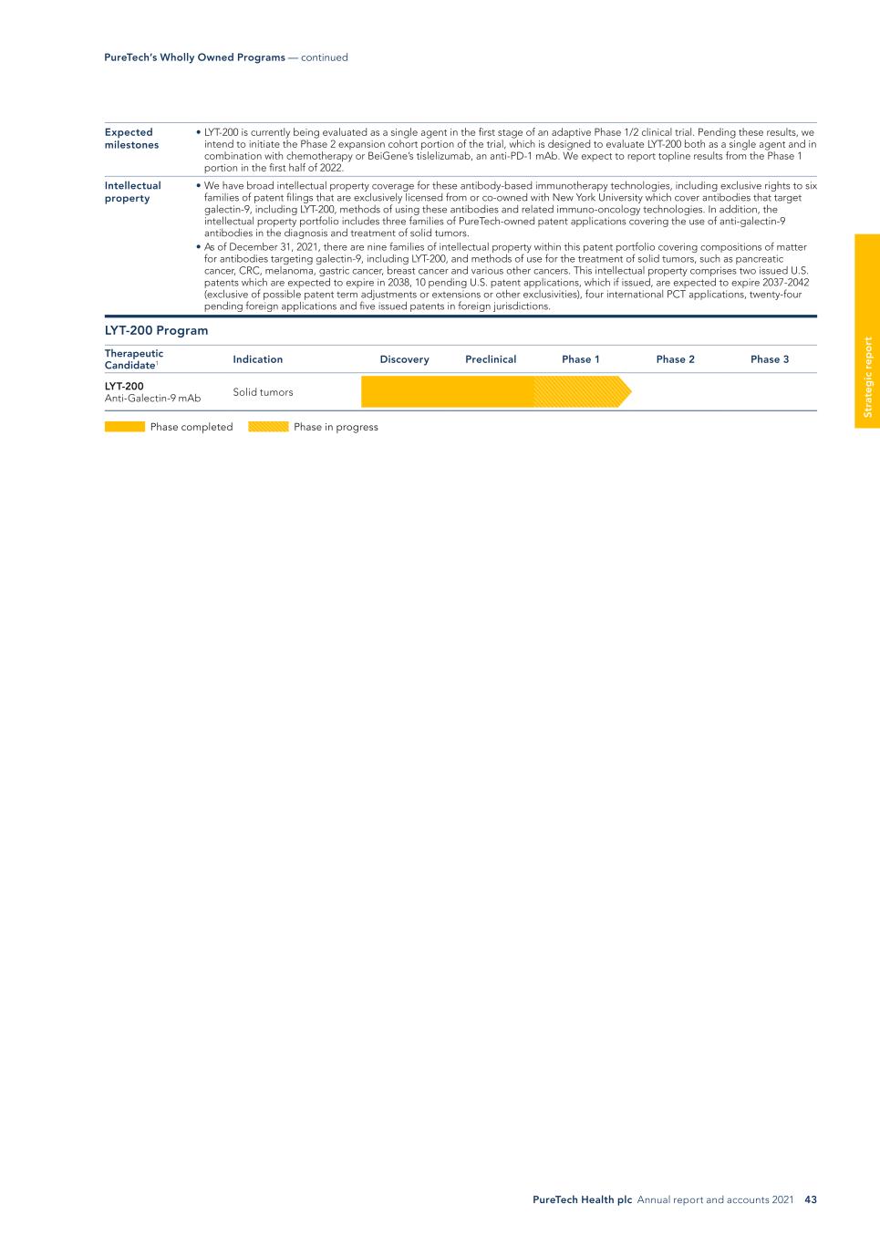 PureTech Health plc Annual report and accounts 2021 43 St ra te g ic r ep o rt Expected milestones • LYT-200 is currently being evaluated as a single agent in the first stage of an adaptive Phase 1/2 clinical trial. Pending these results, we intend to initiate the Phase 2 expansion cohort portion of the trial, which is designed to evaluate LYT-200 both as a single agent and in combination with chemotherapy or BeiGene’s tislelizumab, an anti-PD-1 mAb. We expect to report topline results from the Phase 1 portion in the first half of 2022. Intellectual property • We have broad intellectual property coverage for these antibody-based immunotherapy technologies, including exclusive rights to six families of patent filings that are exclusively licensed from or co-owned with New York University which cover antibodies that target galectin-9, including LYT-200, methods of using these antibodies and related immuno-oncology technologies. In addition, the intellectual property portfolio includes three families of PureTech-owned patent applications covering the use of anti-galectin-9 antibodies in the diagnosis and treatment of solid tumors. • As of December 31, 2021, there are nine families of intellectual property within this patent portfolio covering compositions of matter for antibodies targeting galectin-9, including LYT-200, and methods of use for the treatment of solid tumors, such as pancreatic cancer, CRC, melanoma, gastric cancer, breast cancer and various other cancers. This intellectual property comprises two issued U.S. patents which are expected to expire in 2038, 10 pending U.S. patent applications, which if issued, are expected to expire 2037-2042 (exclusive of possible patent term adjustments or extensions or other exclusivities), four international PCT applications, twenty-four pending foreign applications and five issued patents in foreign jurisdictions. PureTech’s Wholly Owned Programs — continued LYT-200 Program Therapeutic Candidate1 Indication Discovery Preclinical Phase 1 Phase 2 Phase 3 LYT-200 Anti-Galectin-9 mAb Solid tumors Phase completed Phase in progress
