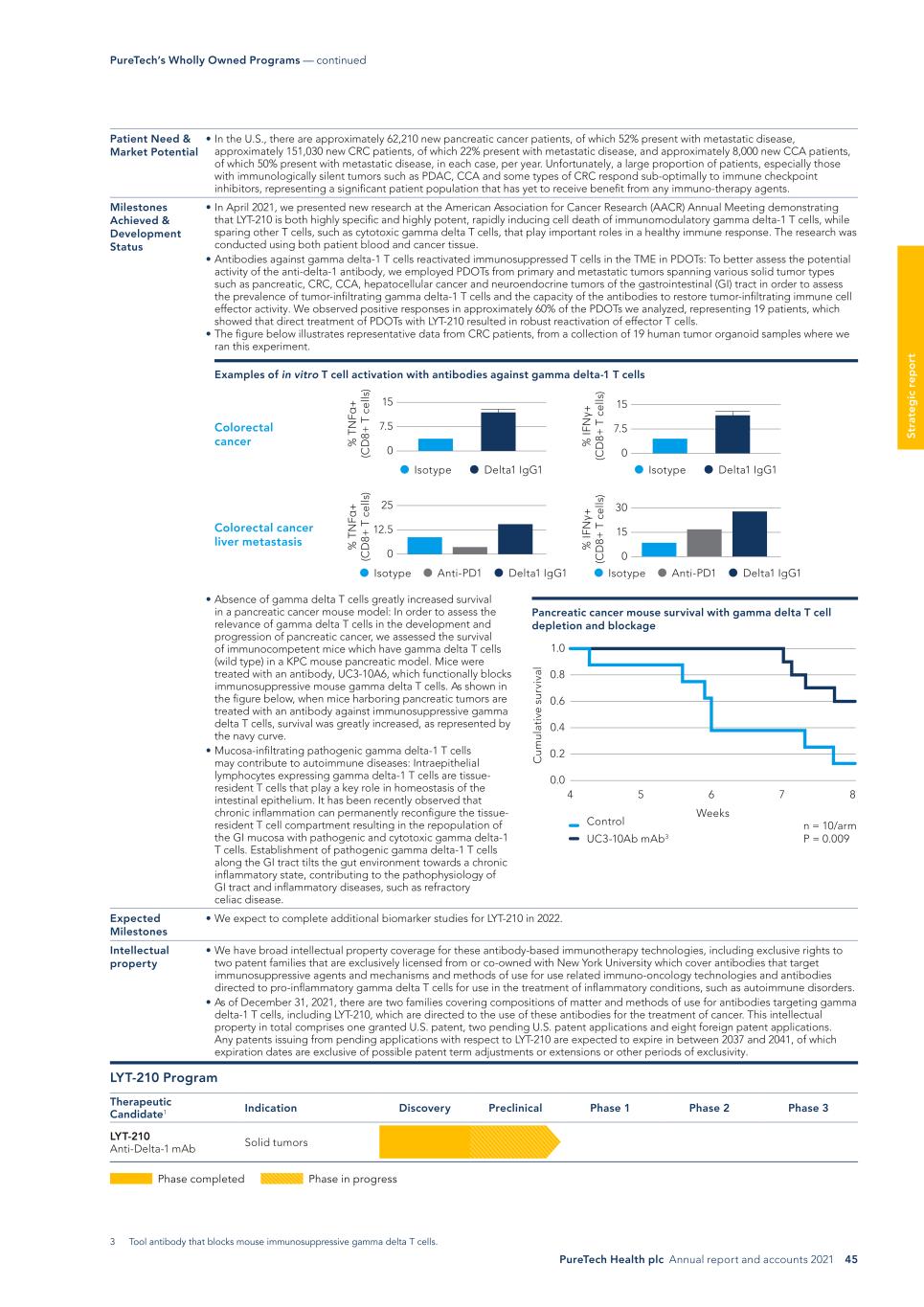 PureTech Health plc Annual report and accounts 2021 45 St ra te g ic r ep o rt Patient Need & Market Potential • In the U.S., there are approximately 62,210 new pancreatic cancer patients, of which 52% present with metastatic disease, approximately 151,030 new CRC patients, of which 22% present with metastatic disease, and approximately 8,000 new CCA patients, of which 50% present with metastatic disease, in each case, per year. Unfortunately, a large proportion of patients, especially those with immunologically silent tumors such as PDAC, CCA and some types of CRC respond sub-optimally to immune checkpoint inhibitors, representing a significant patient population that has yet to receive benefit from any immuno-therapy agents. Milestones Achieved & Development Status • In April 2021, we presented new research at the American Association for Cancer Research (AACR) Annual Meeting demonstrating that LYT-210 is both highly specific and highly potent, rapidly inducing cell death of immunomodulatory gamma delta-1 T cells, while sparing other T cells, such as cytotoxic gamma delta T cells, that play important roles in a healthy immune response. The research was conducted using both patient blood and cancer tissue. • Antibodies against gamma delta-1 T cells reactivated immunosuppressed T cells in the TME in PDOTs: To better assess the potential activity of the anti-delta-1 antibody, we employed PDOTs from primary and metastatic tumors spanning various solid tumor types such as pancreatic, CRC, CCA, hepatocellular cancer and neuroendocrine tumors of the gastrointestinal (GI) tract in order to assess the prevalence of tumor-infiltrating gamma delta-1 T cells and the capacity of the antibodies to restore tumor-infiltrating immune cell effector activity. We observed positive responses in approximately 60% of the PDOTs we analyzed, representing 19 patients, which showed that direct treatment of PDOTs with LYT-210 resulted in robust reactivation of effector T cells. • The figure below illustrates representative data from CRC patients, from a collection of 19 human tumor organoid samples where we ran this experiment. Examples of in vitro T cell activation with antibodies against gamma delta-1 T cells • Absence of gamma delta T cells greatly increased survival in a pancreatic cancer mouse model: In order to assess the relevance of gamma delta T cells in the development and progression of pancreatic cancer, we assessed the survival of immunocompetent mice which have gamma delta T cells (wild type) in a KPC mouse pancreatic model. Mice were treated with an antibody, UC3-10A6, which functionally blocks immunosuppressive mouse gamma delta T cells. As shown in the figure below, when mice harboring pancreatic tumors are treated with an antibody against immunosuppressive gamma delta T cells, survival was greatly increased, as represented by the navy curve. • Mucosa-infiltrating pathogenic gamma delta-1 T cells may contribute to autoimmune diseases: Intraepithelial lymphocytes expressing gamma delta-1 T cells are tissue- resident T cells that play a key role in homeostasis of the intestinal epithelium. It has been recently observed that chronic inflammation can permanently reconfigure the tissue- resident T cell compartment resulting in the repopulation of the GI mucosa with pathogenic and cytotoxic gamma delta-1 T cells. Establishment of pathogenic gamma delta-1 T cells along the GI tract tilts the gut environment towards a chronic inflammatory state, contributing to the pathophysiology of GI tract and inflammatory diseases, such as refractory celiac disease. Pancreatic cancer mouse survival with gamma delta T cell depletion and blockage Expected Milestones • We expect to complete additional biomarker studies for LYT-210 in 2022. Intellectual property • We have broad intellectual property coverage for these antibody-based immunotherapy technologies, including exclusive rights to two patent families that are exclusively licensed from or co-owned with New York University which cover antibodies that target immunosuppressive agents and mechanisms and methods of use for use related immuno-oncology technologies and antibodies directed to pro-inflammatory gamma delta T cells for use in the treatment of inflammatory conditions, such as autoimmune disorders. • As of December 31, 2021, there are two families covering compositions of matter and methods of use for antibodies targeting gamma delta-1 T cells, including LYT-210, which are directed to the use of these antibodies for the treatment of cancer. This intellectual property in total comprises one granted U.S. patent, two pending U.S. patent applications and eight foreign patent applications. Any patents issuing from pending applications with respect to LYT-210 are expected to expire in between 2037 and 2041, of which expiration dates are exclusive of possible patent term adjustments or extensions or other periods of exclusivity. PureTech’s Wholly Owned Programs — continued 3 Tool antibody that blocks mouse immunosuppressive gamma delta T cells. Colorectal cancer Colorectal cancer liver metastasis LYT-210 Program Therapeutic Candidate1 Indication Discovery Preclinical Phase 1 Phase 2 Phase 3 LYT-210 Anti-Delta-1 mAb Solid tumors Phase completed Phase in progress