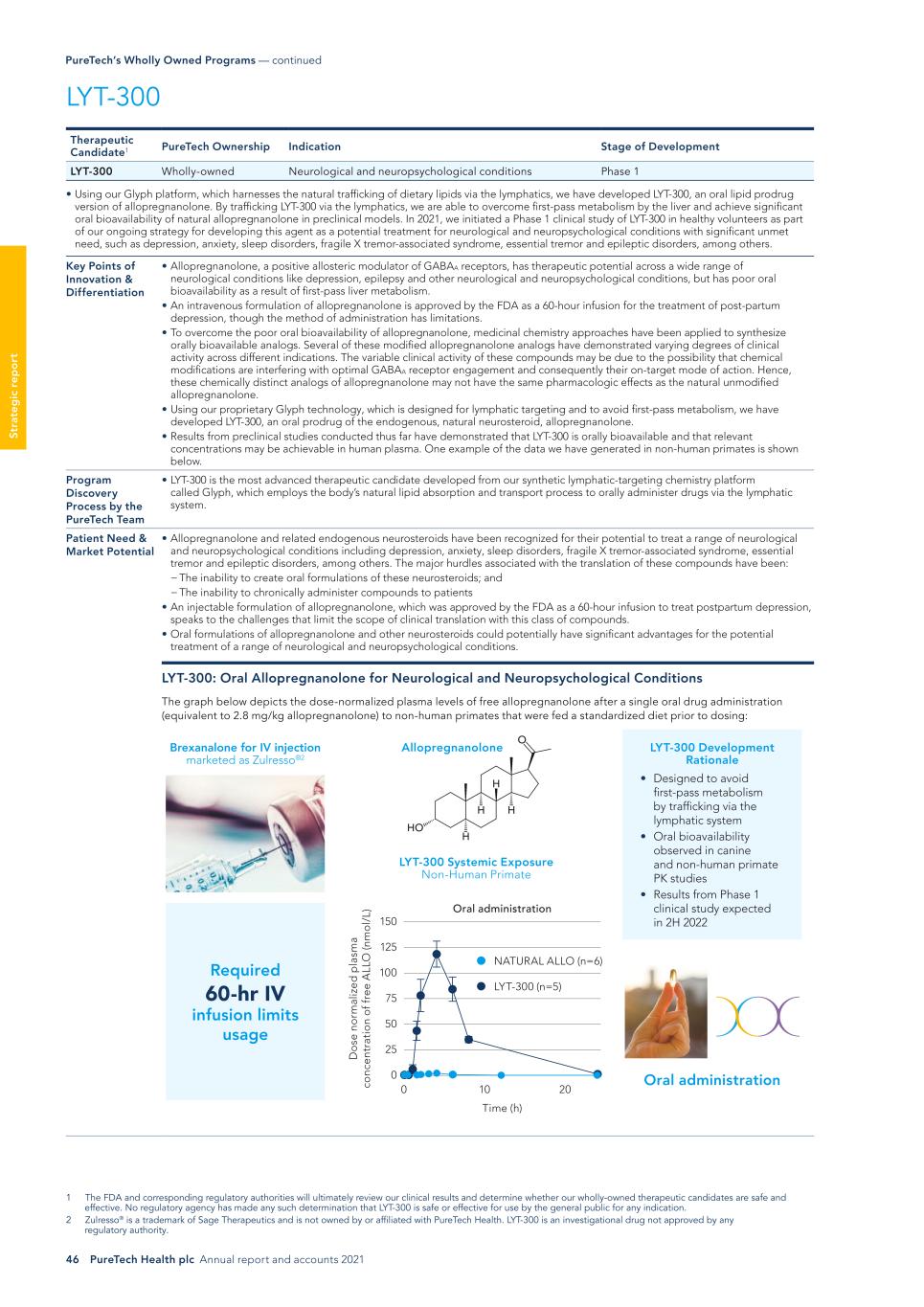 46 PureTech Health plc Annual report and accounts 2021 St ra te g ic r ep o rt LYT-300 Therapeutic Candidate1 PureTech Ownership Indication Stage of Development LYT-300 Wholly-owned Neurological and neuropsychological conditions Phase 1 • Using our Glyph platform, which harnesses the natural trafficking of dietary lipids via the lymphatics, we have developed LYT-300, an oral lipid prodrug version of allopregnanolone. By trafficking LYT-300 via the lymphatics, we are able to overcome first-pass metabolism by the liver and achieve significant oral bioavailability of natural allopregnanolone in preclinical models. In 2021, we initiated a Phase 1 clinical study of LYT-300 in healthy volunteers as part of our ongoing strategy for developing this agent as a potential treatment for neurological and neuropsychological conditions with significant unmet need, such as depression, anxiety, sleep disorders, fragile X tremor-associated syndrome, essential tremor and epileptic disorders, among others. Key Points of Innovation & Differentiation • Allopregnanolone, a positive allosteric modulator of GABAA receptors, has therapeutic potential across a wide range of neurological conditions like depression, epilepsy and other neurological and neuropsychological conditions, but has poor oral bioavailability as a result of first-pass liver metabolism. • An intravenous formulation of allopregnanolone is approved by the FDA as a 60-hour infusion for the treatment of post-partum depression, though the method of administration has limitations. • To overcome the poor oral bioavailability of allopregnanolone, medicinal chemistry approaches have been applied to synthesize orally bioavailable analogs. Several of these modified allopregnanolone analogs have demonstrated varying degrees of clinical activity across different indications. The variable clinical activity of these compounds may be due to the possibility that chemical modifications are interfering with optimal GABAA receptor engagement and consequently their on-target mode of action. Hence, these chemically distinct analogs of allopregnanolone may not have the same pharmacologic effects as the natural unmodified allopregnanolone. • Using our proprietary Glyph technology, which is designed for lymphatic targeting and to avoid first-pass metabolism, we have developed LYT-300, an oral prodrug of the endogenous, natural neurosteroid, allopregnanolone. • Results from preclinical studies conducted thus far have demonstrated that LYT-300 is orally bioavailable and that relevant concentrations may be achievable in human plasma. One example of the data we have generated in non-human primates is shown below. Program Discovery Process by the PureTech Team • LYT-300 is the most advanced therapeutic candidate developed from our synthetic lymphatic-targeting chemistry platform called Glyph, which employs the body’s natural lipid absorption and transport process to orally administer drugs via the lymphatic system. Patient Need & Market Potential • Allopregnanolone and related endogenous neurosteroids have been recognized for their potential to treat a range of neurological and neuropsychological conditions including depression, anxiety, sleep disorders, fragile X tremor-associated syndrome, essential tremor and epileptic disorders, among others. The major hurdles associated with the translation of these compounds have been: − The inability to create oral formulations of these neurosteroids; and − The inability to chronically administer compounds to patients • An injectable formulation of allopregnanolone, which was approved by the FDA as a 60-hour infusion to treat postpartum depression, speaks to the challenges that limit the scope of clinical translation with this class of compounds. • Oral formulations of allopregnanolone and other neurosteroids could potentially have significant advantages for the potential treatment of a range of neurological and neuropsychological conditions. LYT-300: Oral Allopregnanolone for Neurological and Neuropsychological Conditions The graph below depicts the dose-normalized plasma levels of free allopregnanolone after a single oral drug administration (equivalent to 2.8 mg/kg allopregnanolone) to non-human primates that were fed a standardized diet prior to dosing: 1 The FDA and corresponding regulatory authorities will ultimately review our clinical results and determine whether our wholly-owned therapeutic candidates are safe and effective. No regulatory agency has made any such determination that LYT-300 is safe or effective for use by the general public for any indication. 2 Zulresso® is a trademark of Sage Therapeutics and is not owned by or affiliated with PureTech Health. LYT-300 is an investigational drug not approved by any regulatory authority. PureTech’s Wholly Owned Programs — continued Brexanalone for IV injection marketed as Zulresso®2 Allopregnanolone LYT-300 Systemic Exposure Non-Human Primate LYT-300 Development Rationale • Designed to avoid first-pass metabolism by trafficking via the lymphatic system • Oral bioavailability observed in canine and non-human primate PK studies • Results from Phase 1 clinical study expected in 2H 2022 Oral administration Required 60-hr IV infusion limits usage