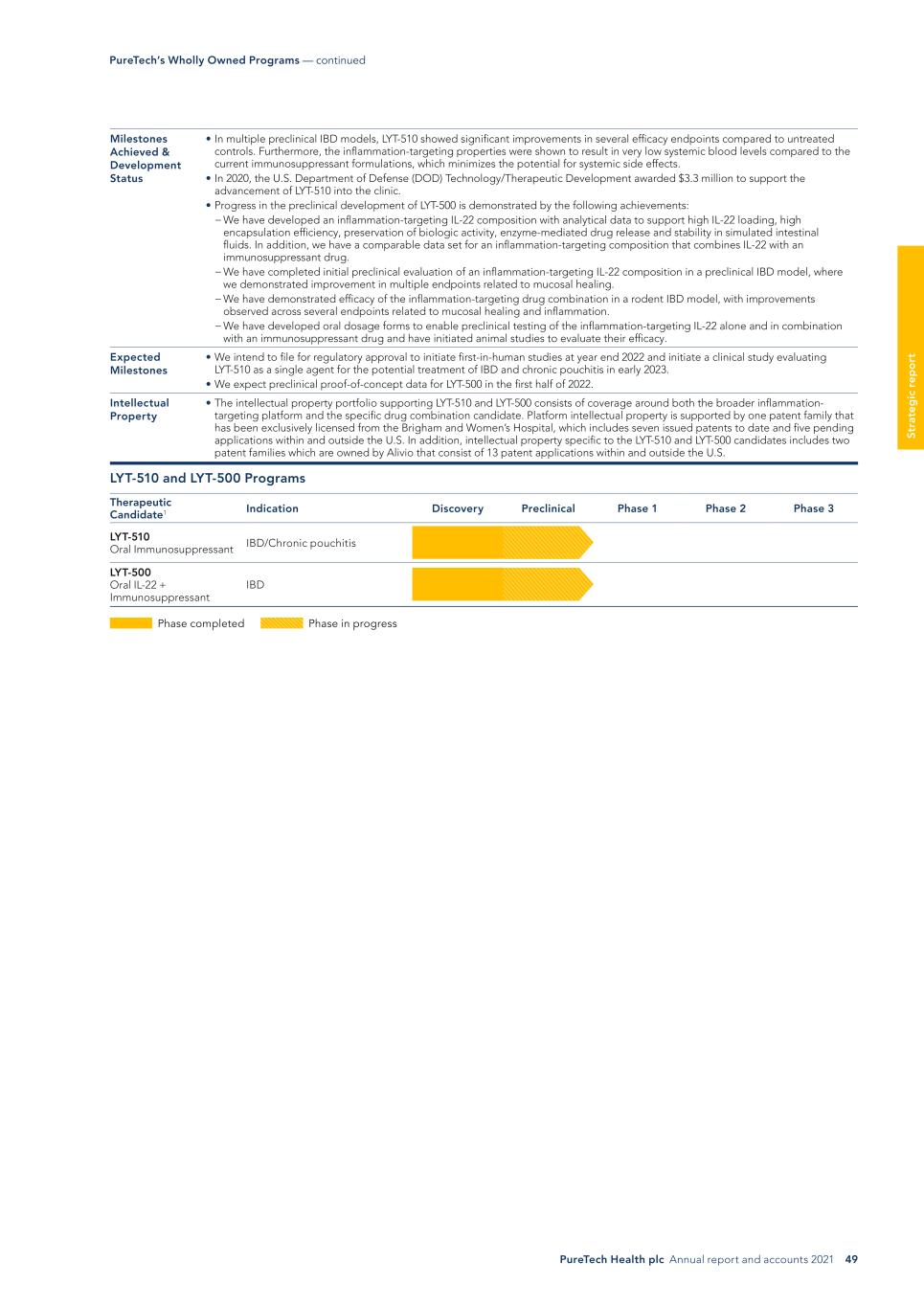 PureTech Health plc Annual report and accounts 2021 49 St ra te g ic r ep o rt Milestones Achieved & Development Status • In multiple preclinical IBD models, LYT-510 showed significant improvements in several efficacy endpoints compared to untreated controls. Furthermore, the inflammation-targeting properties were shown to result in very low systemic blood levels compared to the current immunosuppressant formulations, which minimizes the potential for systemic side effects. • In 2020, the U.S. Department of Defense (DOD) Technology/Therapeutic Development awarded $3.3 million to support the advancement of LYT-510 into the clinic. • Progress in the preclinical development of LYT-500 is demonstrated by the following achievements: − We have developed an inflammation-targeting IL-22 composition with analytical data to support high IL-22 loading, high encapsulation efficiency, preservation of biologic activity, enzyme-mediated drug release and stability in simulated intestinal fluids. In addition, we have a comparable data set for an inflammation-targeting composition that combines IL-22 with an immunosuppressant drug. − We have completed initial preclinical evaluation of an inflammation-targeting IL-22 composition in a preclinical IBD model, where we demonstrated improvement in multiple endpoints related to mucosal healing. − We have demonstrated efficacy of the inflammation-targeting drug combination in a rodent IBD model, with improvements observed across several endpoints related to mucosal healing and inflammation. − We have developed oral dosage forms to enable preclinical testing of the inflammation-targeting IL-22 alone and in combination with an immunosuppressant drug and have initiated animal studies to evaluate their efficacy. Expected Milestones • We intend to file for regulatory approval to initiate first-in-human studies at year end 2022 and initiate a clinical study evaluating LYT-510 as a single agent for the potential treatment of IBD and chronic pouchitis in early 2023. • We expect preclinical proof-of-concept data for LYT-500 in the first half of 2022. Intellectual Property • The intellectual property portfolio supporting LYT-510 and LYT-500 consists of coverage around both the broader inflammation- targeting platform and the specific drug combination candidate. Platform intellectual property is supported by one patent family that has been exclusively licensed from the Brigham and Women’s Hospital, which includes seven issued patents to date and five pending applications within and outside the U.S. In addition, intellectual property specific to the LYT-510 and LYT-500 candidates includes two patent families which are owned by Alivio that consist of 13 patent applications within and outside the U.S. PureTech’s Wholly Owned Programs — continued LYT-510 and LYT-500 Programs Therapeutic Candidate1 Indication Discovery Preclinical Phase 1 Phase 2 Phase 3 LYT-510 Oral Immunosuppressant IBD/Chronic pouchitis LYT-500 Oral IL-22 + Immunosuppressant IBD Phase completed Phase in progress