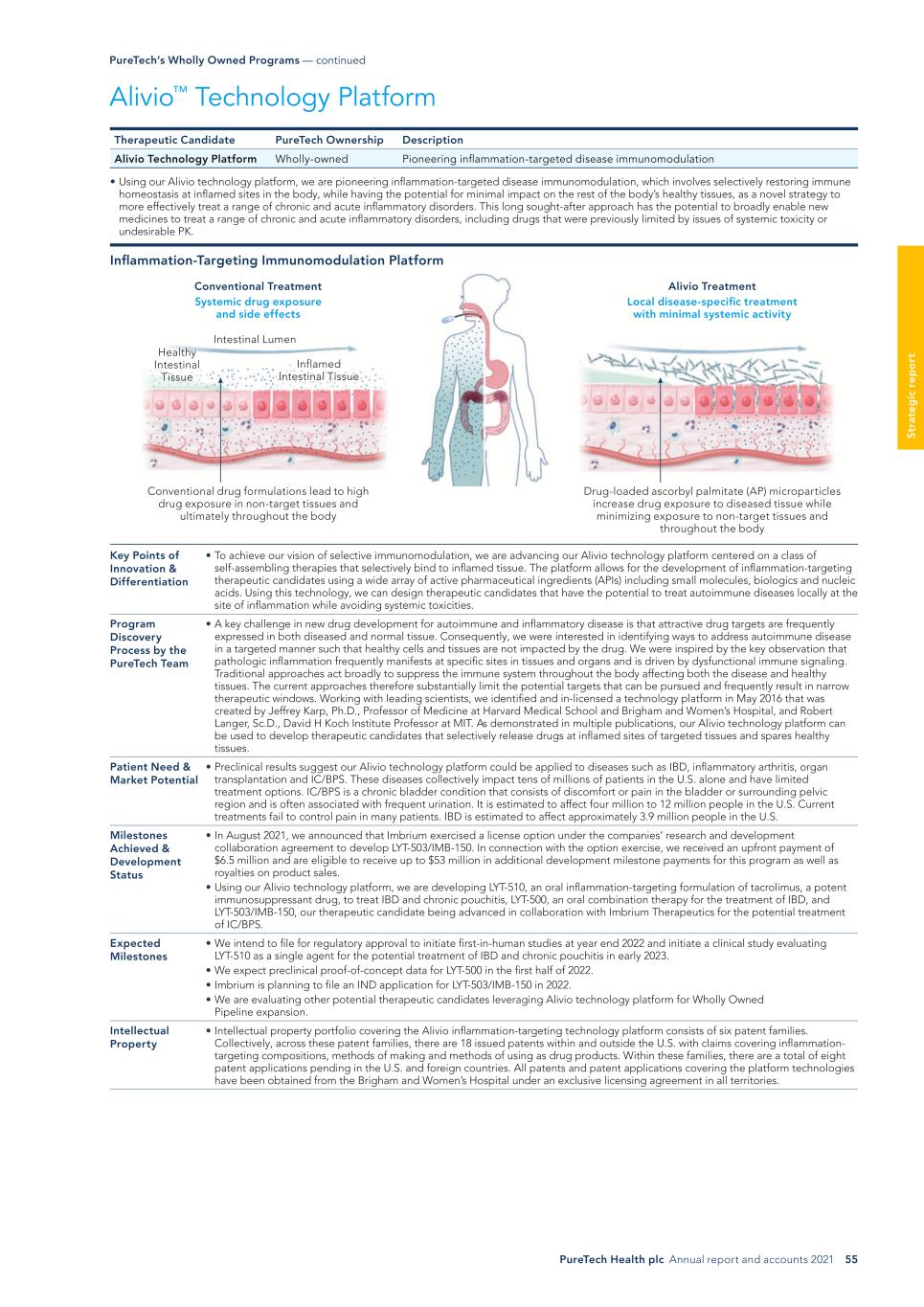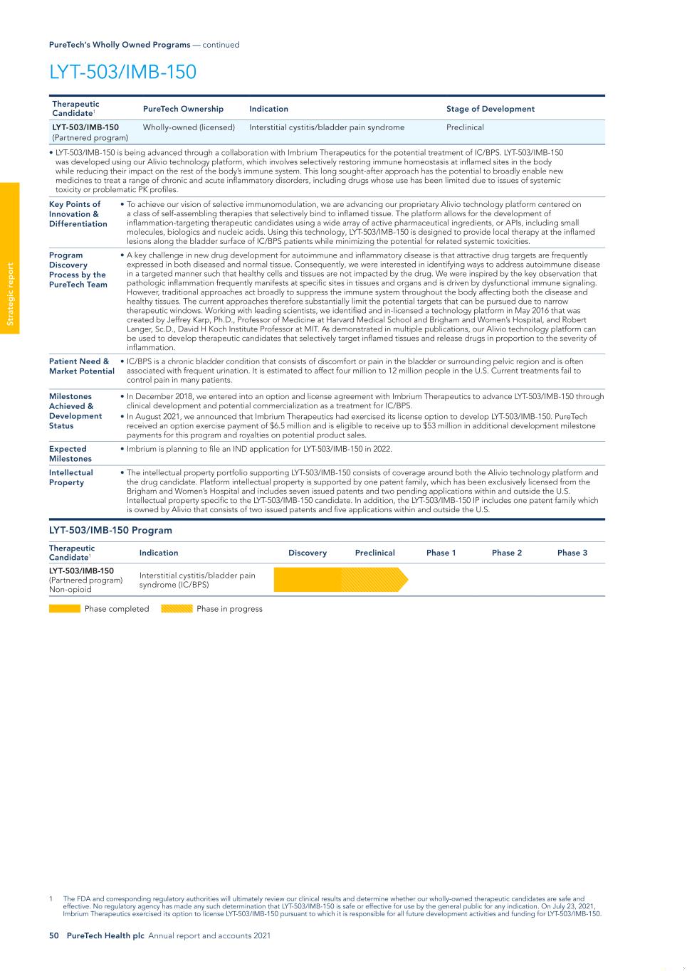 PureTech Health plc Annual report and accounts 2021 55 St ra te g ic r ep o rt Therapeutic Candidate PureTech Ownership Description Alivio Technology Platform Wholly-owned Pioneering inflammation-targeted disease immunomodulation • Using our Alivio technology platform, we are pioneering inflammation-targeted disease immunomodulation, which involves selectively restoring immune homeostasis at inflamed sites in the body, while having the potential for minimal impact on the rest of the body’s healthy tissues, as a novel strategy to more effectively treat a range of chronic and acute inflammatory disorders. This long sought-after approach has the potential to broadly enable new medicines to treat a range of chronic and acute inflammatory disorders, including drugs that were previously limited by issues of systemic toxicity or undesirable PK. Inflammation-Targeting Immunomodulation Platform Key Points of Innovation & Differentiation • To achieve our vision of selective immunomodulation, we are advancing our Alivio technology platform centered on a class of self-assembling therapies that selectively bind to inflamed tissue. The platform allows for the development of inflammation-targeting therapeutic candidates using a wide array of active pharmaceutical ingredients (APIs) including small molecules, biologics and nucleic acids. Using this technology, we can design therapeutic candidates that have the potential to treat autoimmune diseases locally at the site of inflammation while avoiding systemic toxicities. Program Discovery Process by the PureTech Team • A key challenge in new drug development for autoimmune and inflammatory disease is that attractive drug targets are frequently expressed in both diseased and normal tissue. Consequently, we were interested in identifying ways to address autoimmune disease in a targeted manner such that healthy cells and tissues are not impacted by the drug. We were inspired by the key observation that pathologic inflammation frequently manifests at specific sites in tissues and organs and is driven by dysfunctional immune signaling. Traditional approaches act broadly to suppress the immune system throughout the body affecting both the disease and healthy tissues. The current approaches therefore substantially limit the potential targets that can be pursued and frequently result in narrow therapeutic windows. Working with leading scientists, we identified and in-licensed a technology platform in May 2016 that was created by Jeffrey Karp, Ph.D., Professor of Medicine at Harvard Medical School and Brigham and Women’s Hospital, and Robert Langer, Sc.D., David H Koch Institute Professor at MIT. As demonstrated in multiple publications, our Alivio technology platform can be used to develop therapeutic candidates that selectively release drugs at inflamed sites of targeted tissues and spares healthy tissues. Patient Need & Market Potential • Preclinical results suggest our Alivio technology platform could be applied to diseases such as IBD, inflammatory arthritis, organ transplantation and IC/BPS. These diseases collectively impact tens of millions of patients in the U.S. alone and have limited treatment options. IC/BPS is a chronic bladder condition that consists of discomfort or pain in the bladder or surrounding pelvic region and is often associated with frequent urination. It is estimated to affect four million to 12 million people in the U.S. Current treatments fail to control pain in many patients. IBD is estimated to affect approximately 3.9 million people in the U.S. Milestones Achieved & Development Status • In August 2021, we announced that Imbrium exercised a license option under the companies’ research and development collaboration agreement to develop LYT-503/IMB-150. In connection with the option exercise, we received an upfront payment of $6.5 million and are eligible to receive up to $53 million in additional development milestone payments for this program as well as royalties on product sales. • Using our Alivio technology platform, we are developing LYT-510, an oral inflammation-targeting formulation of tacrolimus, a potent immunosuppressant drug, to treat IBD and chronic pouchitis, LYT-500, an oral combination therapy for the treatment of IBD, and LYT-503/IMB-150, our therapeutic candidate being advanced in collaboration with Imbrium Therapeutics for the potential treatment of IC/BPS. Expected Milestones • We intend to file for regulatory approval to initiate first-in-human studies at year end 2022 and initiate a clinical study evaluating LYT-510 as a single agent for the potential treatment of IBD and chronic pouchitis in early 2023. • We expect preclinical proof-of-concept data for LYT-500 in the first half of 2022. • Imbrium is planning to file an IND application for LYT-503/IMB-150 in 2022. • We are evaluating other potential therapeutic candidates leveraging Alivio technology platform for Wholly Owned Pipeline expansion. Intellectual Property • Intellectual property portfolio covering the Alivio inflammation-targeting technology platform consists of six patent families. Collectively, across these patent families, there are 18 issued patents within and outside the U.S. with claims covering inflammation- targeting compositions, methods of making and methods of using as drug products. Within these families, there are a total of eight patent applications pending in the U.S. and foreign countries. All patents and patent applications covering the platform technologies have been obtained from the Brigham and Women’s Hospital under an exclusive licensing agreement in all territories. PureTech’s Wholly Owned Programs — continued Alivio™ Technology Platform